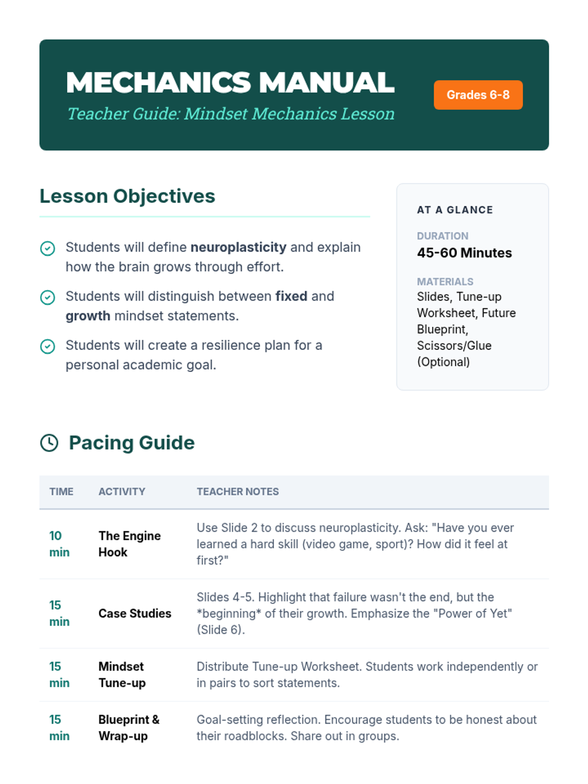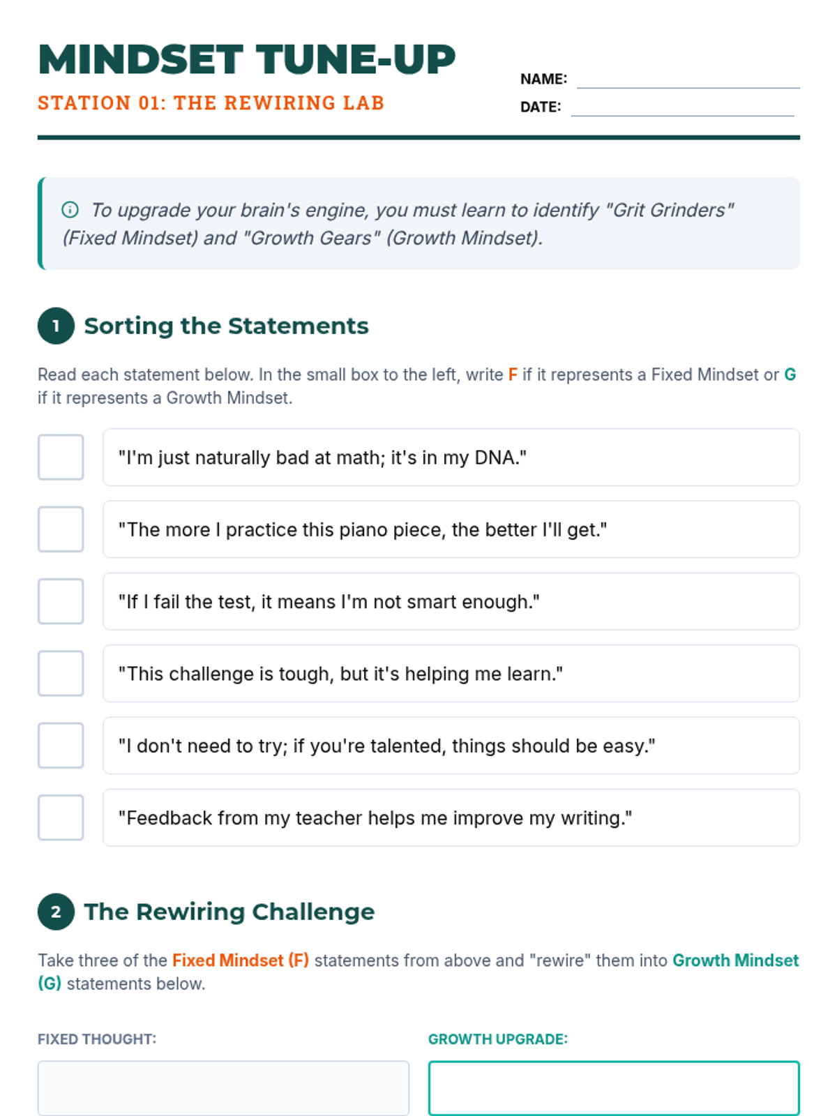 A dynamic lesson for middle schoolers to explore the science of growth mindset and build academic resilience through real-world stories and interactive reflections.