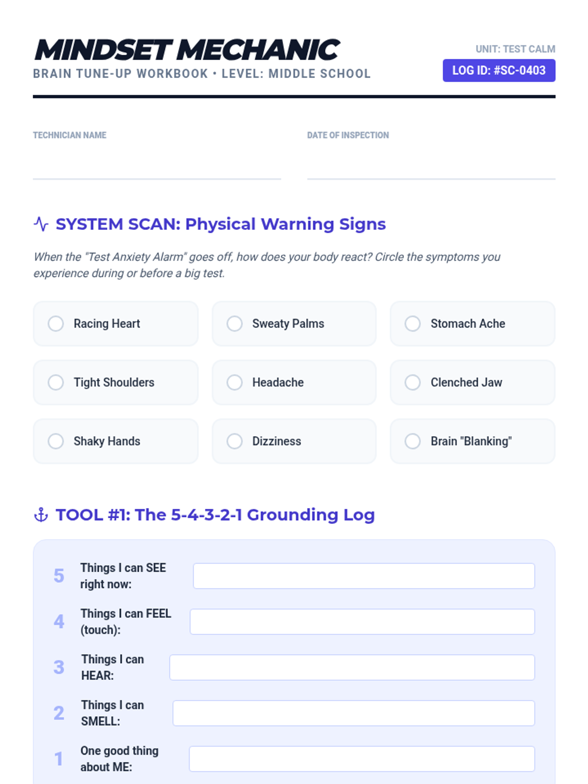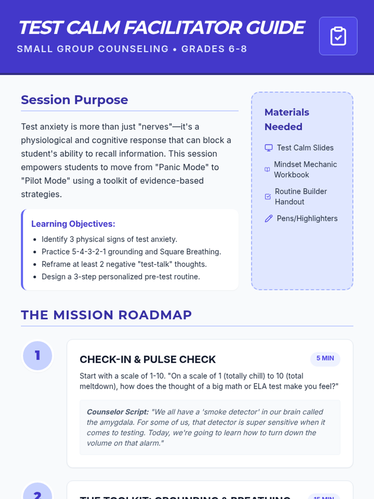 A comprehensive small-group counseling lesson for middle schoolers to understand test anxiety and master stress-management tools like breathing, grounding, and cognitive reframing.