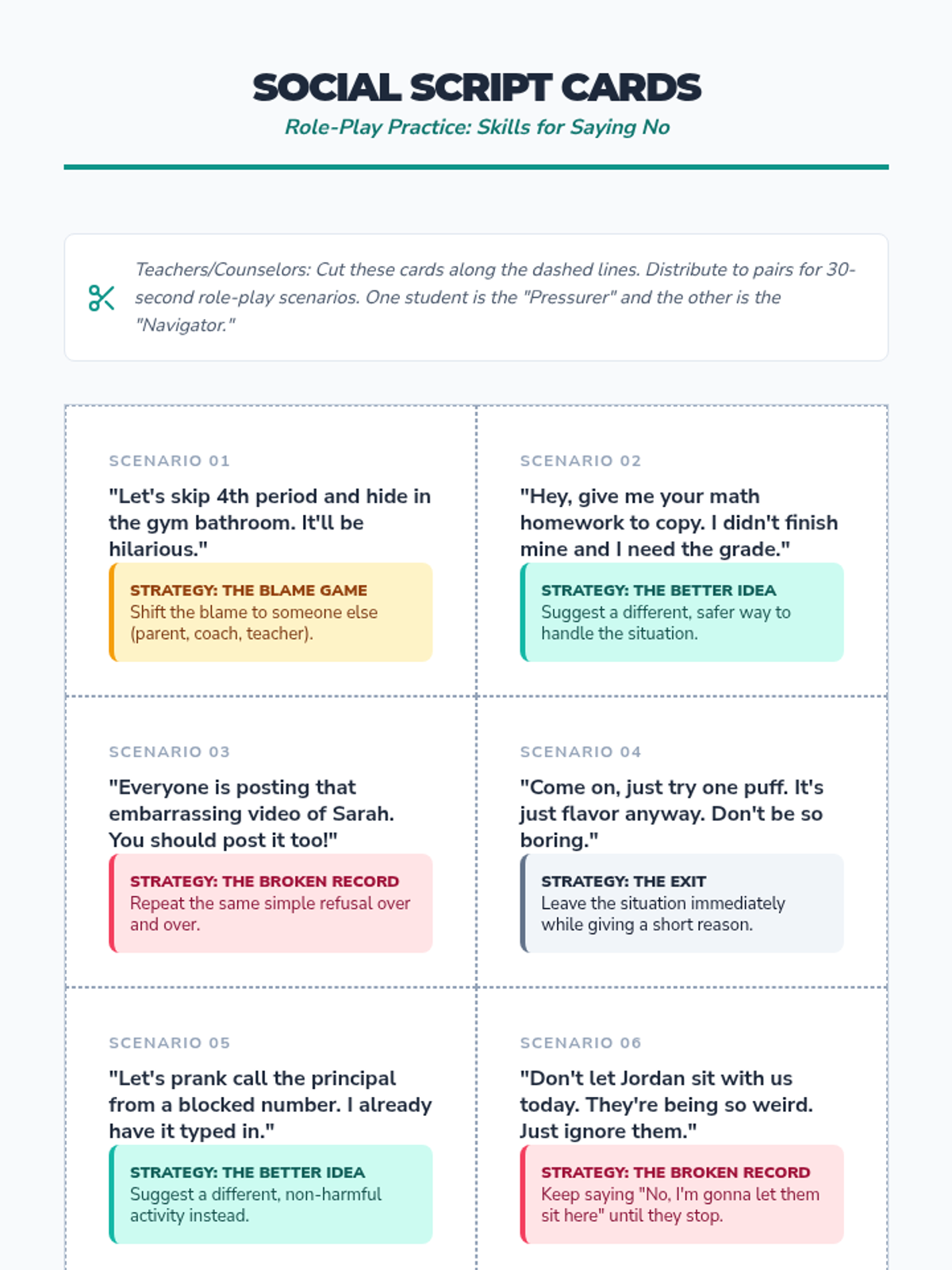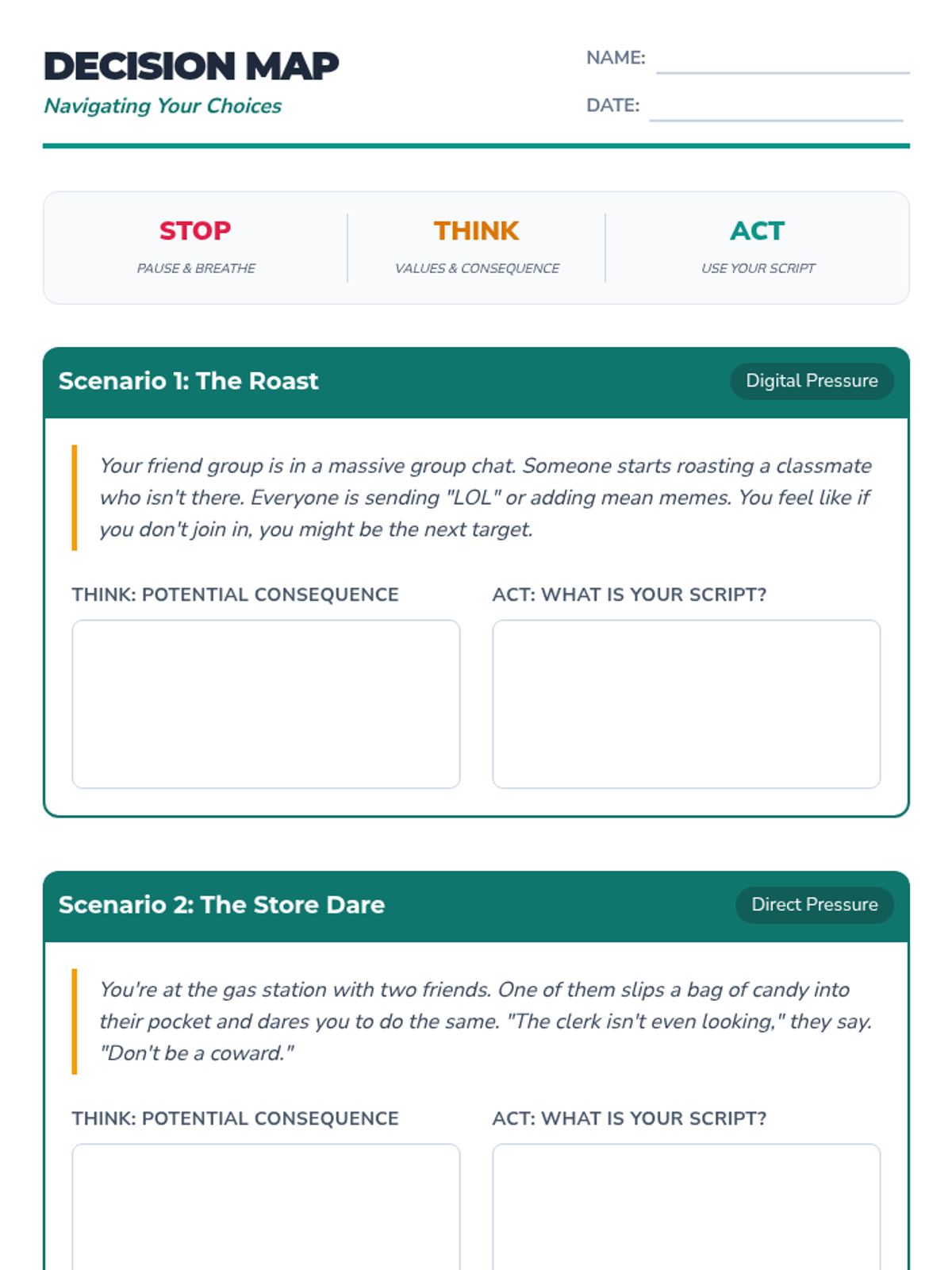 A comprehensive counseling lesson for middle schoolers focusing on navigating complex social dynamics, identifying peer pressure, and using a decision-making framework to set healthy boundaries.