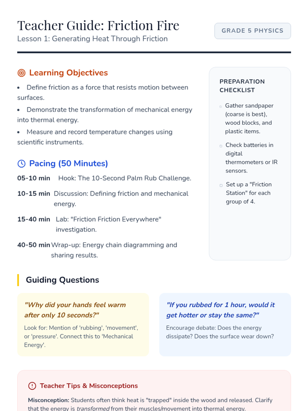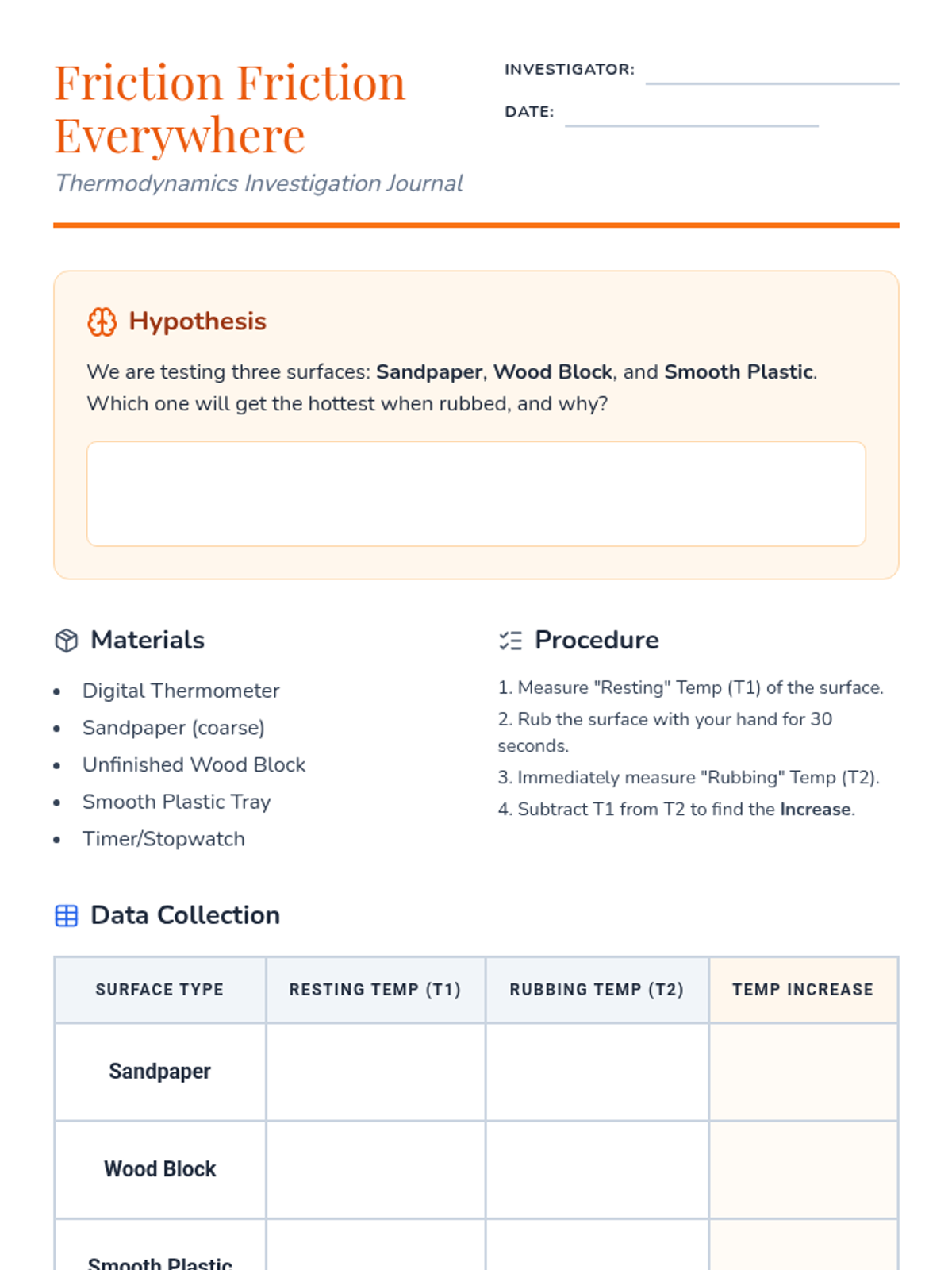 Students experiment with friction by rubbing various surfaces together and measuring the temperature rise, exploring the transformation of mechanical energy into thermal energy.