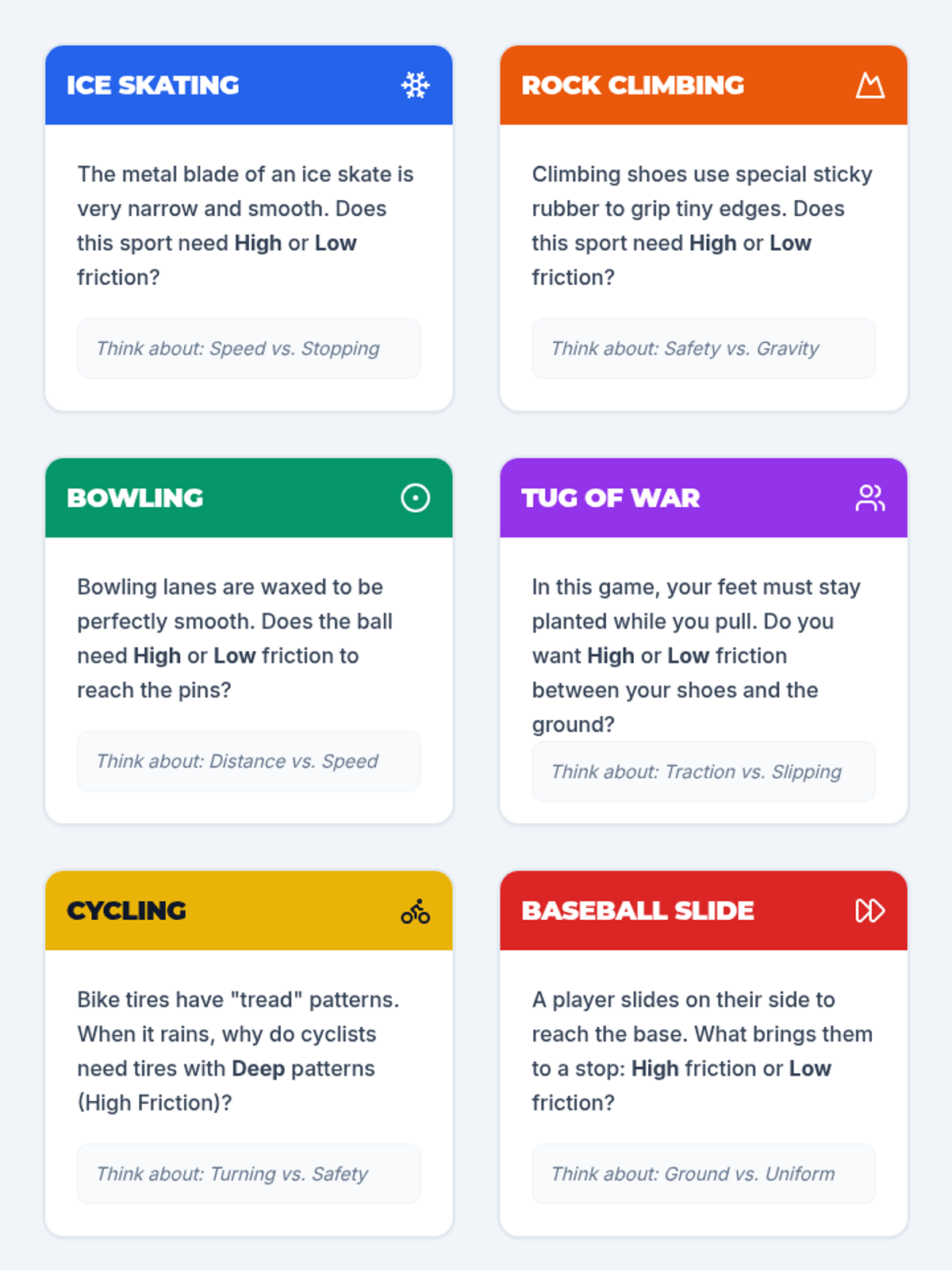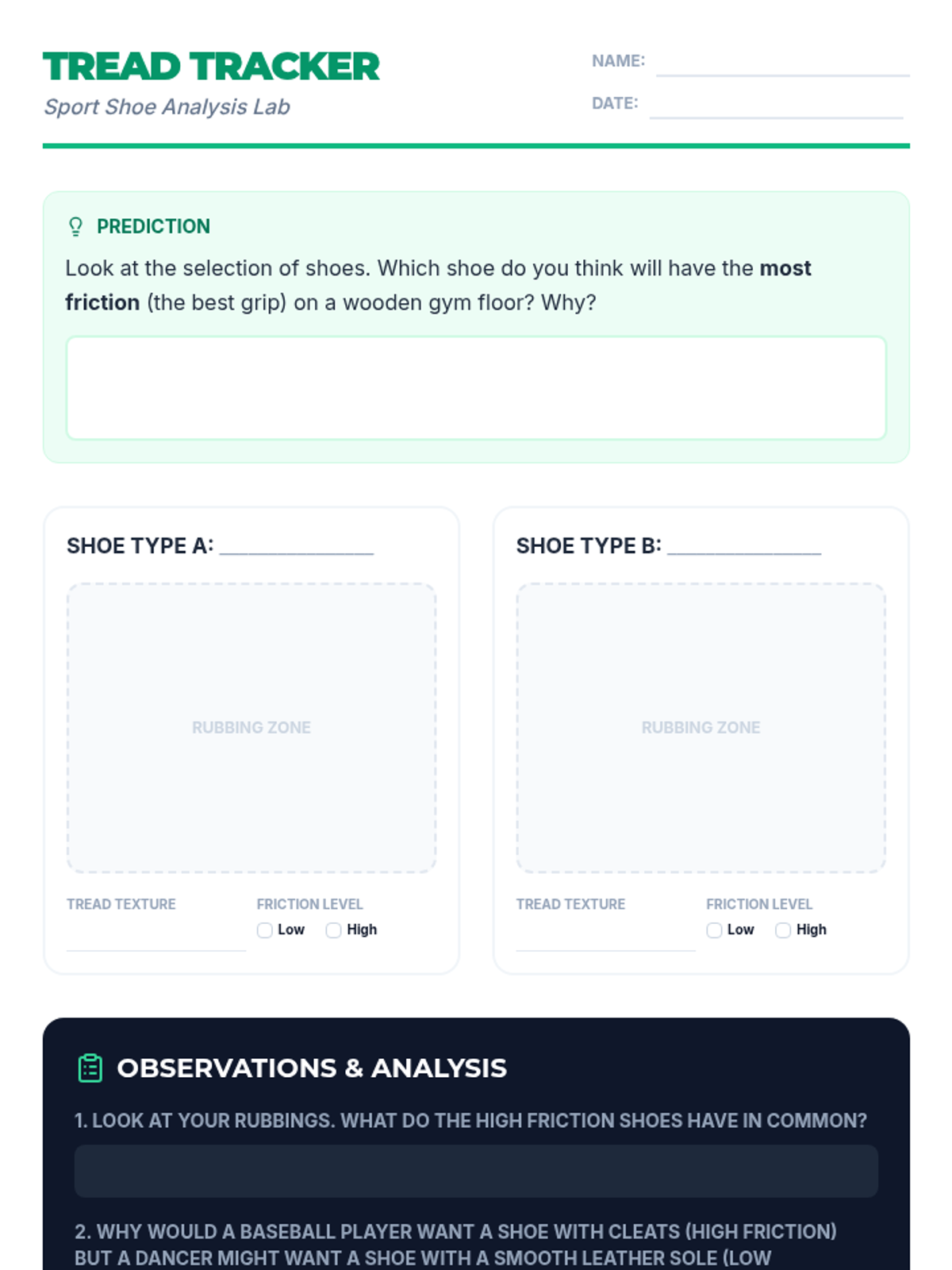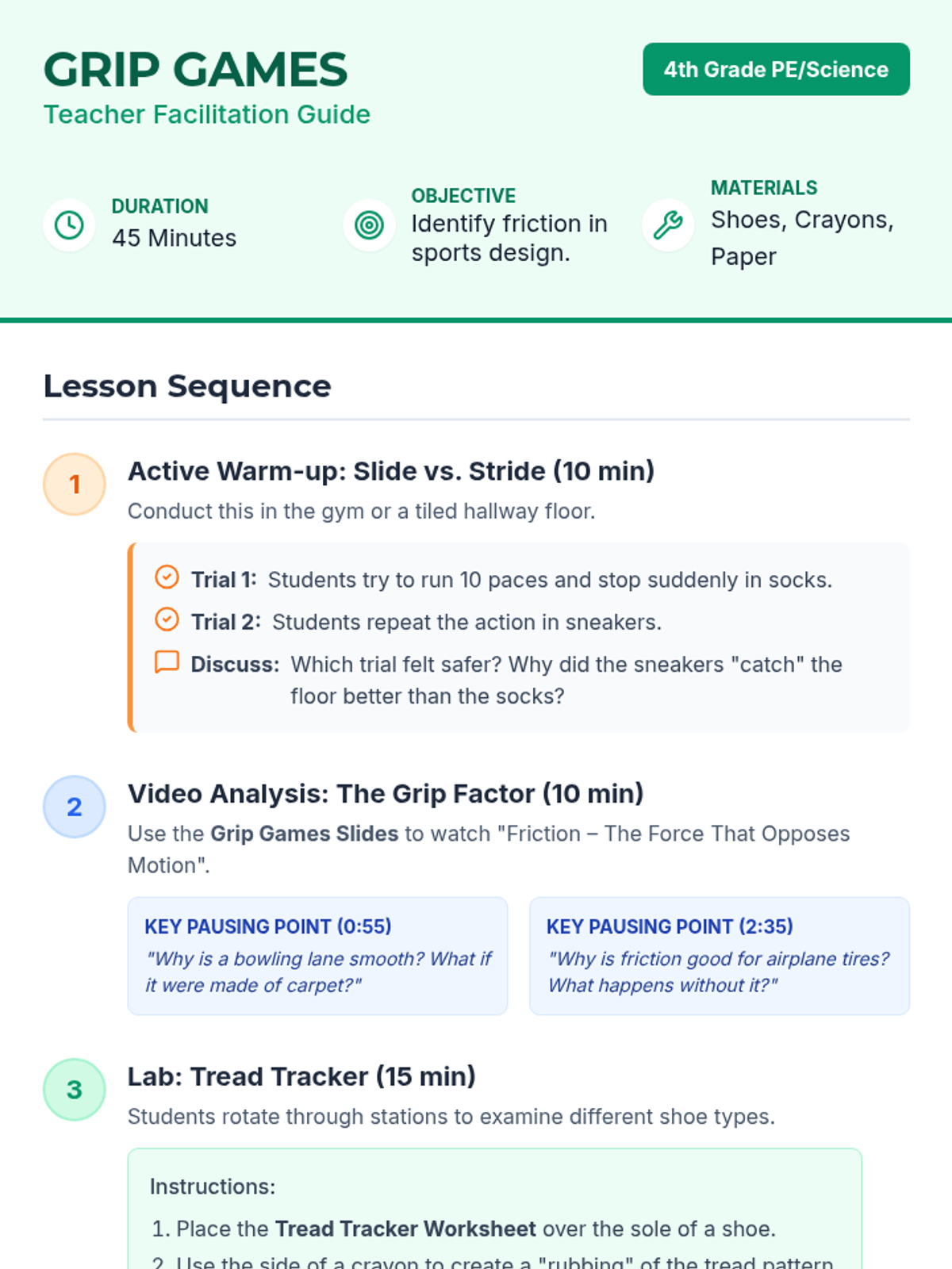 A 4th-grade PE and Science integration lesson exploring how sports equipment is designed to manage friction through hands-on shoe analysis and video observation.