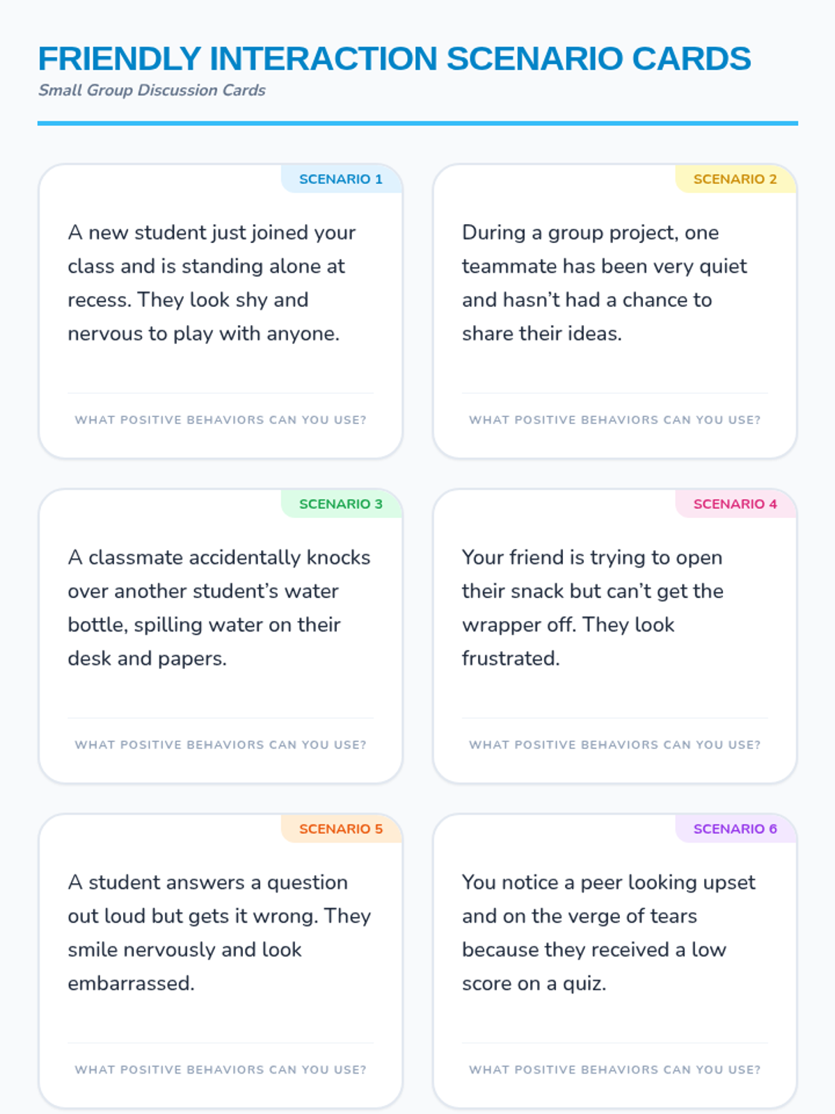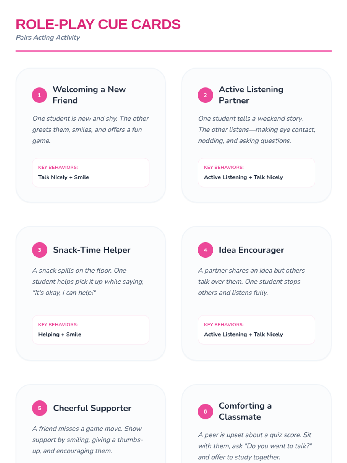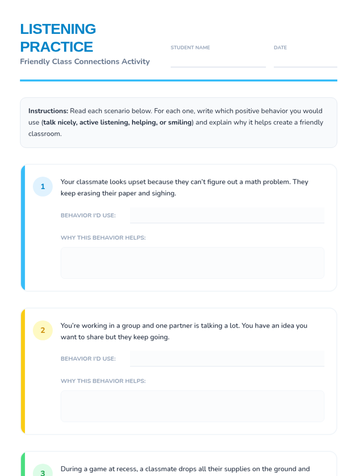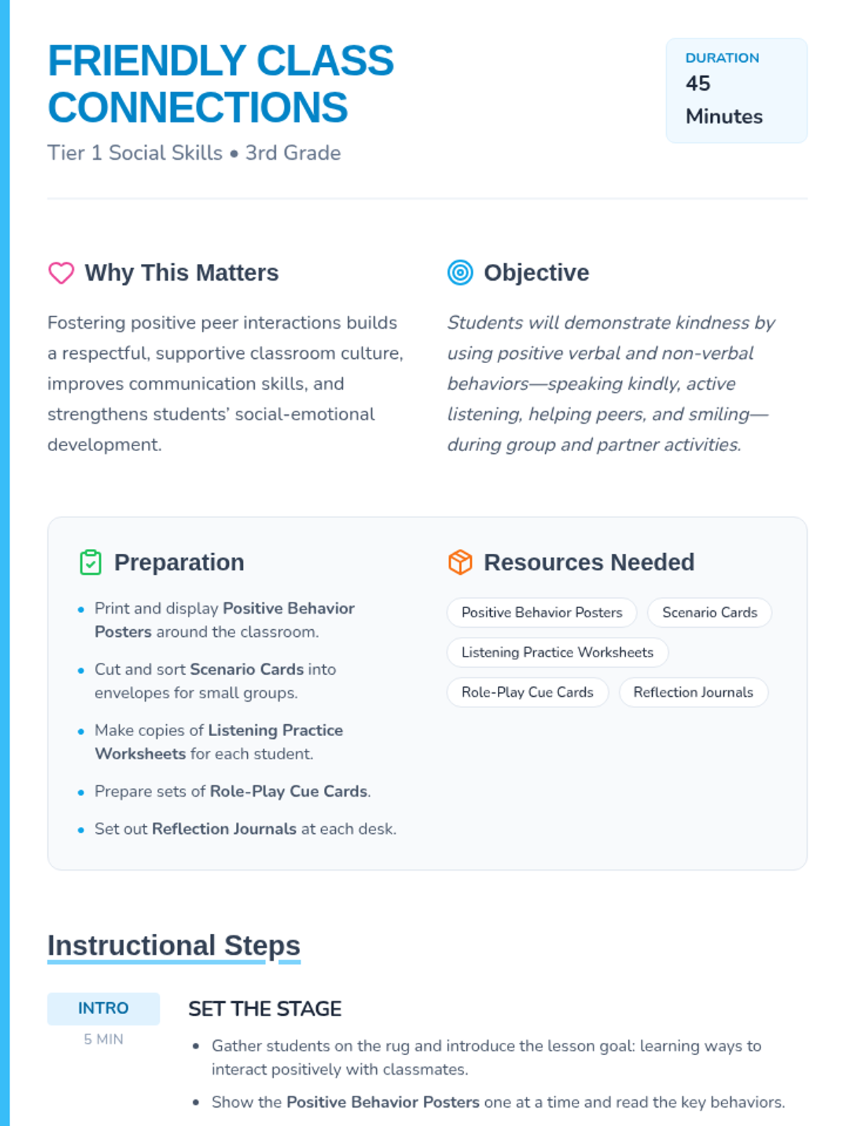 In this 45-minute Tier 1 lesson for 3rd graders, students learn and practice positive verbal and non-verbal behaviors—like talking kindly, active listening, helping others, and smiling—to build supportive peer interactions.