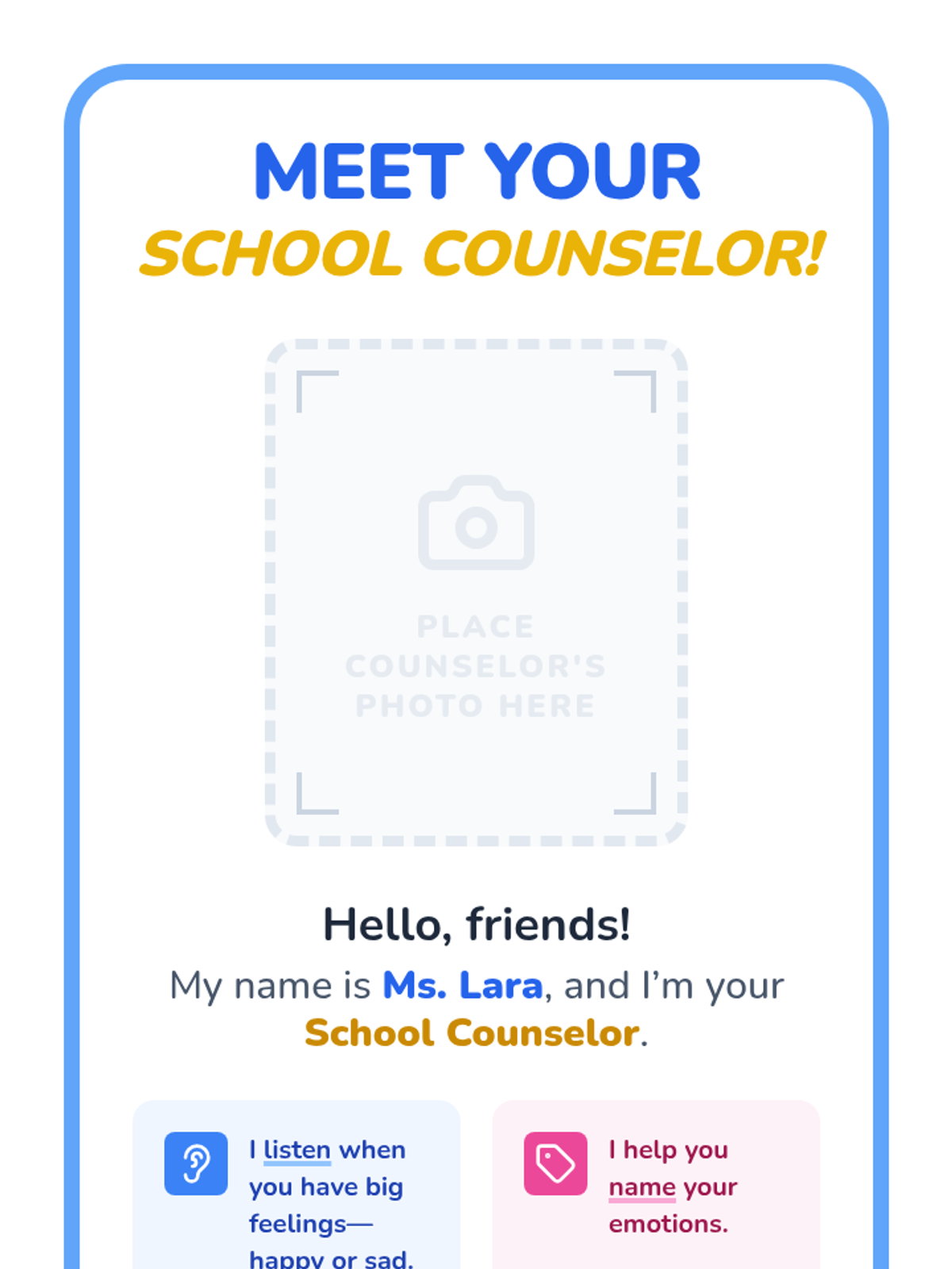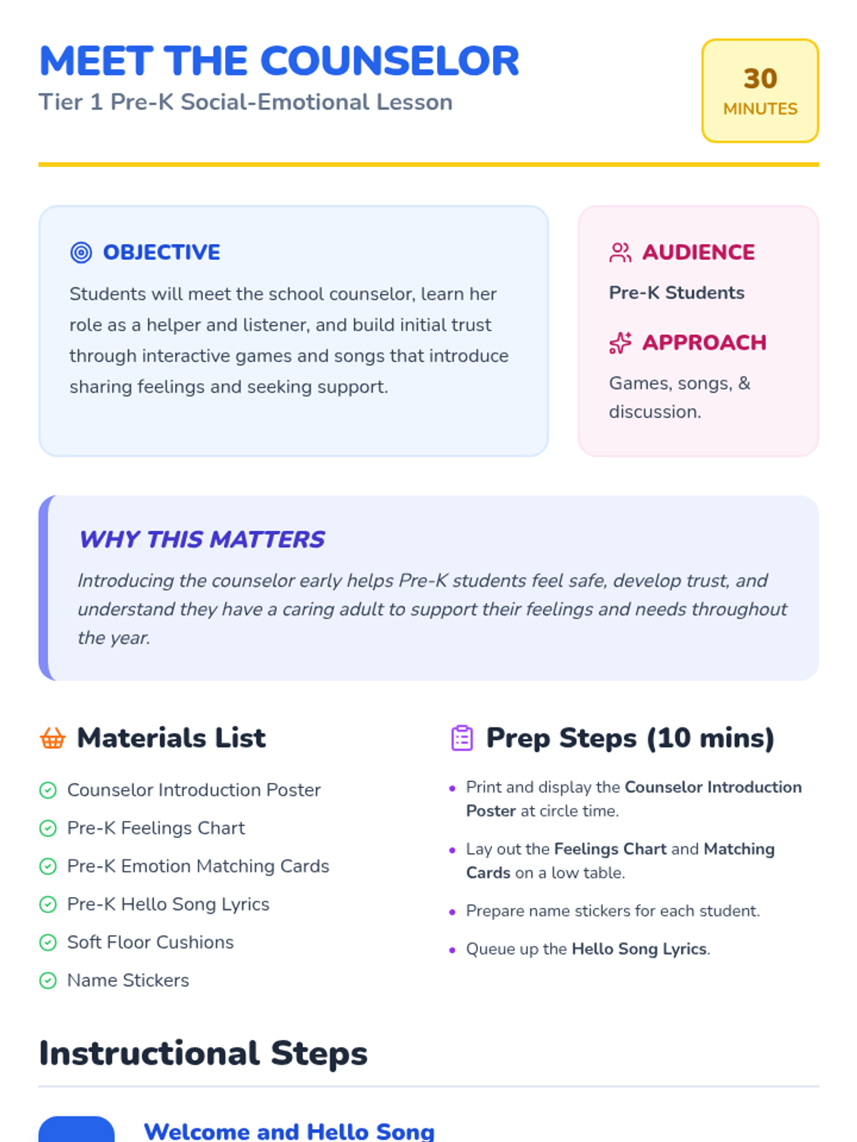 A 30-minute Tier 1 Pre-K lesson designed to introduce the school counselor, explain their role as a helper, and build trust through interactive games and songs. Students will learn to recognize basic emotions and understand that the counselor is a safe adult they can talk to.