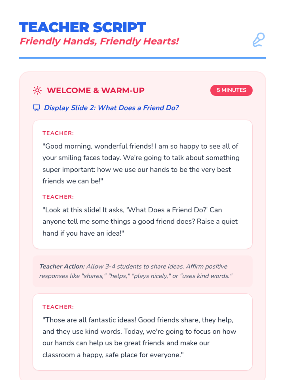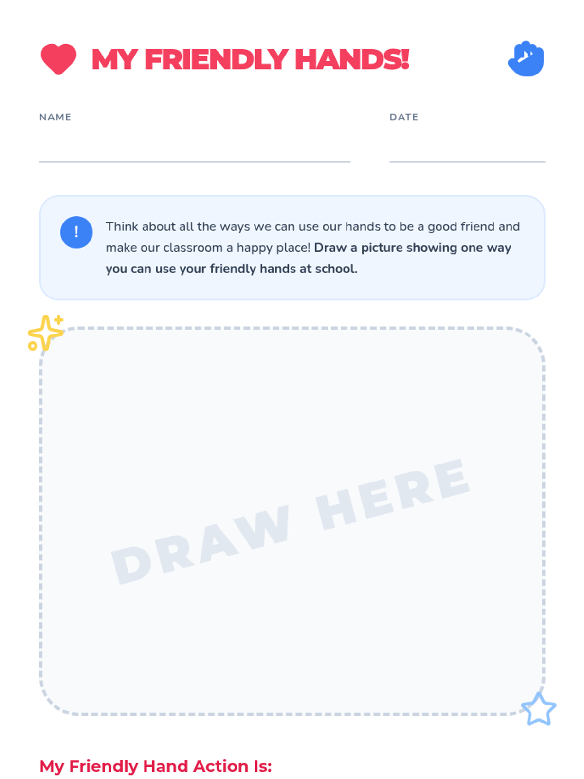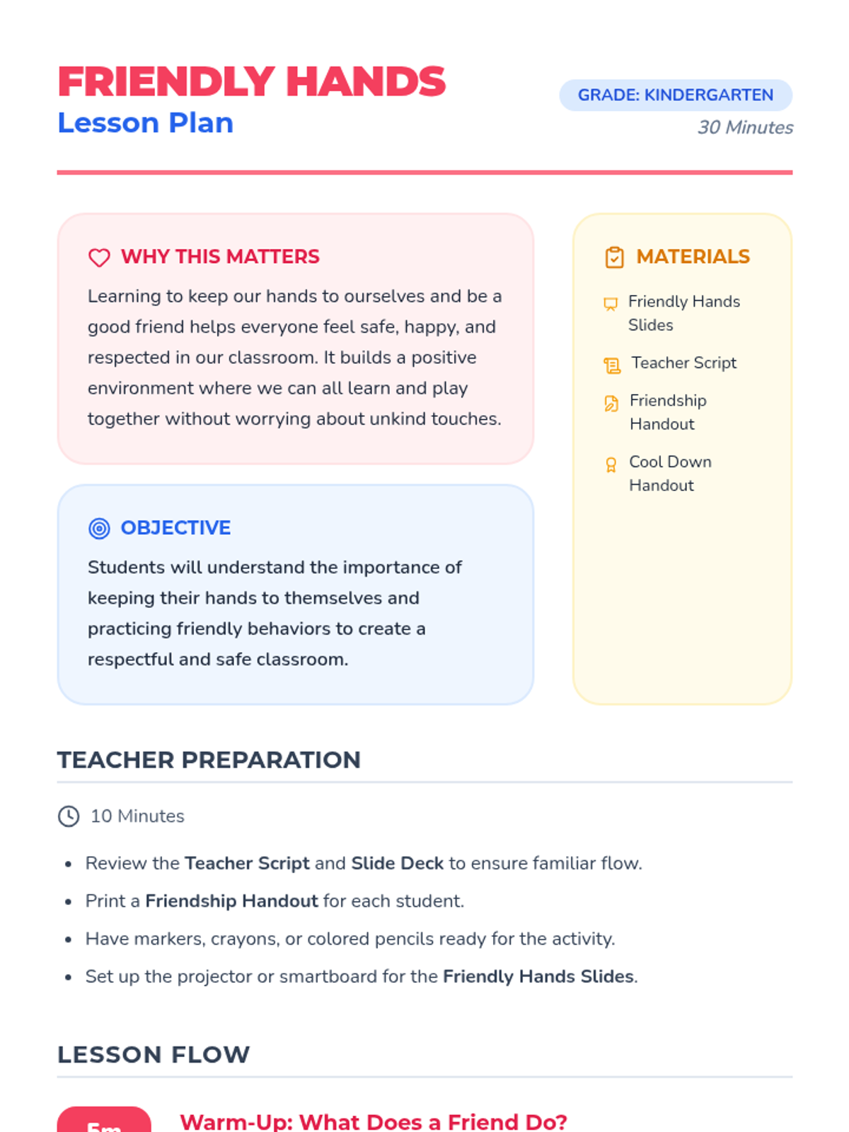 This lesson helps Kindergarten students understand the importance of keeping their hands to themselves and practicing friendly behaviors. By focusing on respect and personal space, students will learn to create a safe and happy classroom environment for everyone.