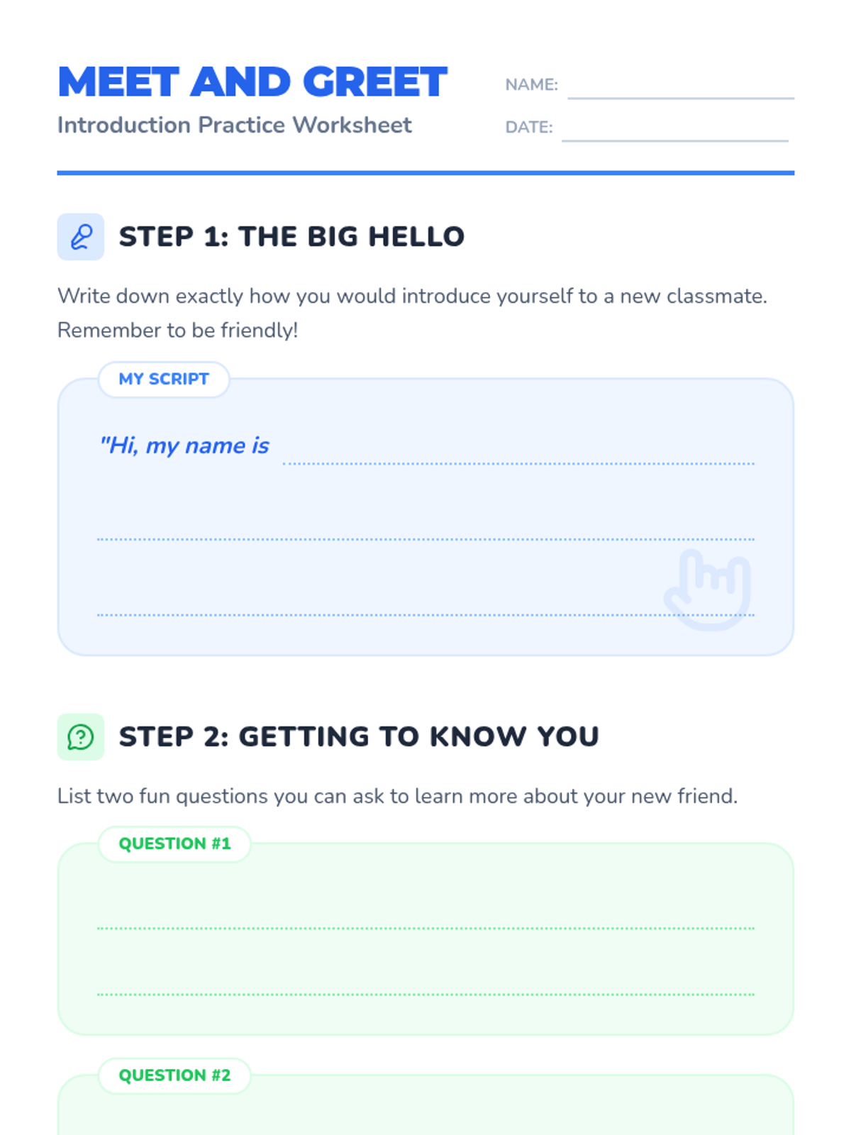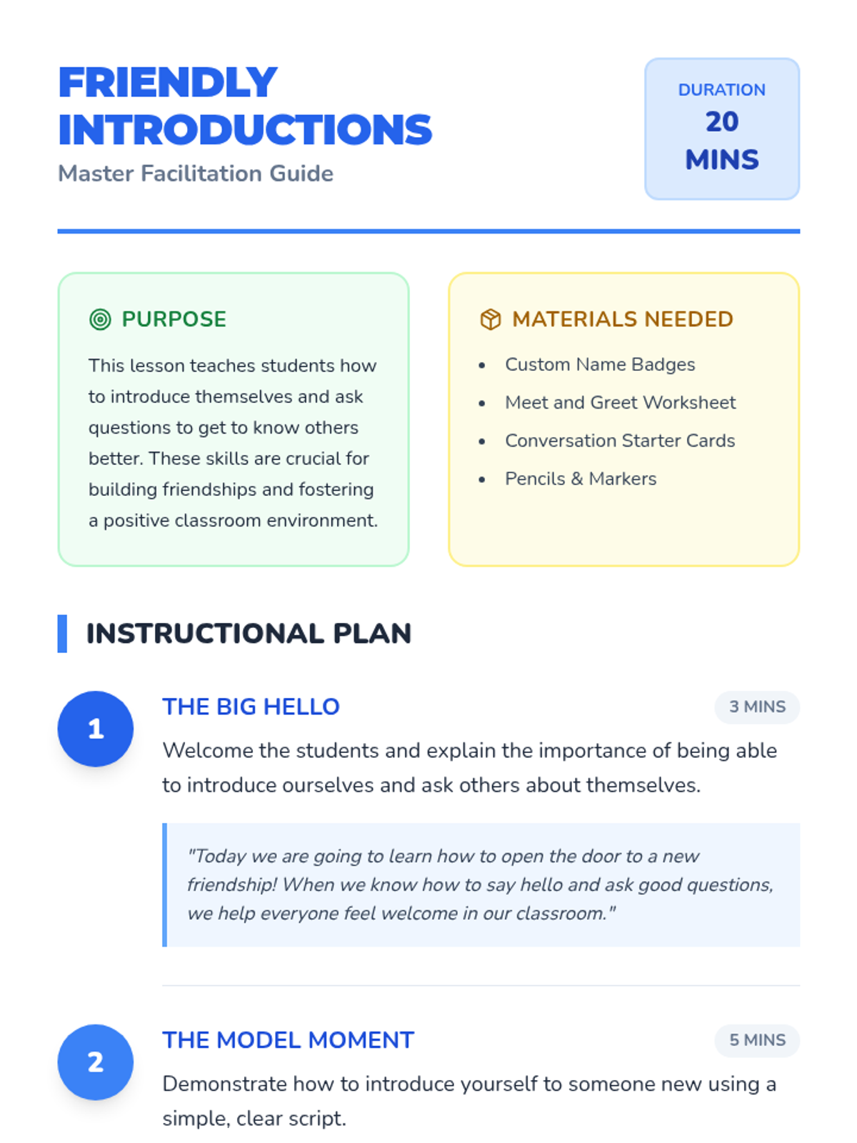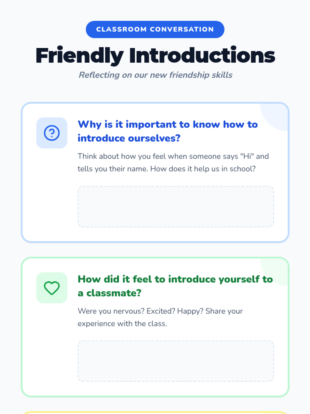 A foundational lesson for 2nd graders focused on the social skills of introducing oneself and asking engaging questions to build new friendships.