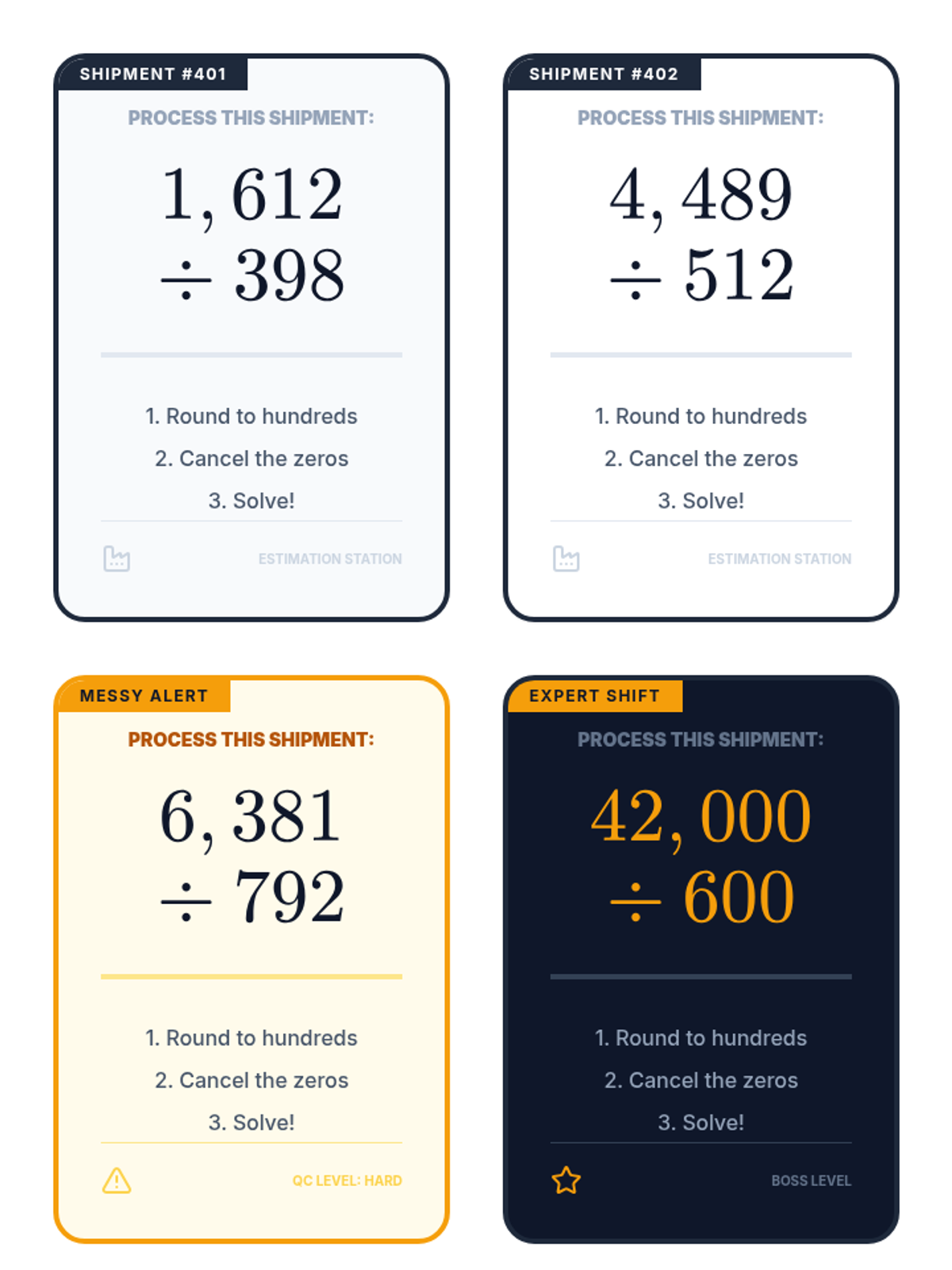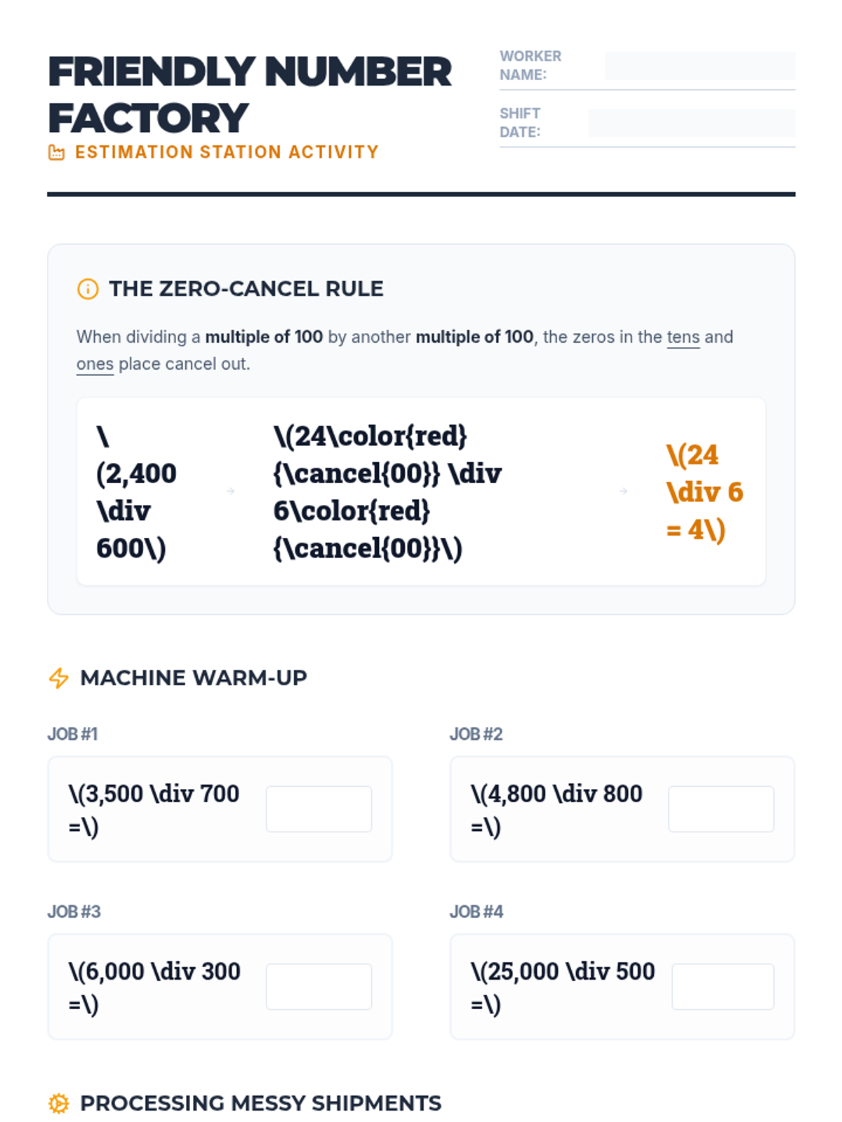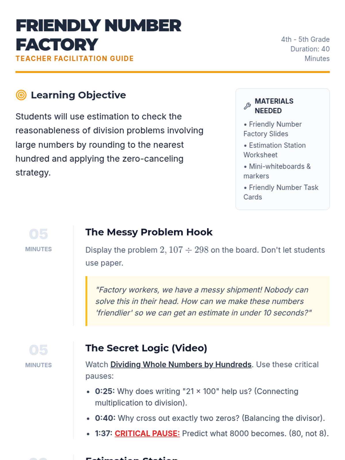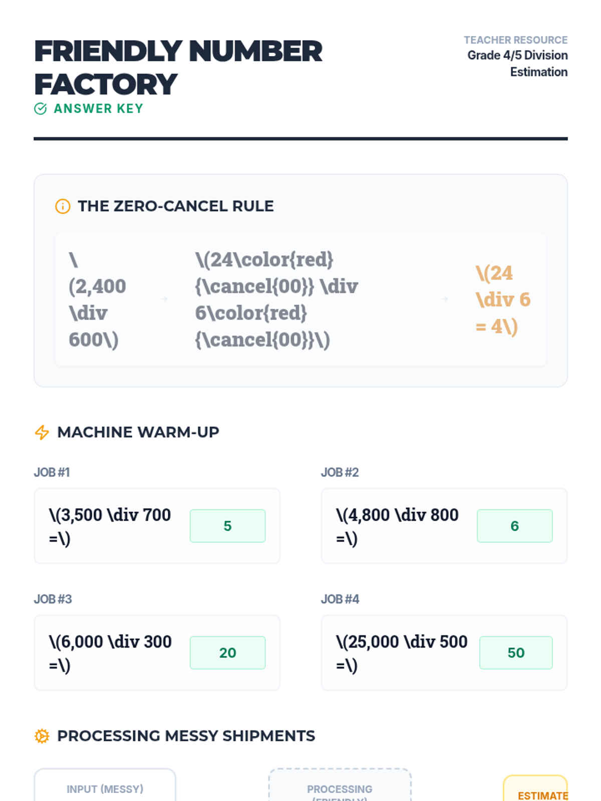 Students learn to simplify complex division problems by rounding messy numbers to 'friendly' multiples of 100, then applying the zero-canceling strategy to estimate quotients.
