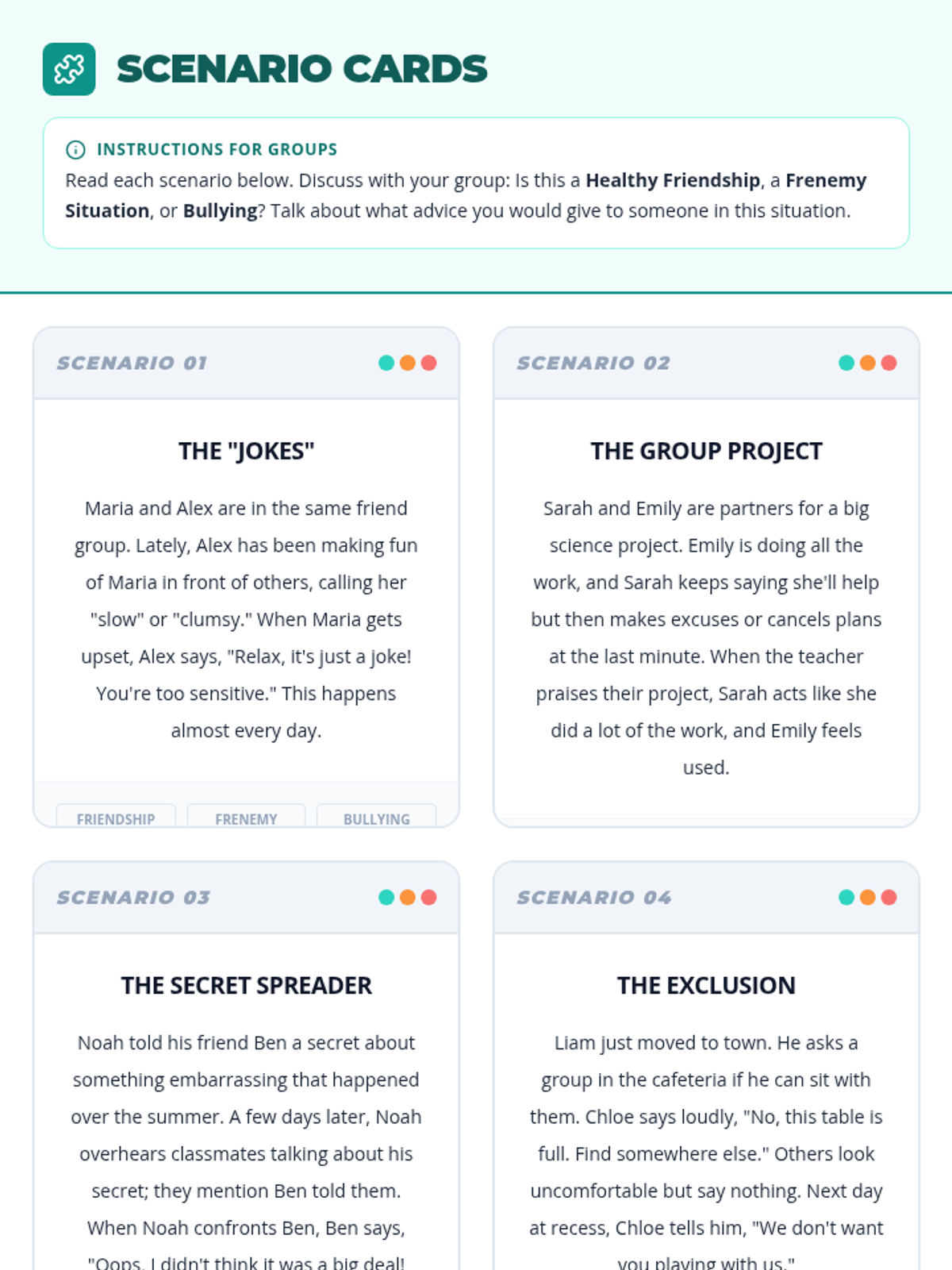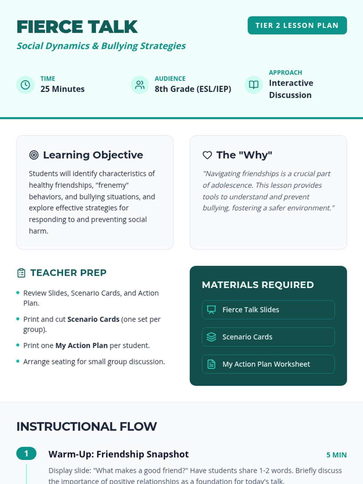A 25-minute Tier 2 'lunch bunch' lesson for 8th-grade students to explore friendship dynamics, frenemies, and bullying strategies.