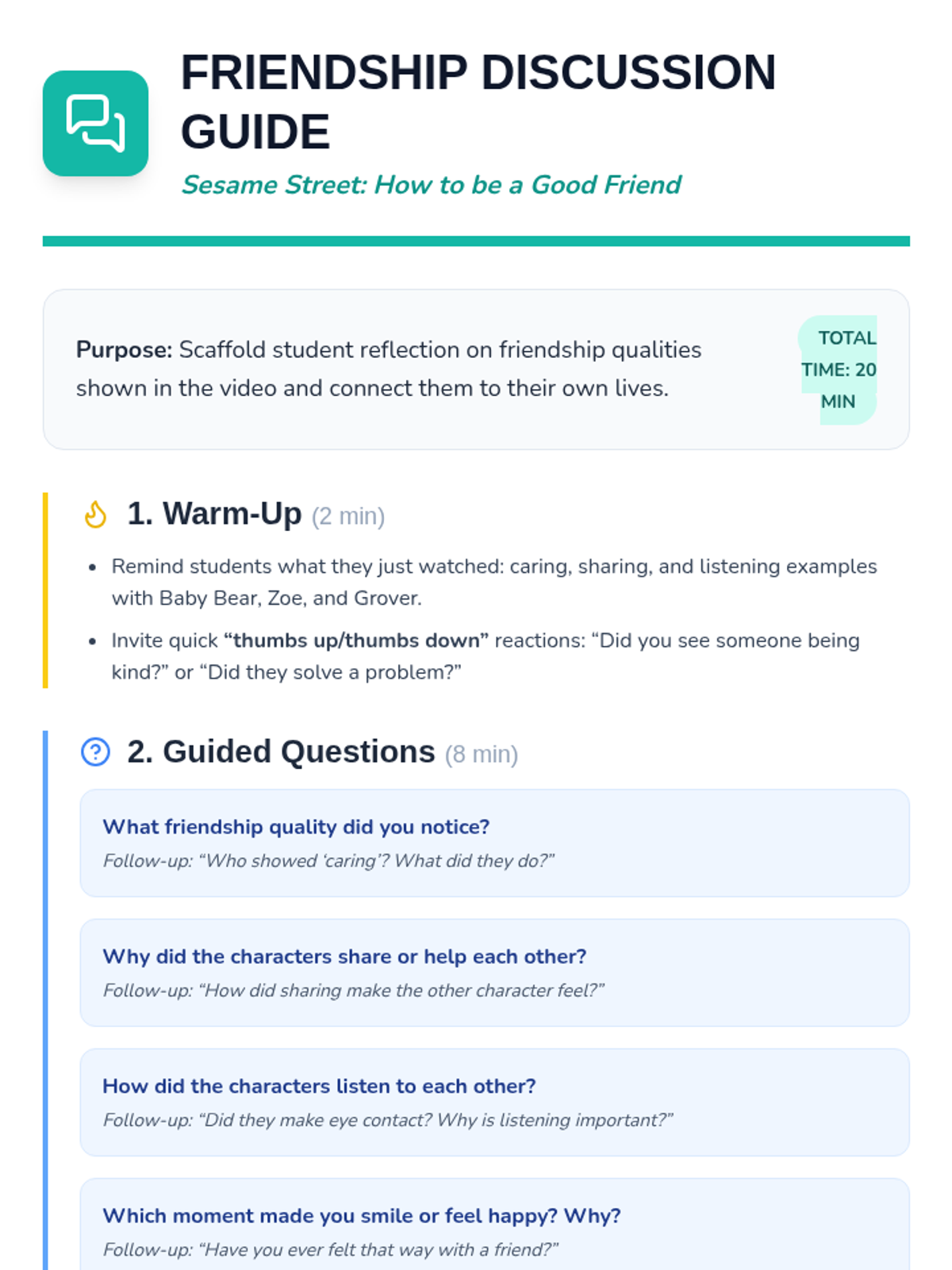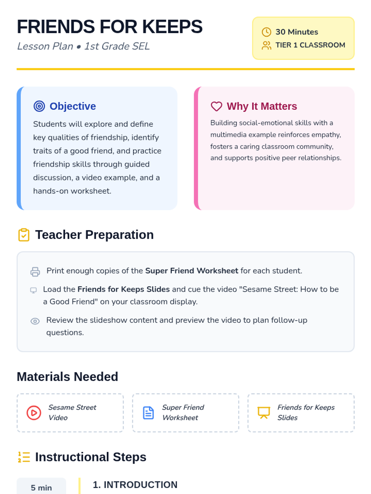 A 30-minute lesson for 1st graders to explore the qualities of a good friend, featuring a Sesame Street video, group discussion, and a creative drawing activity.