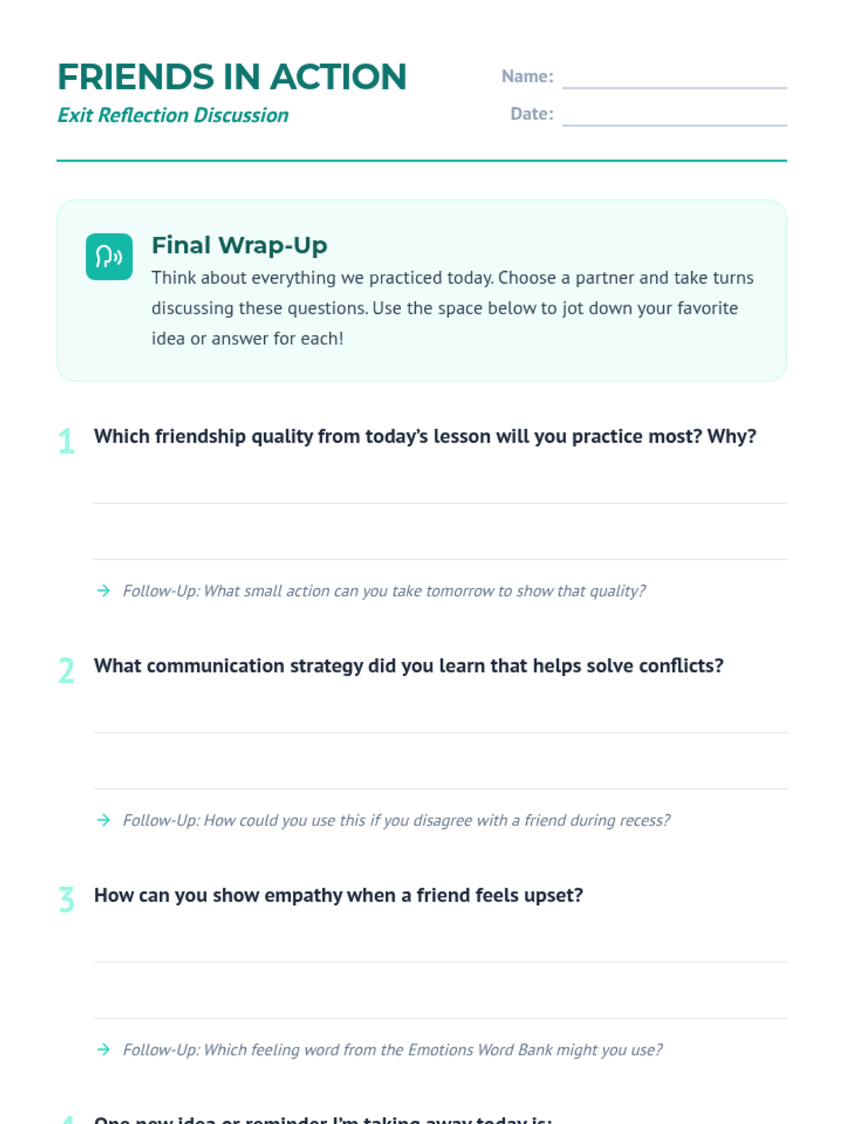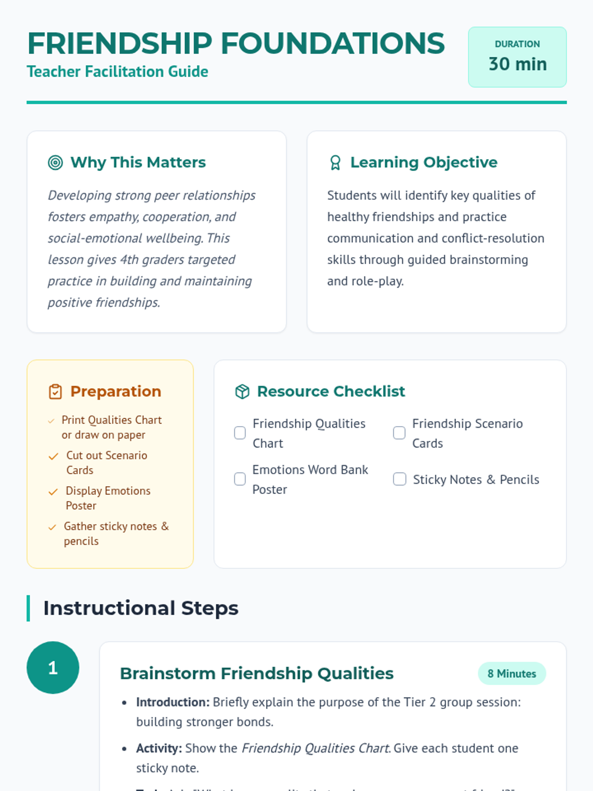 A targeted 30-minute Tier 2 group lesson for 4th graders to explore healthy friendship qualities, practice communication skills, and develop conflict-resolution strategies.