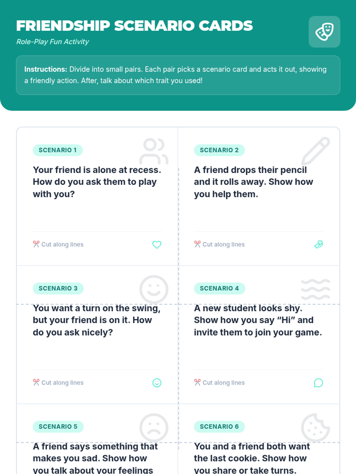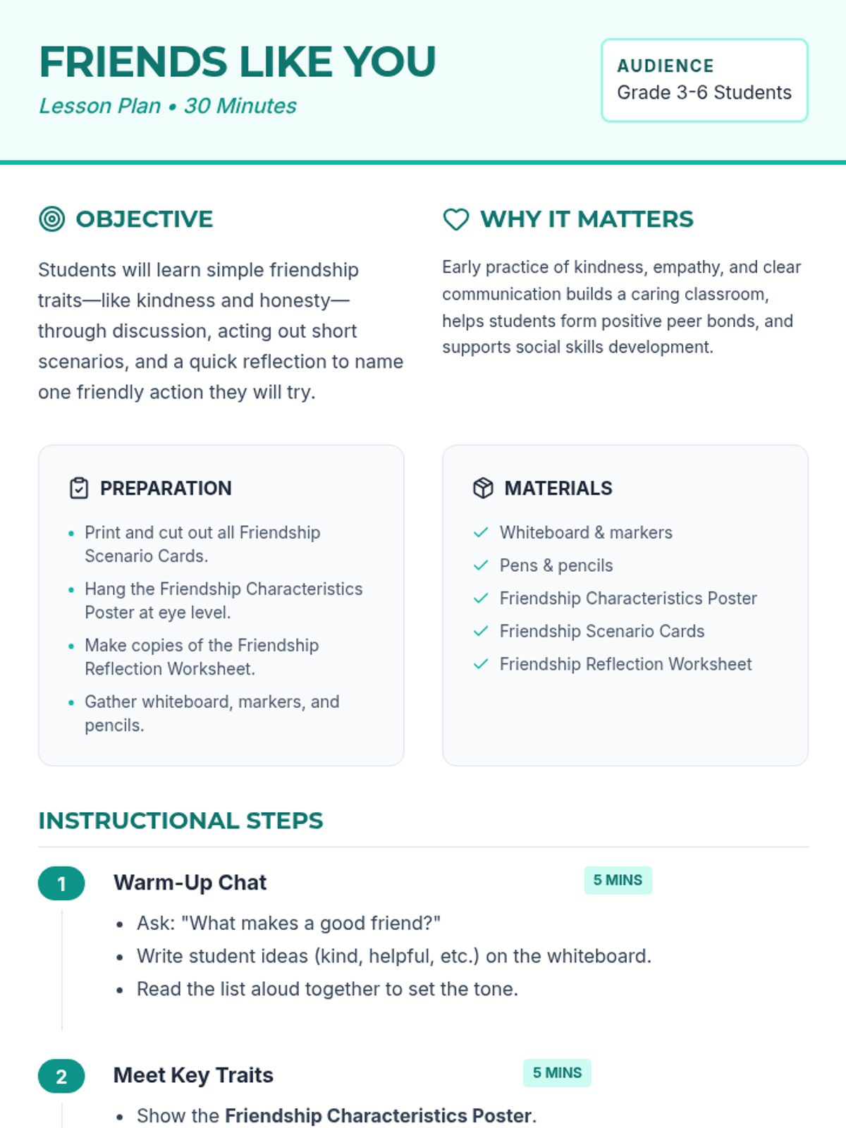 A 30-minute social-emotional learning lesson where students define friendship traits, practice social scenarios through role-play, and reflect on their own friendly actions.