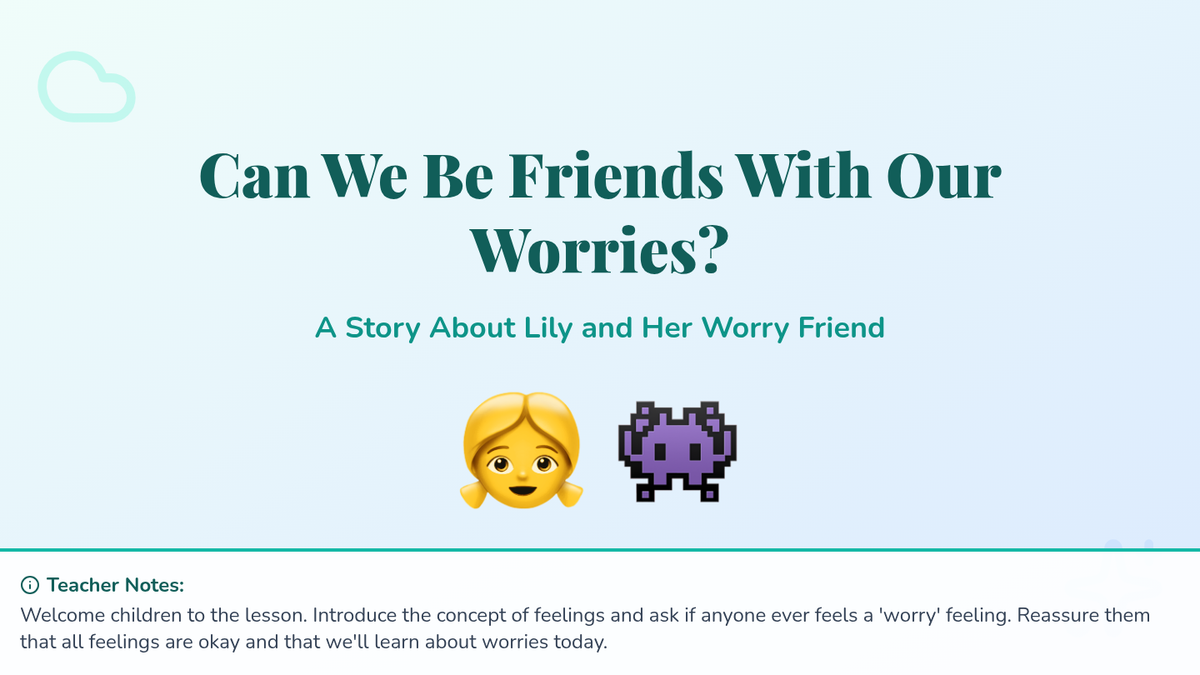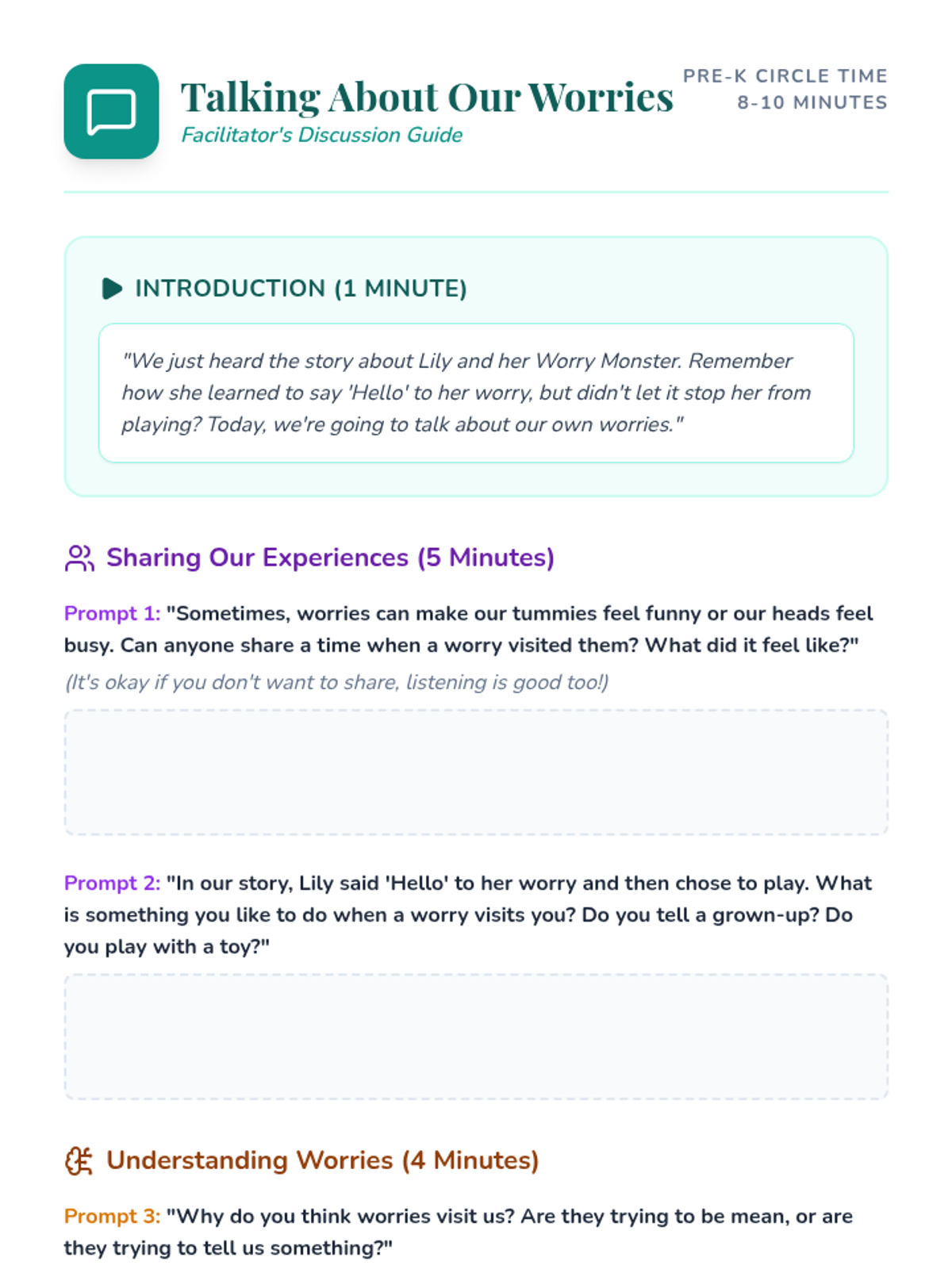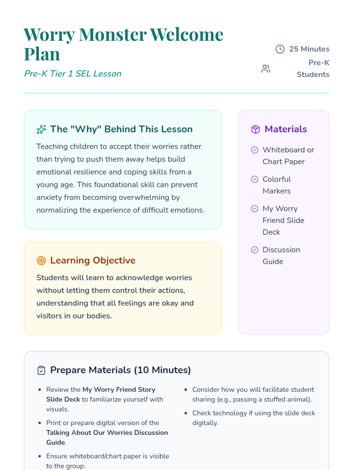 A gentle social-emotional learning lesson for Pre-K students that teaches acceptance by framing worries as 'Worry Monsters' that can be acknowledged without taking control.