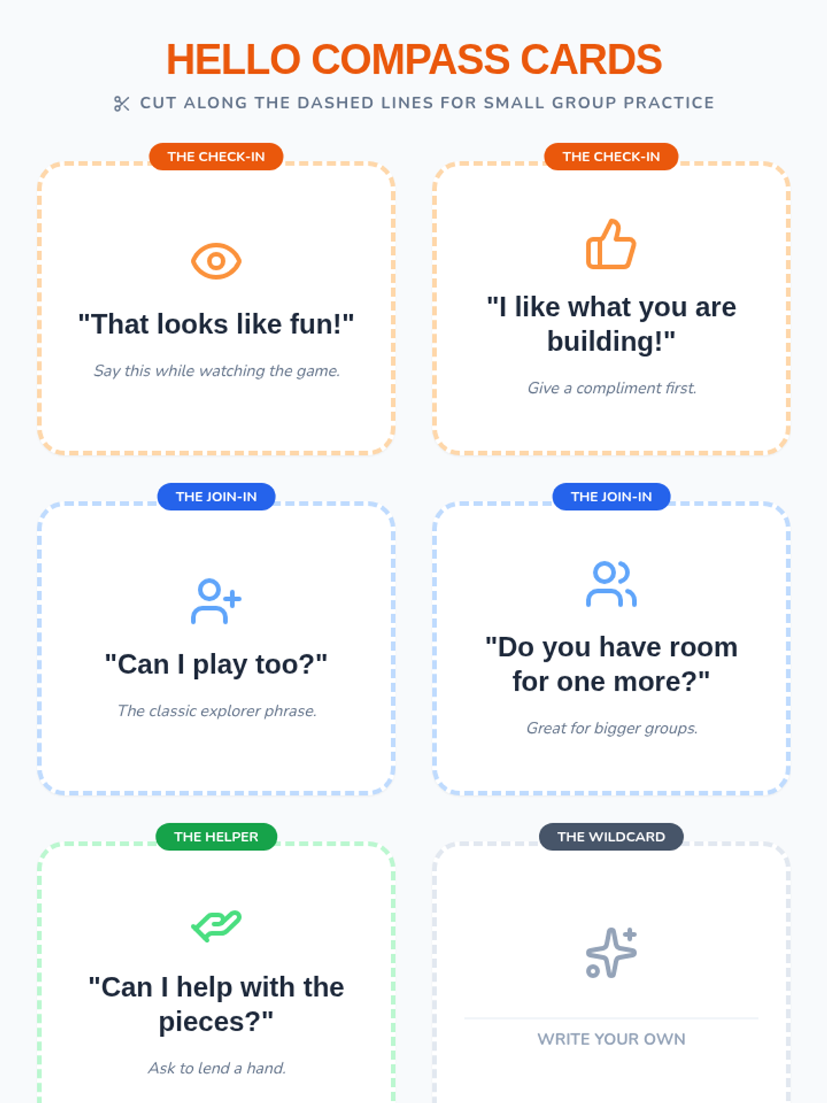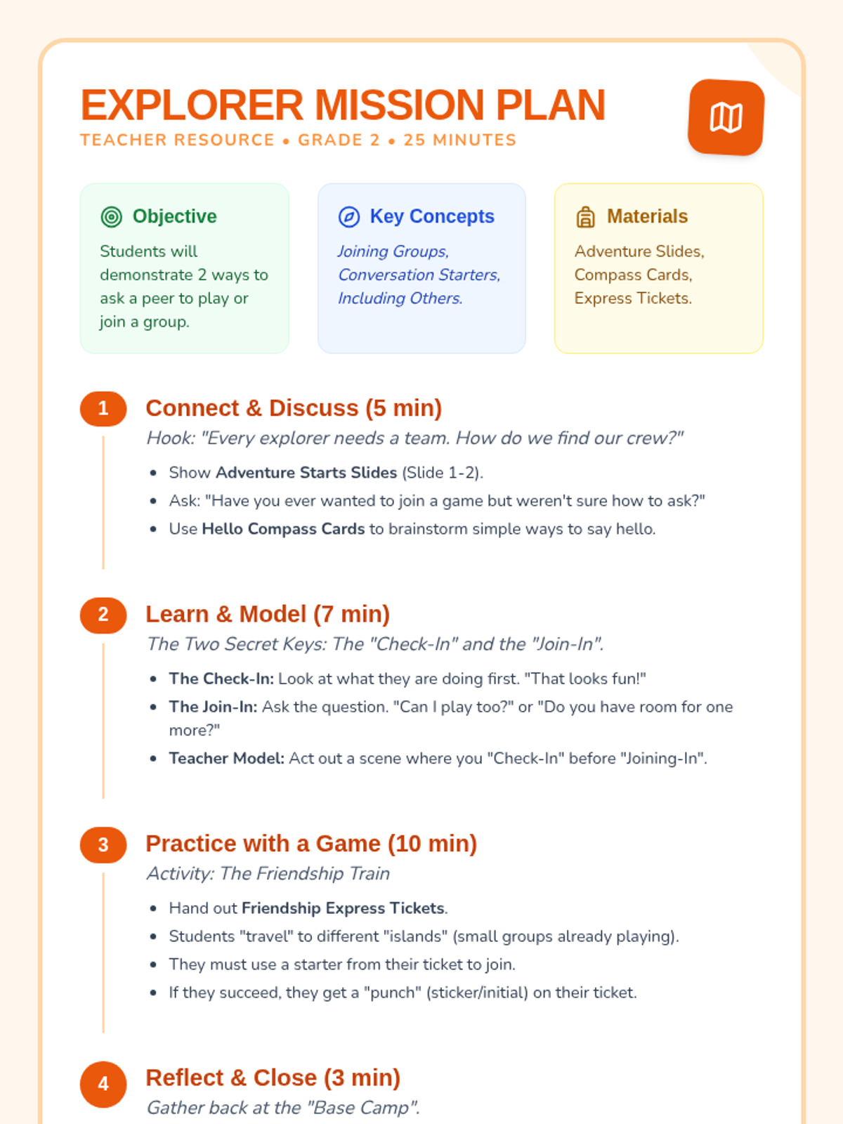 A 25-minute lesson for 2nd graders on the social skills needed to join a group or ask a peer to play, themed as a Friendship Adventure. Students learn specific conversation starters and practice through a collaborative game.