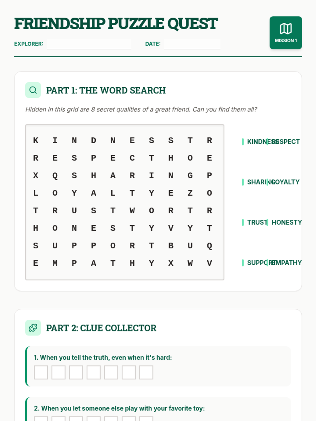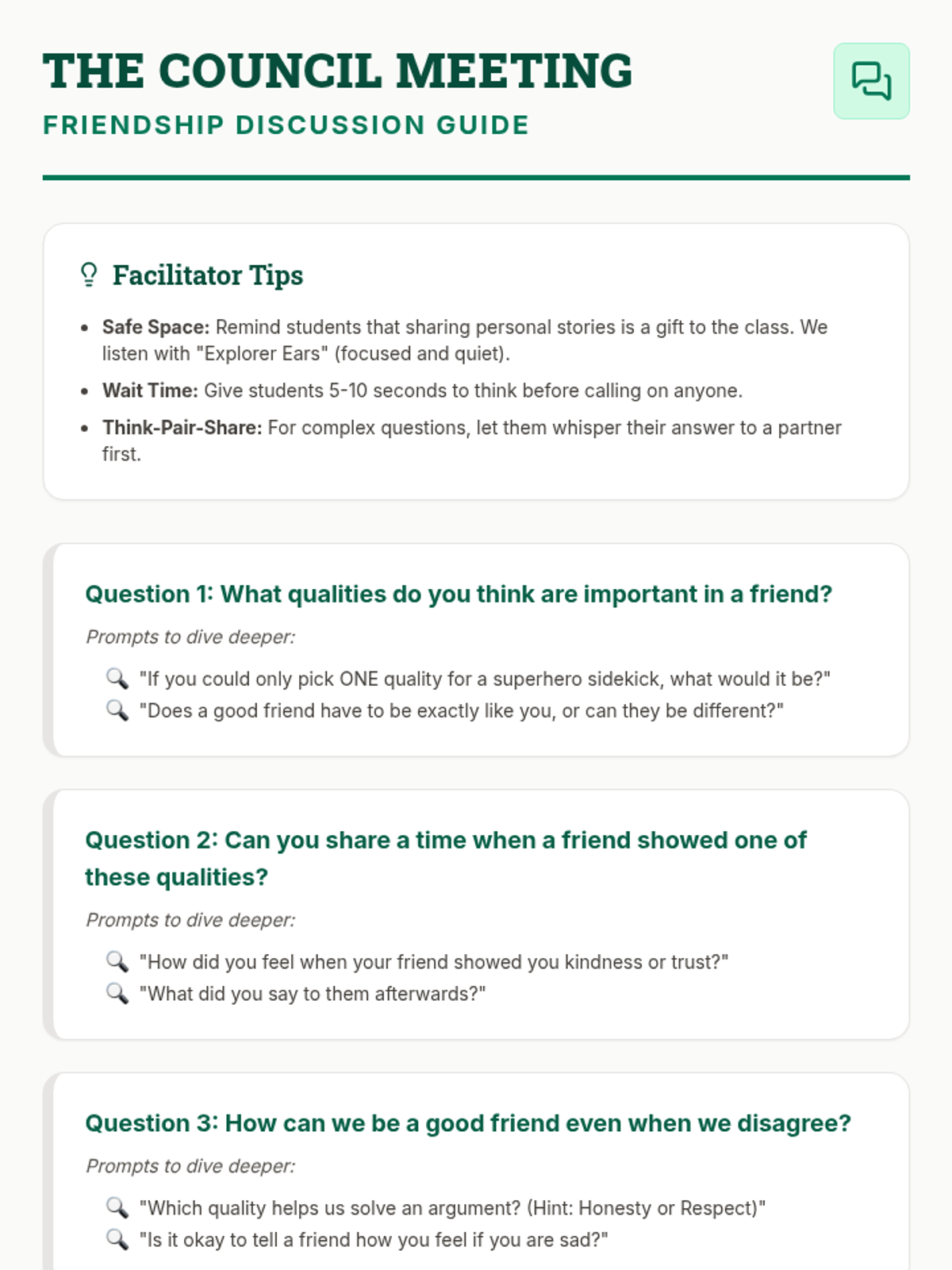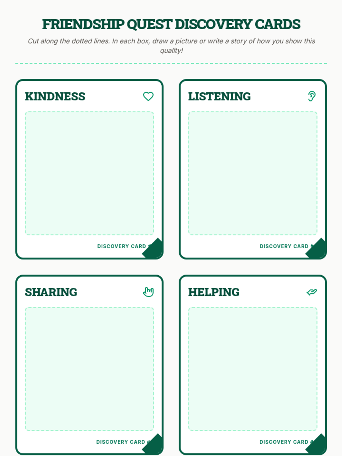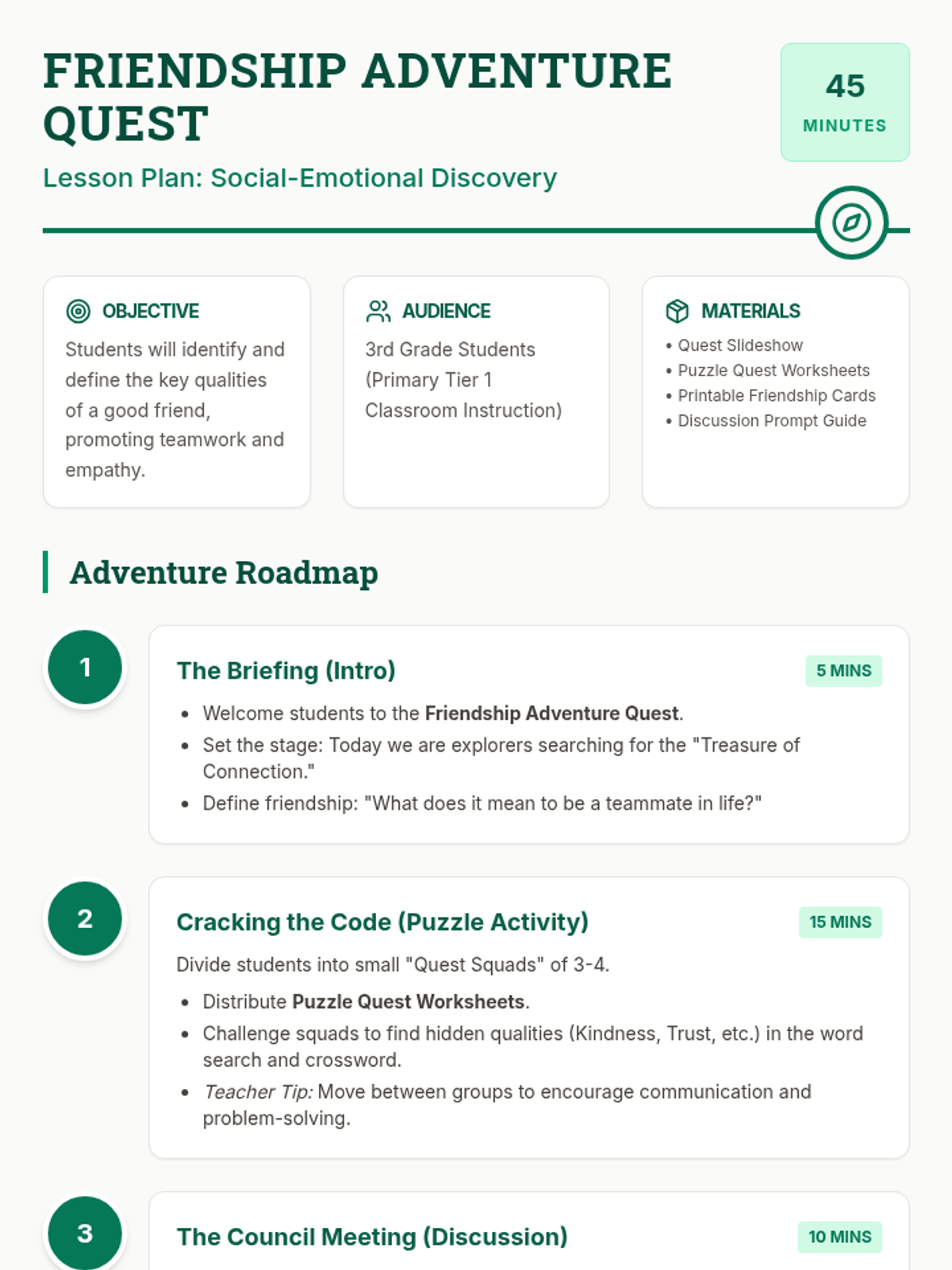 In this interactive 3rd-grade lesson, students embark on a quest to discover the qualities of a good friend through puzzles, teamwork, and creative expression. This adventure promotes empathy and social-emotional growth by defining what makes a friendship strong.