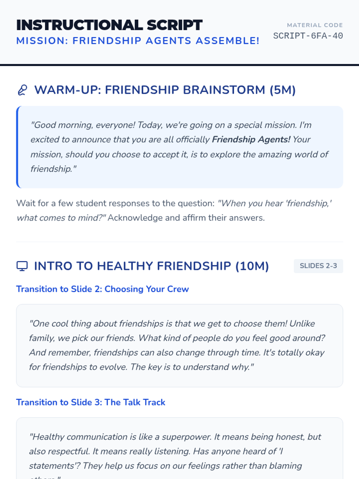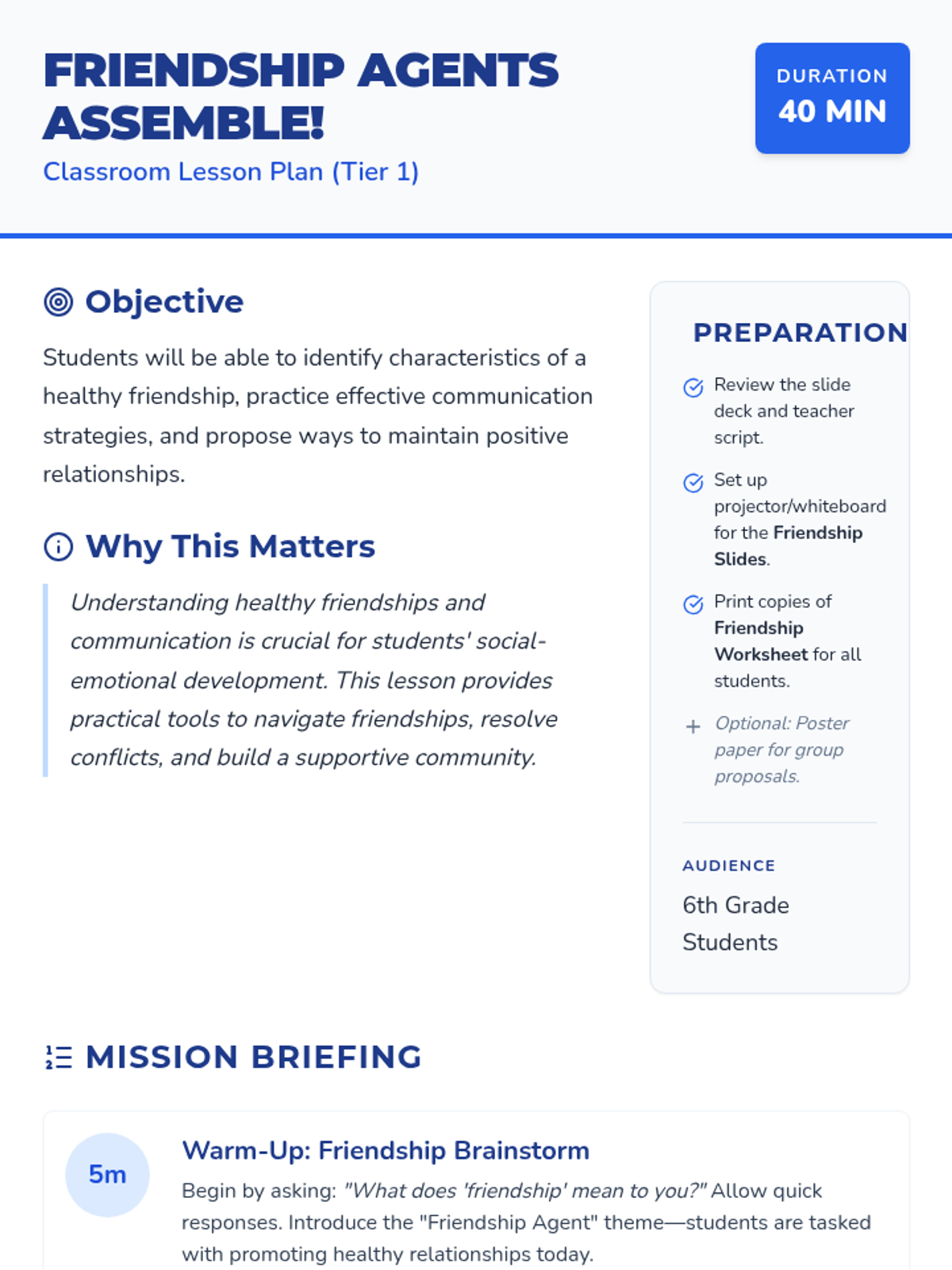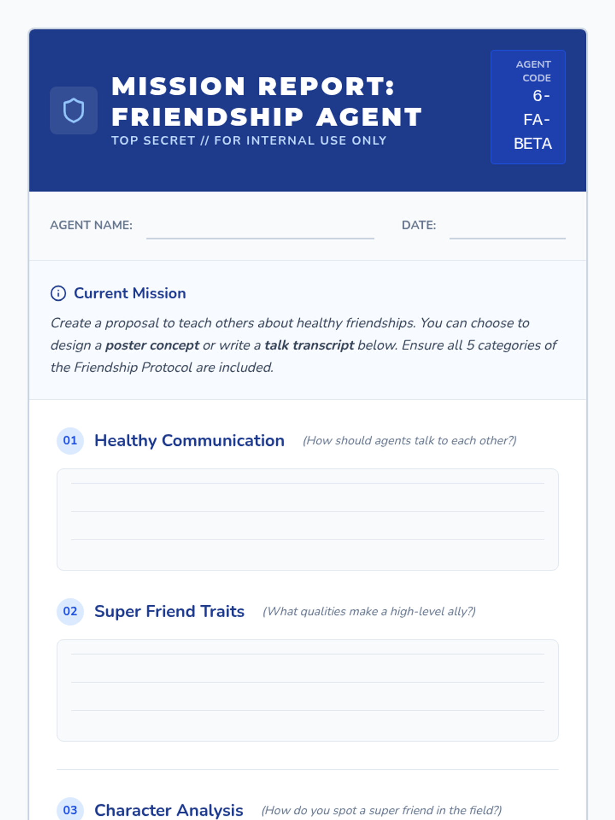 This 40-minute lesson empowers 6th-grade students to understand and practice healthy communication and friendship skills through the creative lens of being 'Friendship Agents.' Students identify positive traits, learn to navigate conflict, and develop a proposal for building better relationships.