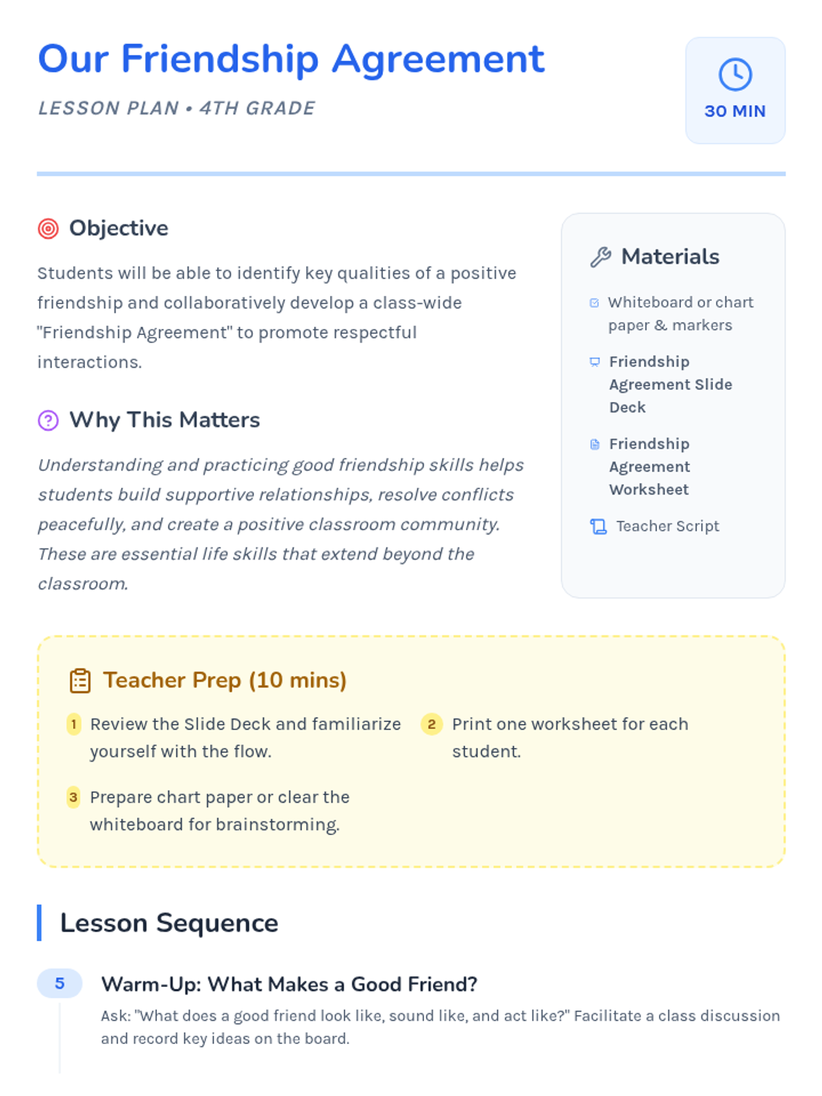 This lesson helps 4th-grade students understand the key components of a healthy friendship and collaboratively create a 'friendship contract' to foster empathy and communication.