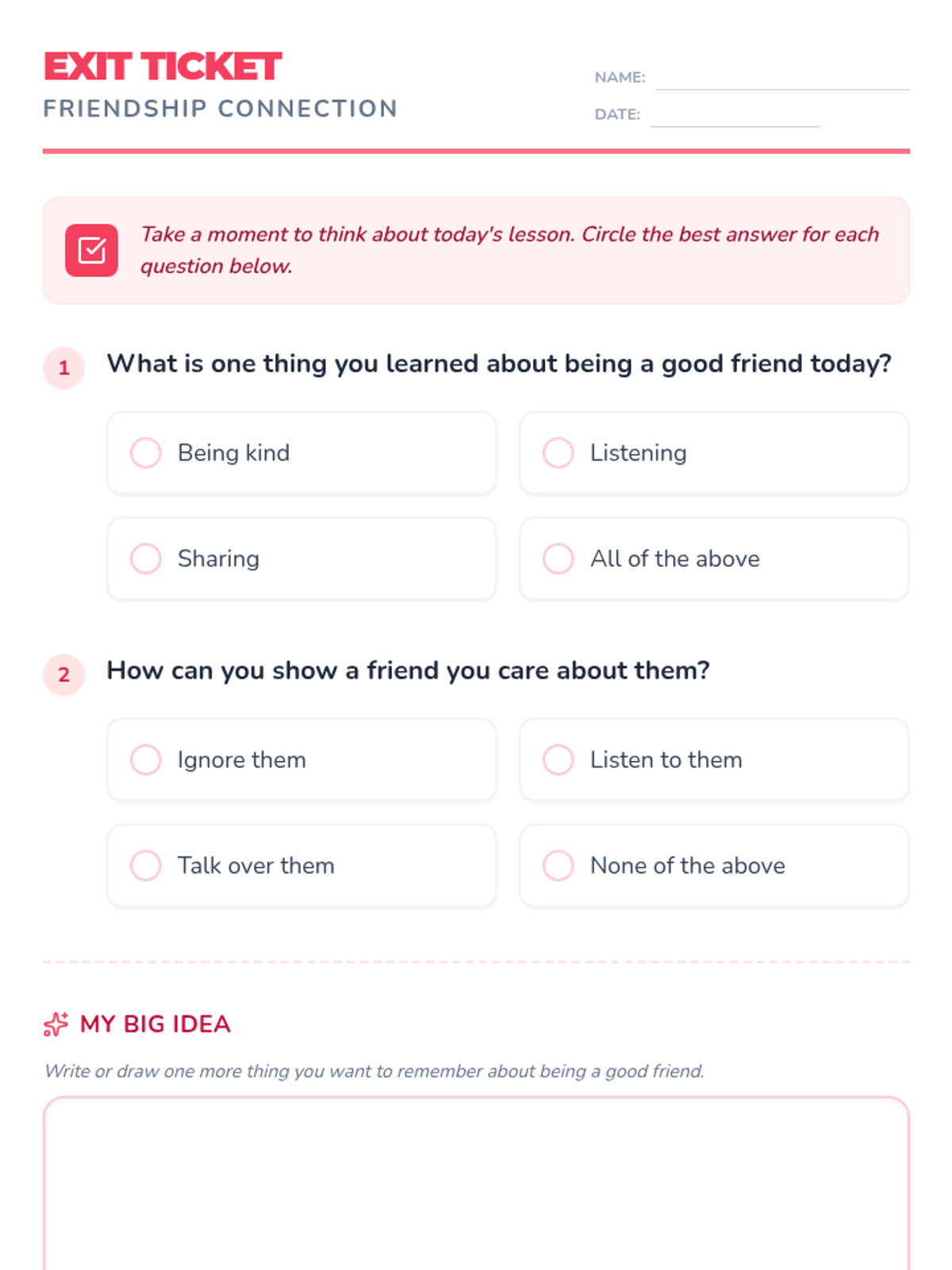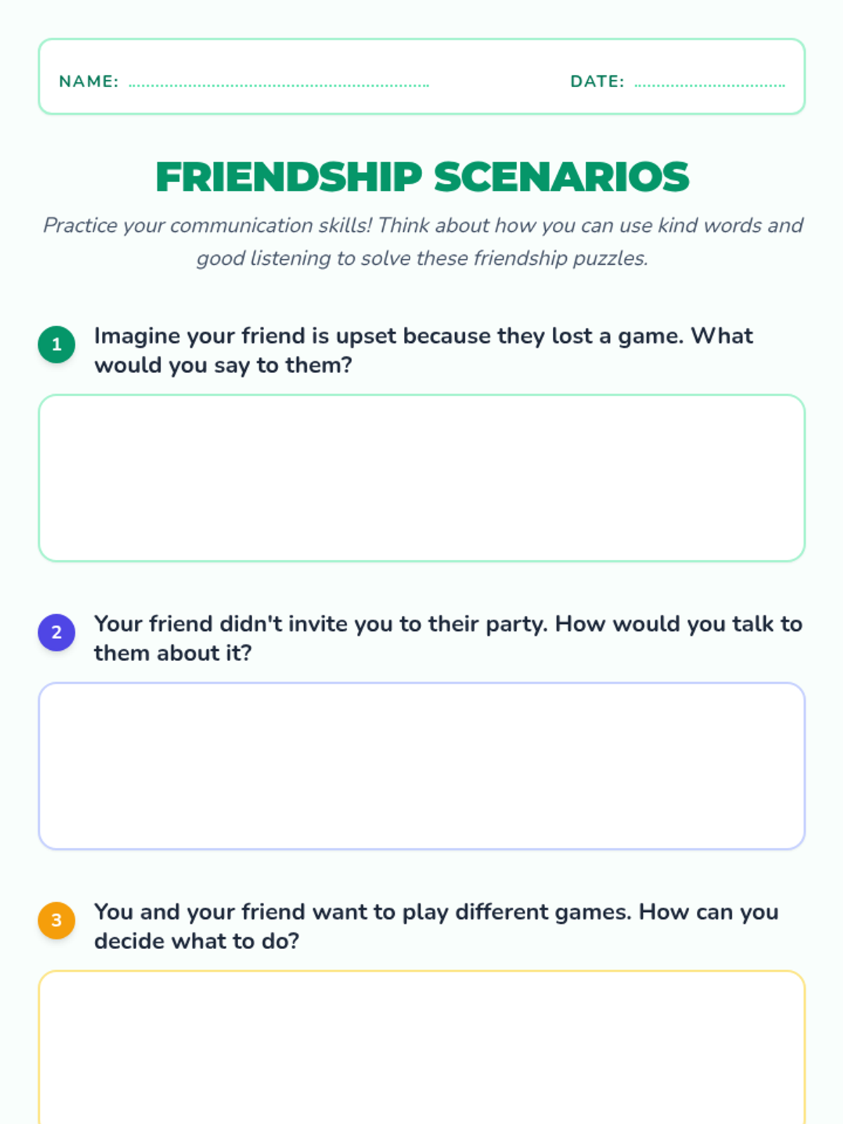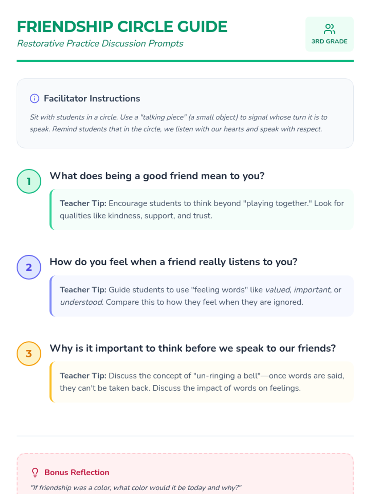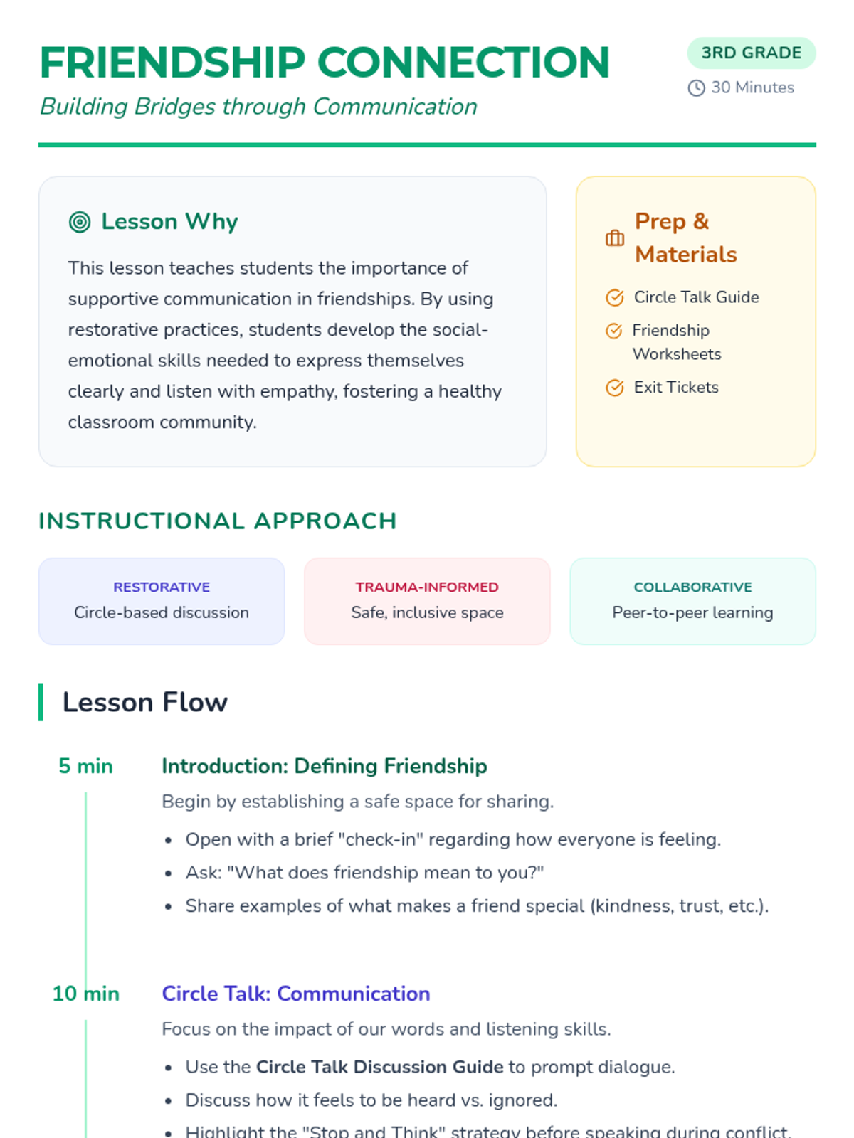 A 30-minute lesson for 3rd graders focusing on the fundamentals of healthy friendship and effective communication using restorative practices. Students will explore empathy, active listening, and conflict resolution through discussion and scenarios.