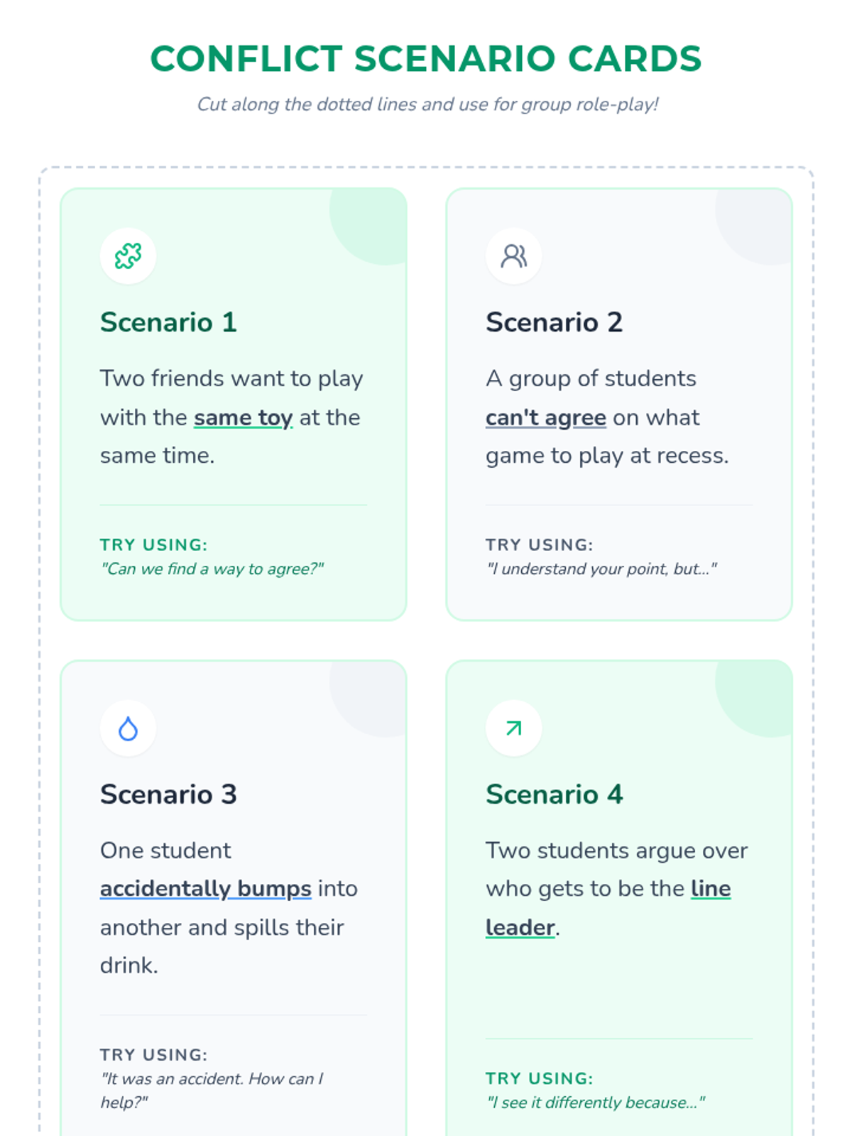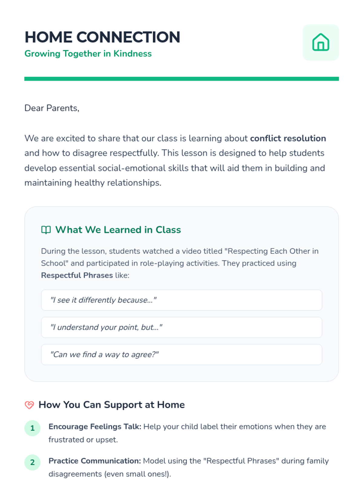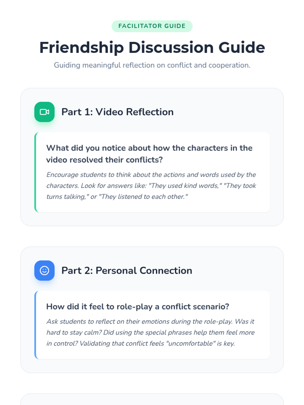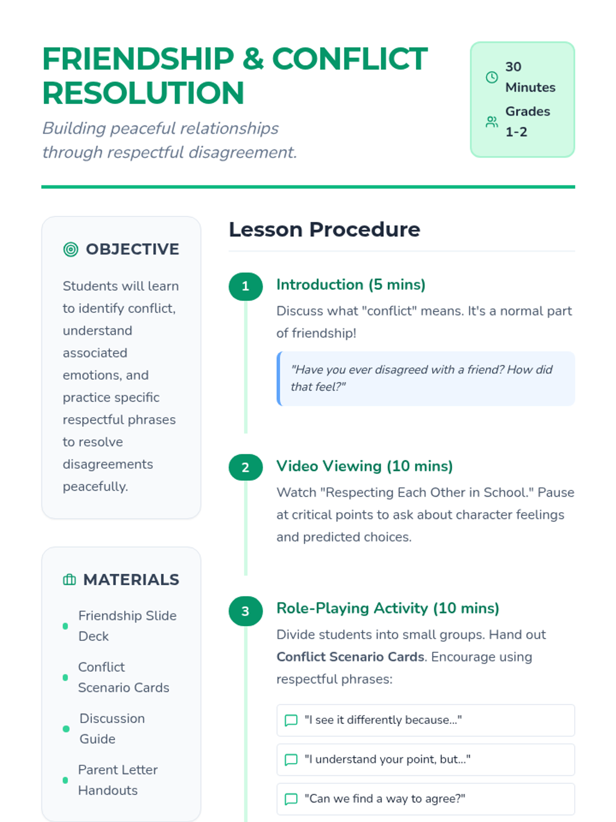 A comprehensive lesson for 1st and 2nd graders on navigating disagreements, identifying emotions, and practicing respectful communication through role-play and video analysis.