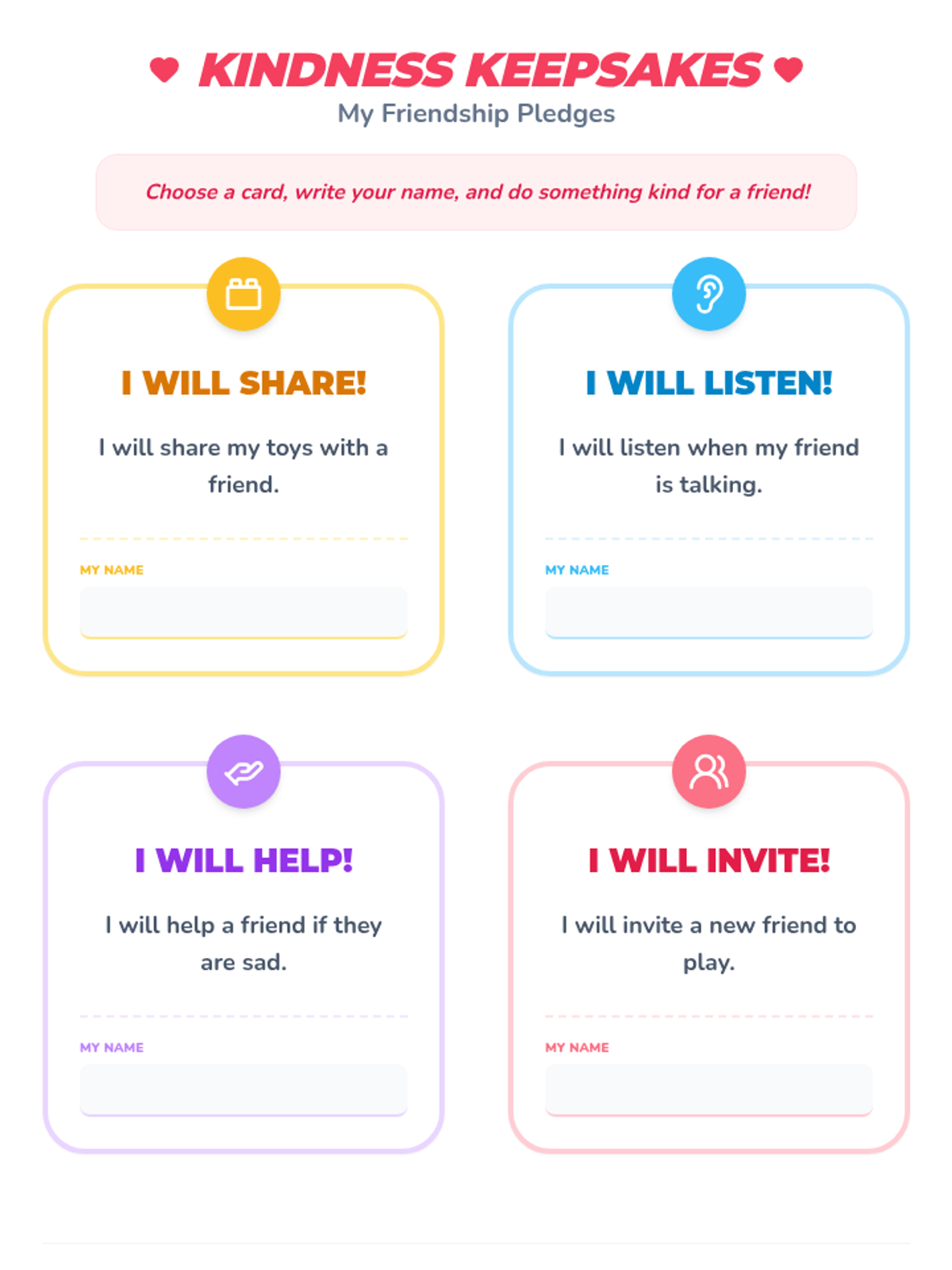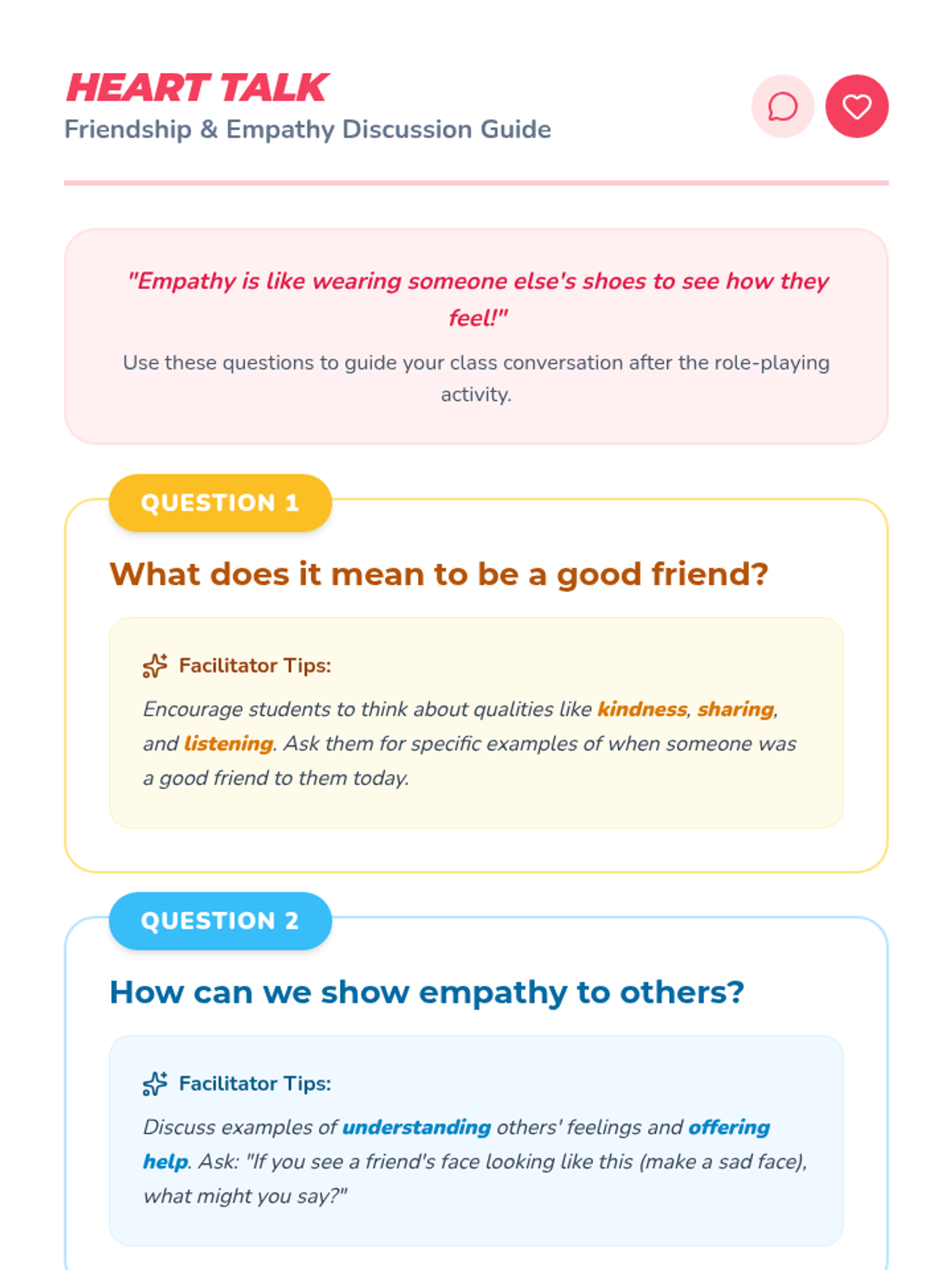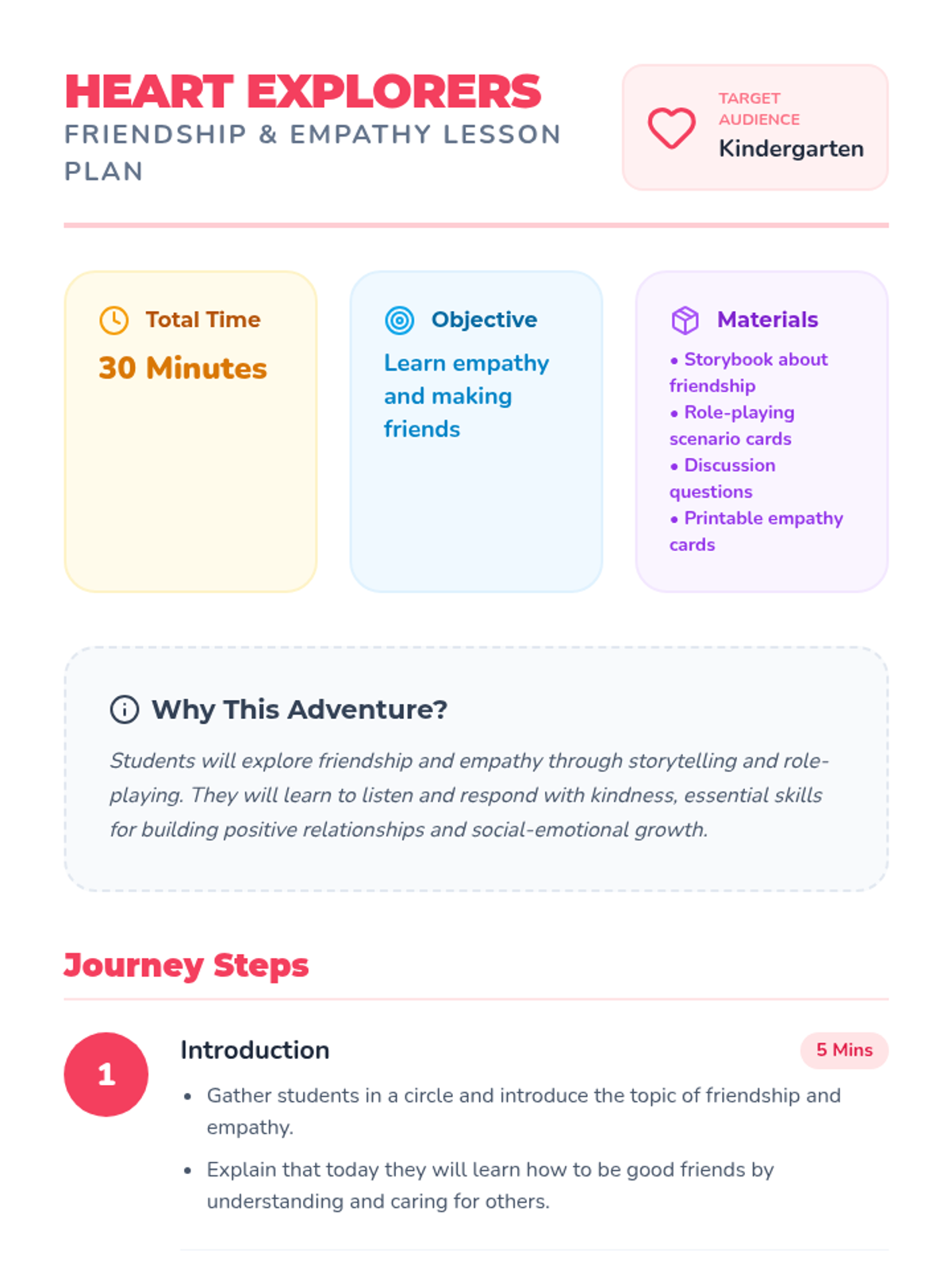 A Kindergarten lesson focused on developing empathy and friendship skills through storytelling, role-play, and reflective activities. Students will learn to recognize feelings in others and practice responding with kindness.