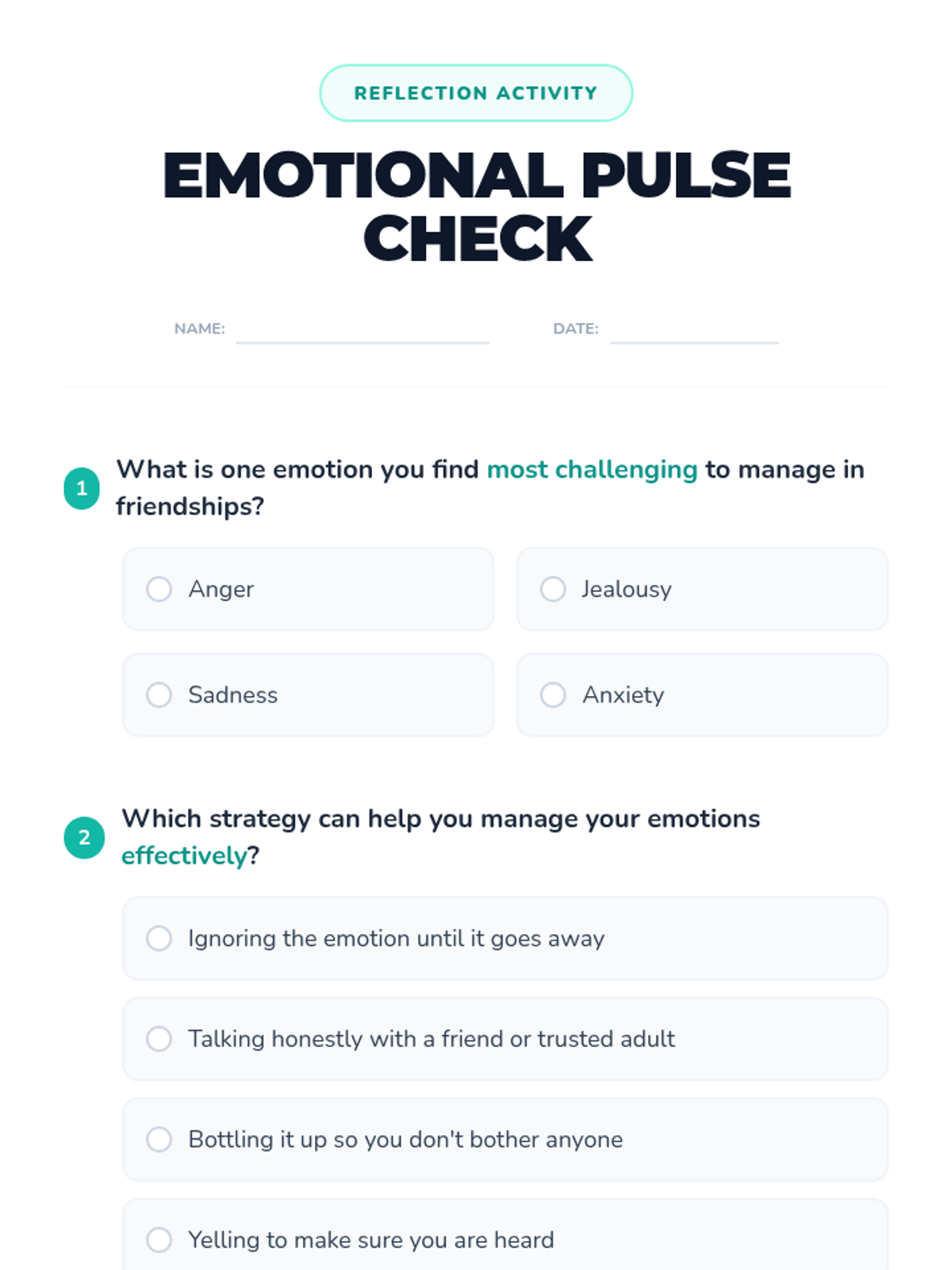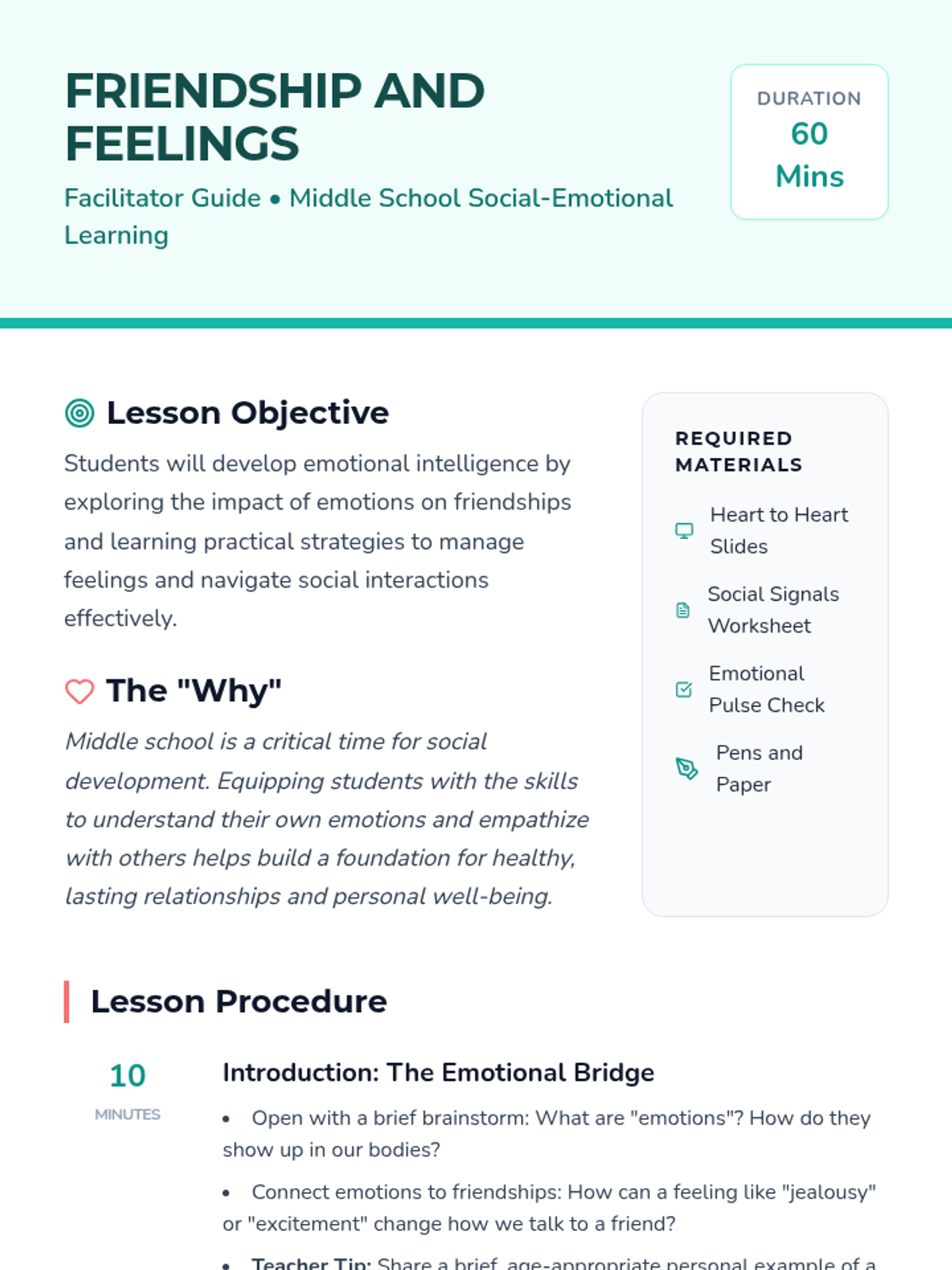 A comprehensive lesson for middle school students to explore the intersection of emotions and social connections, focusing on emotional intelligence and conflict resolution strategies.