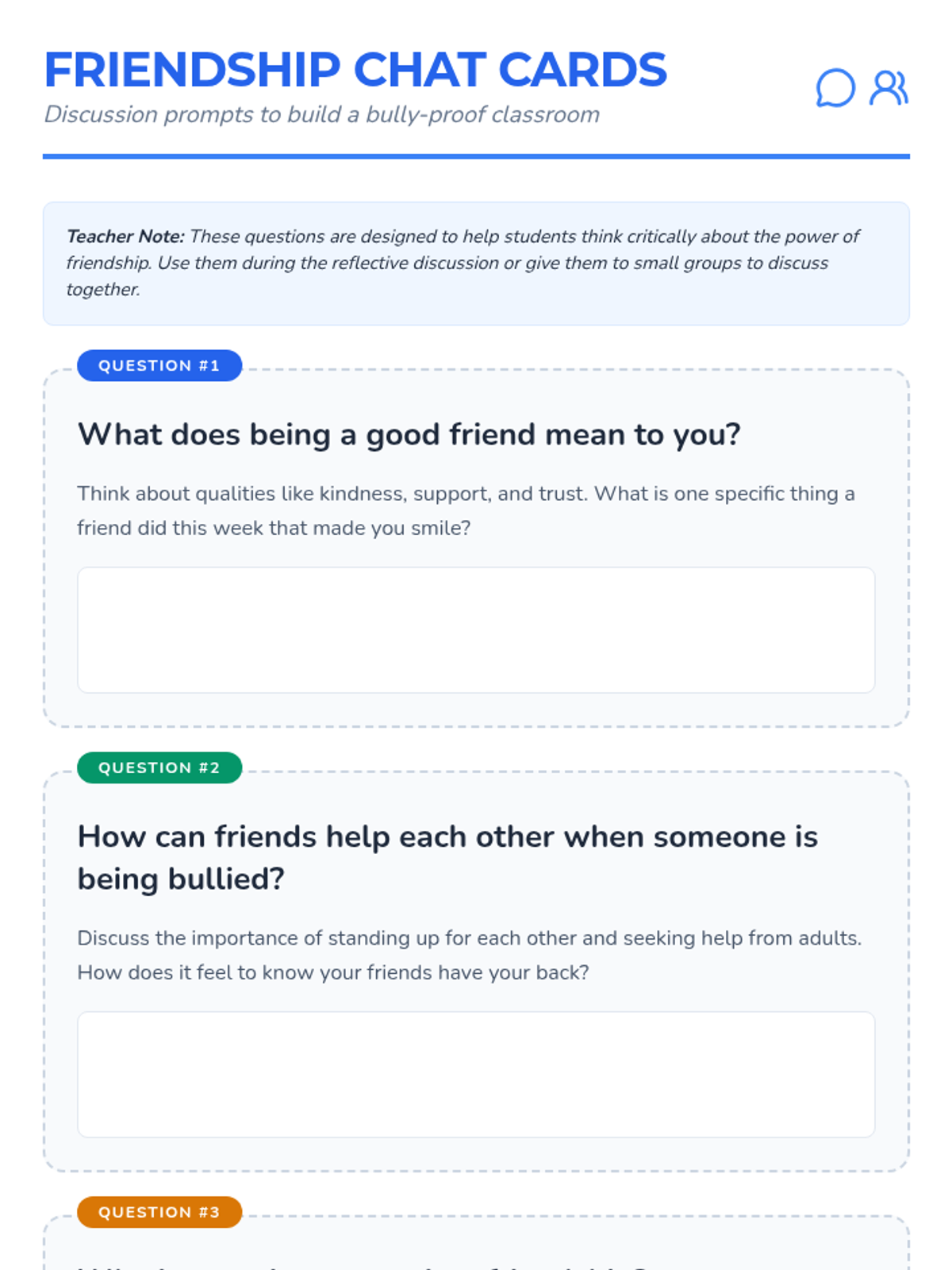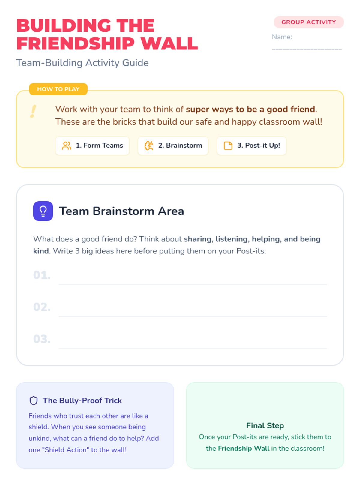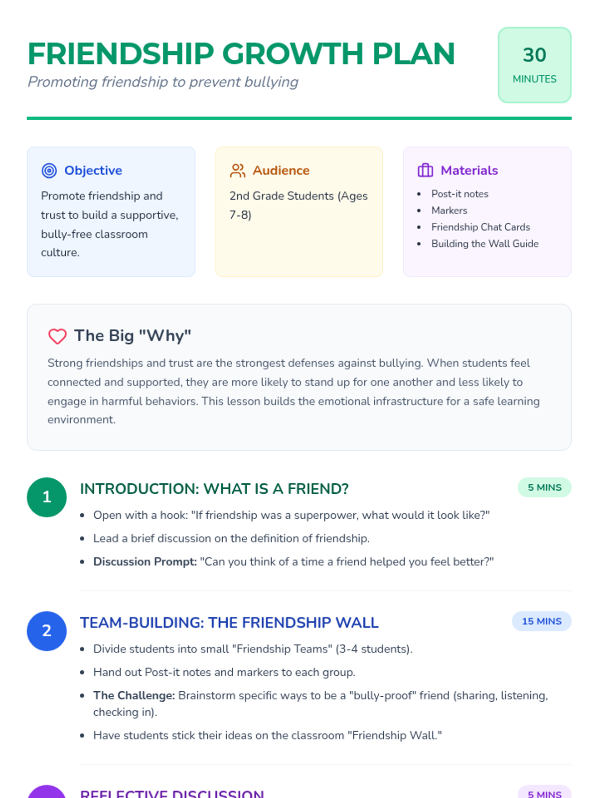A 30-minute lesson for 2nd graders focusing on how strong friendships and trust create a supportive, bully-free classroom environment through team-building and discussion.