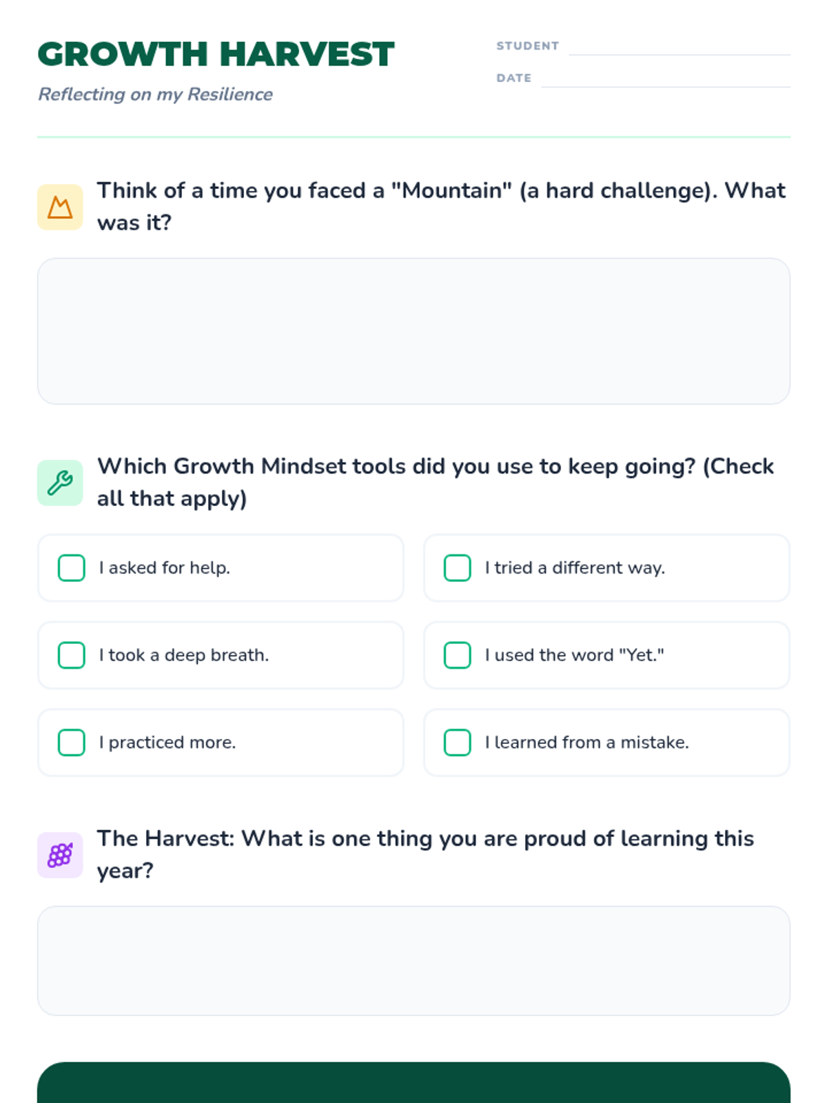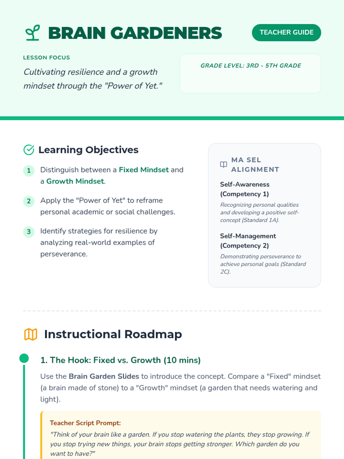 A 45-minute social-emotional learning lesson for grades 3-5 focused on reframing mistakes as essential learning opportunities and building resilience through the 'Power of Yet'.