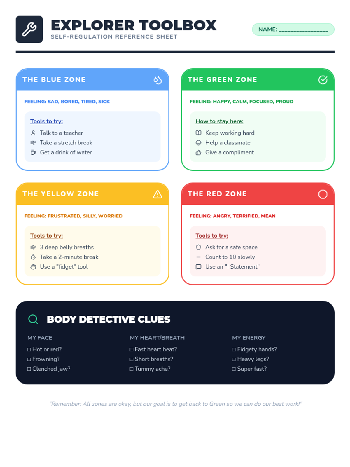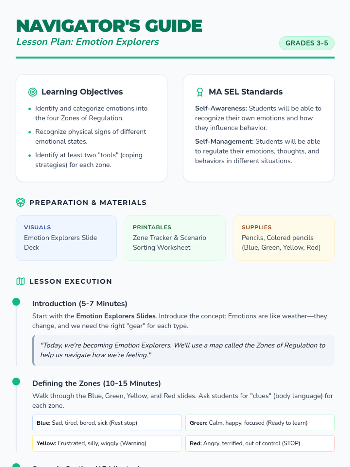 A lesson for upper elementary students (grades 3-5) focused on identifying big feelings and practicing self-regulation techniques like square breathing and grounding. Includes a hands-on activity to build a personalized calm-down toolkit.