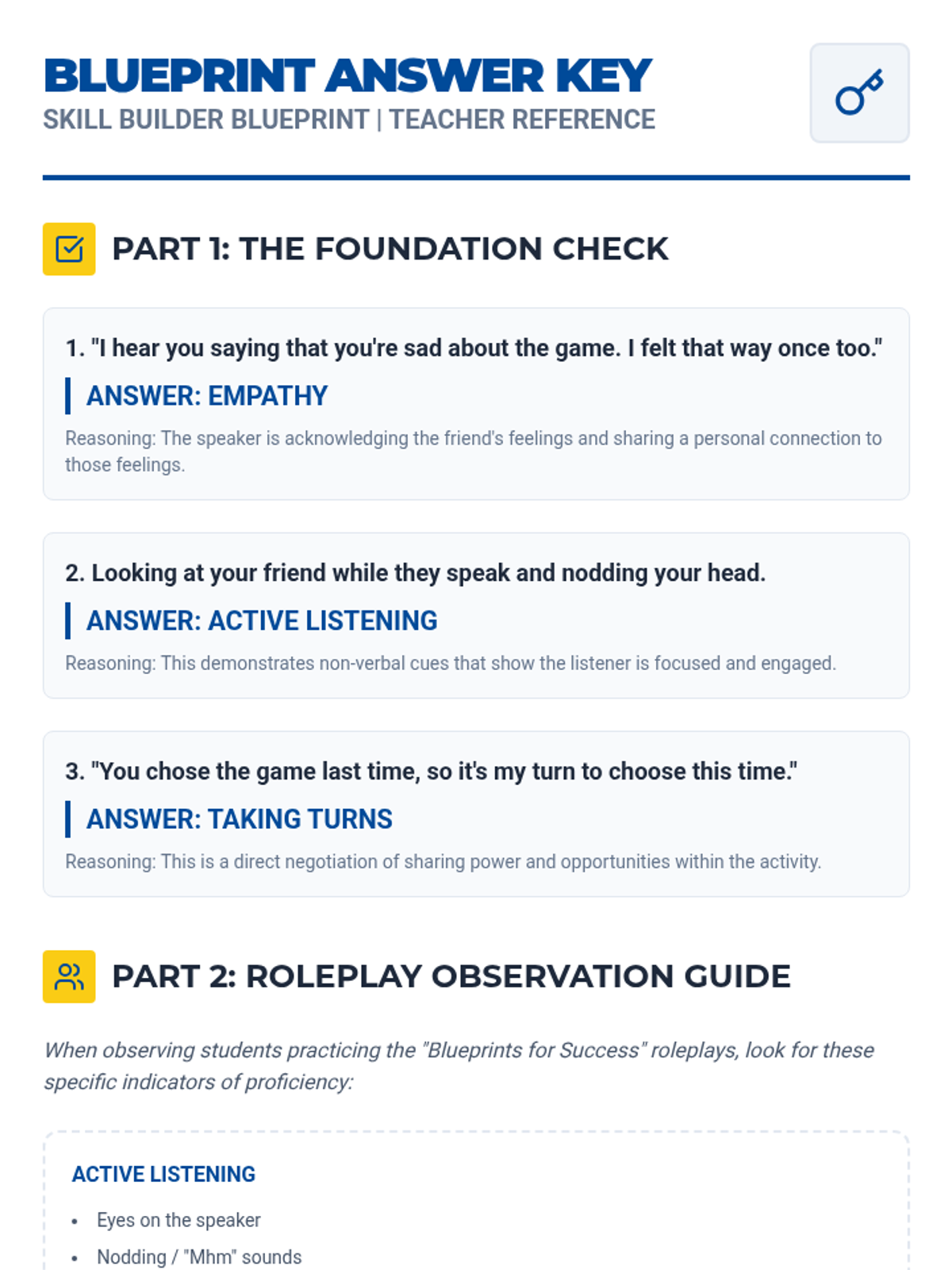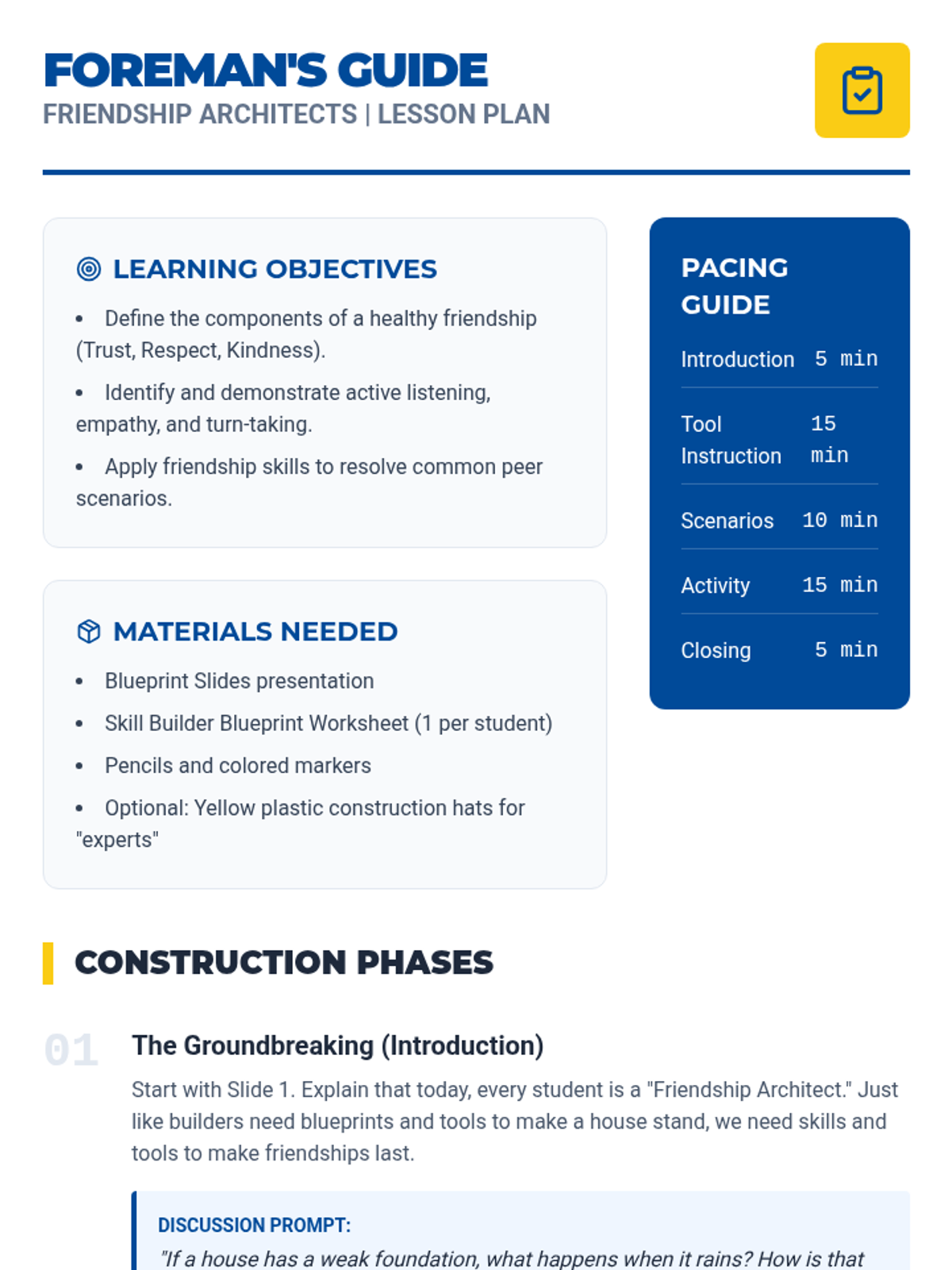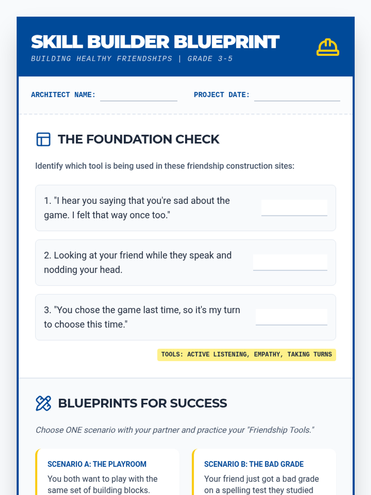 An elementary counseling lesson for grades 3-5 focused on the 'Friendship Architects' theme. Students learn core friendship skills like active listening, empathy, and turn-taking through blueprint-themed discussions and interactive practice.