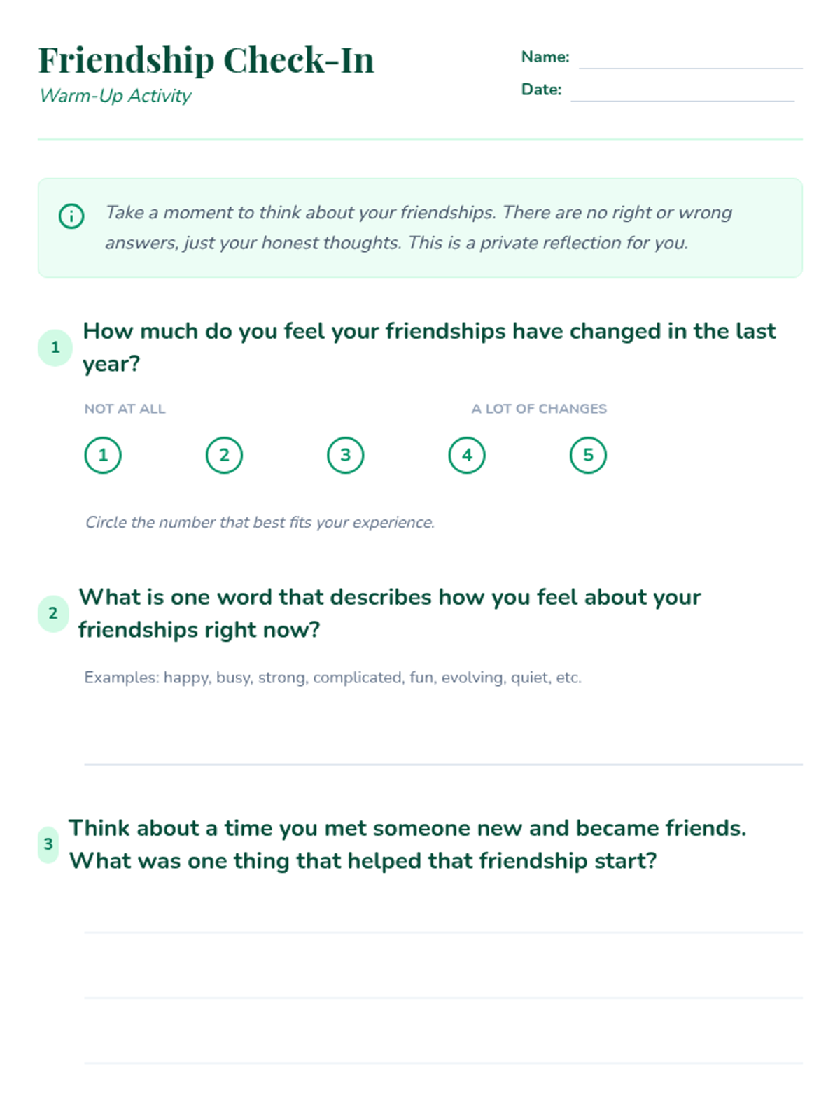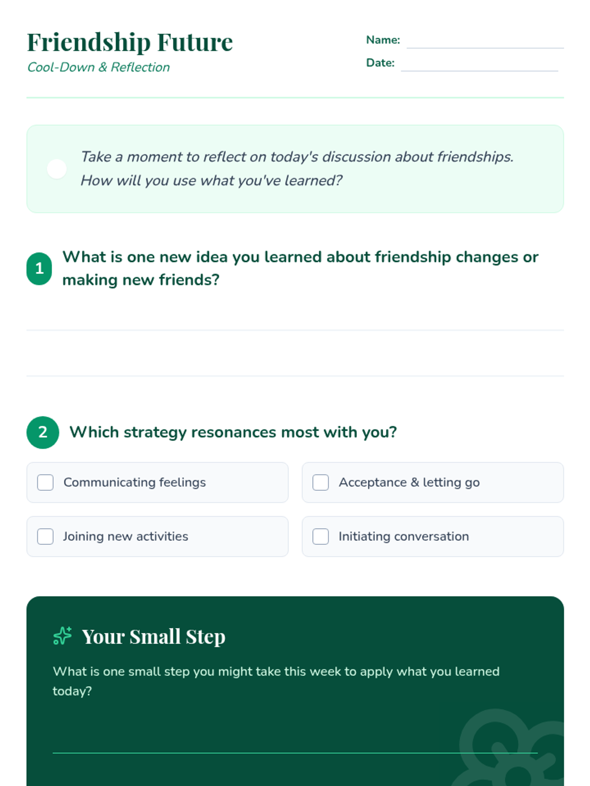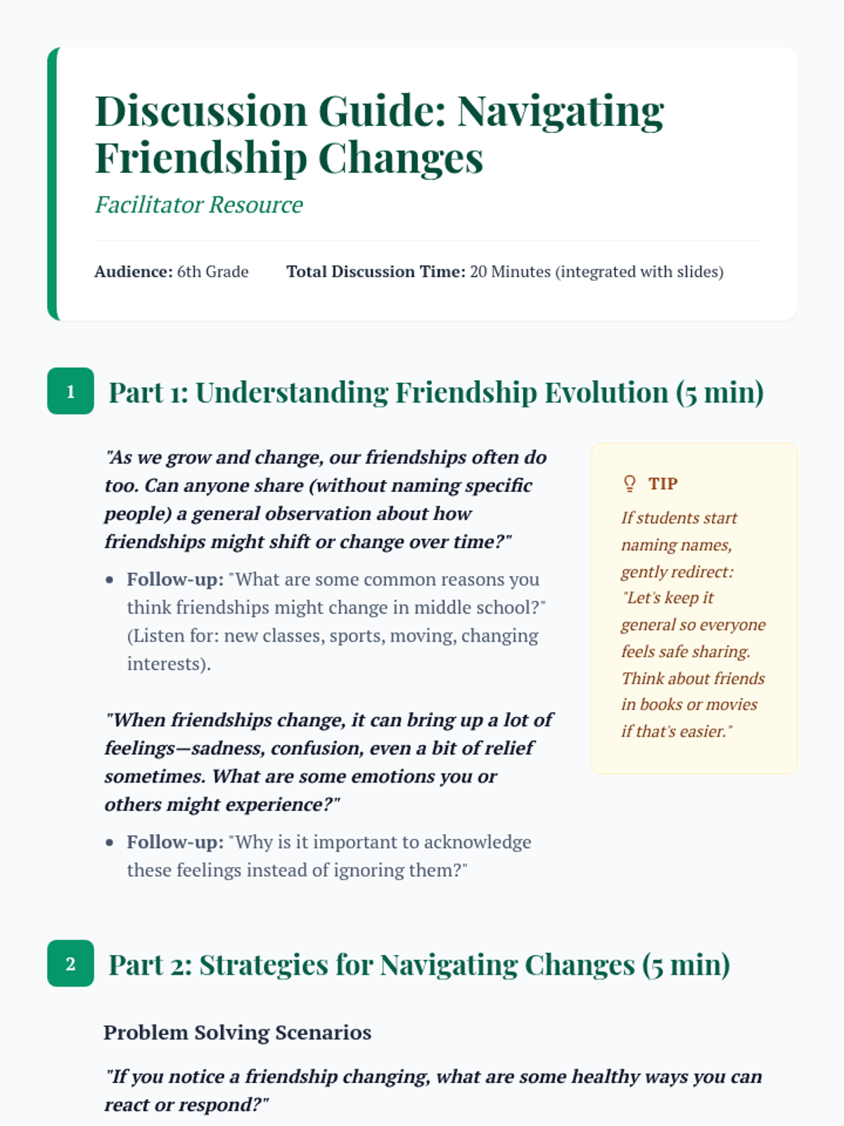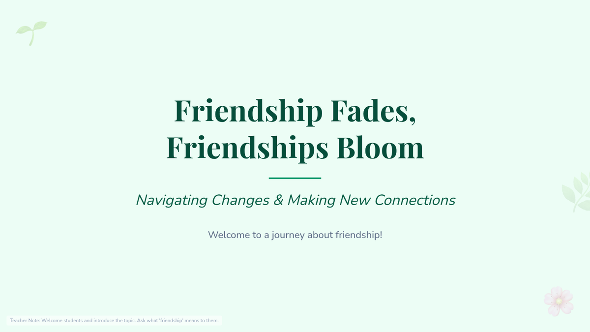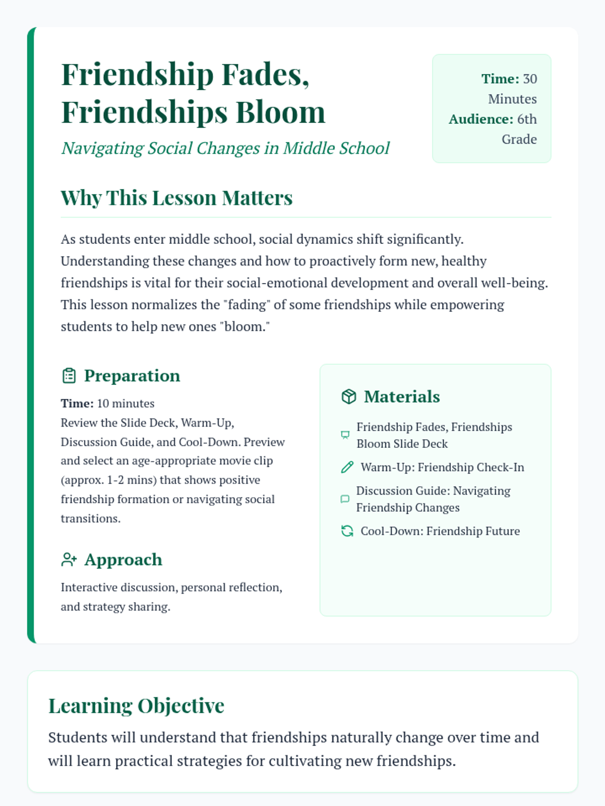 A 30-minute lesson for 6th graders exploring the natural evolution of friendships and providing practical strategies for cultivating new connections. Students reflect on shifting social dynamics and learn actionable steps to build positive relationships.