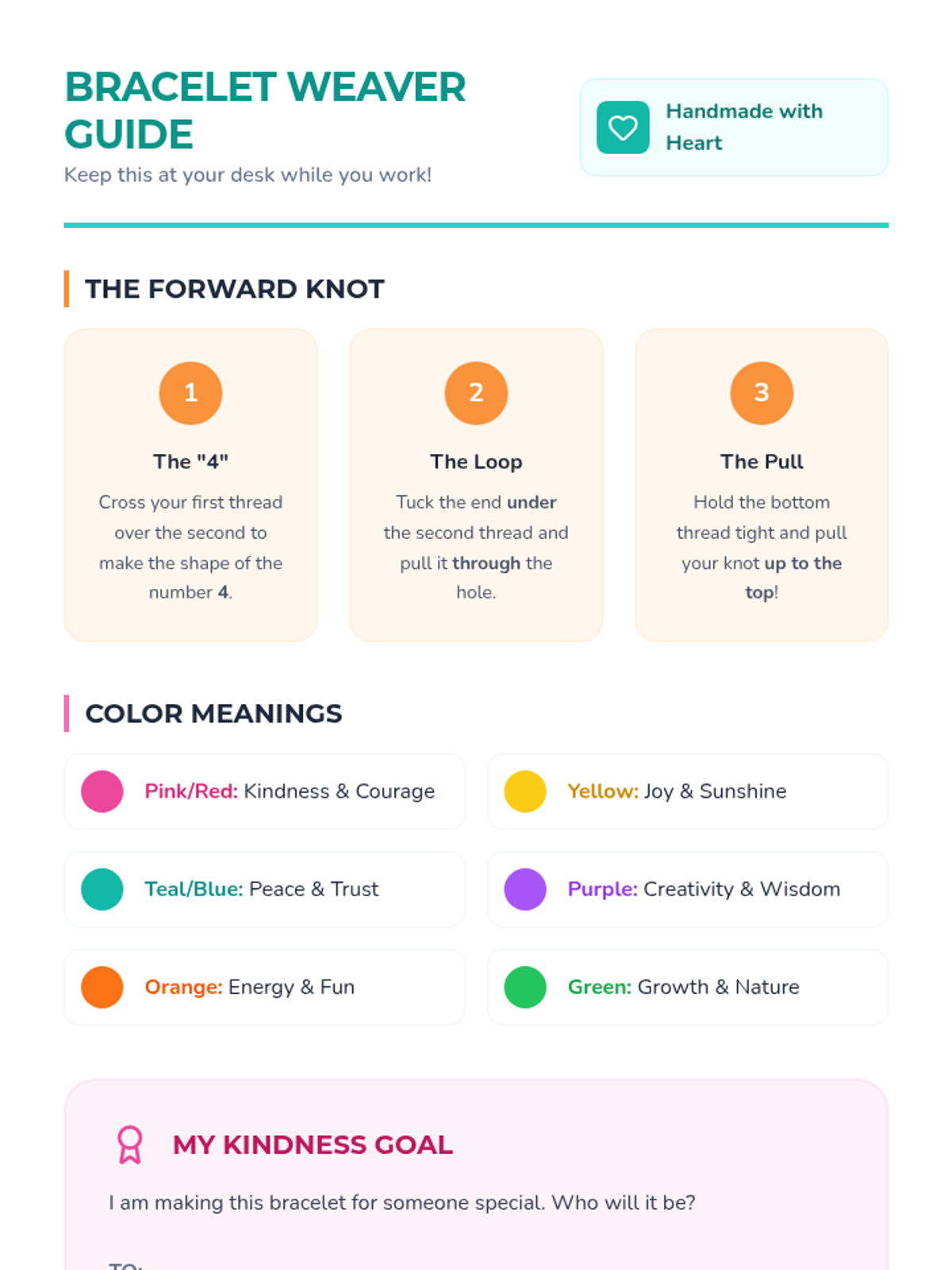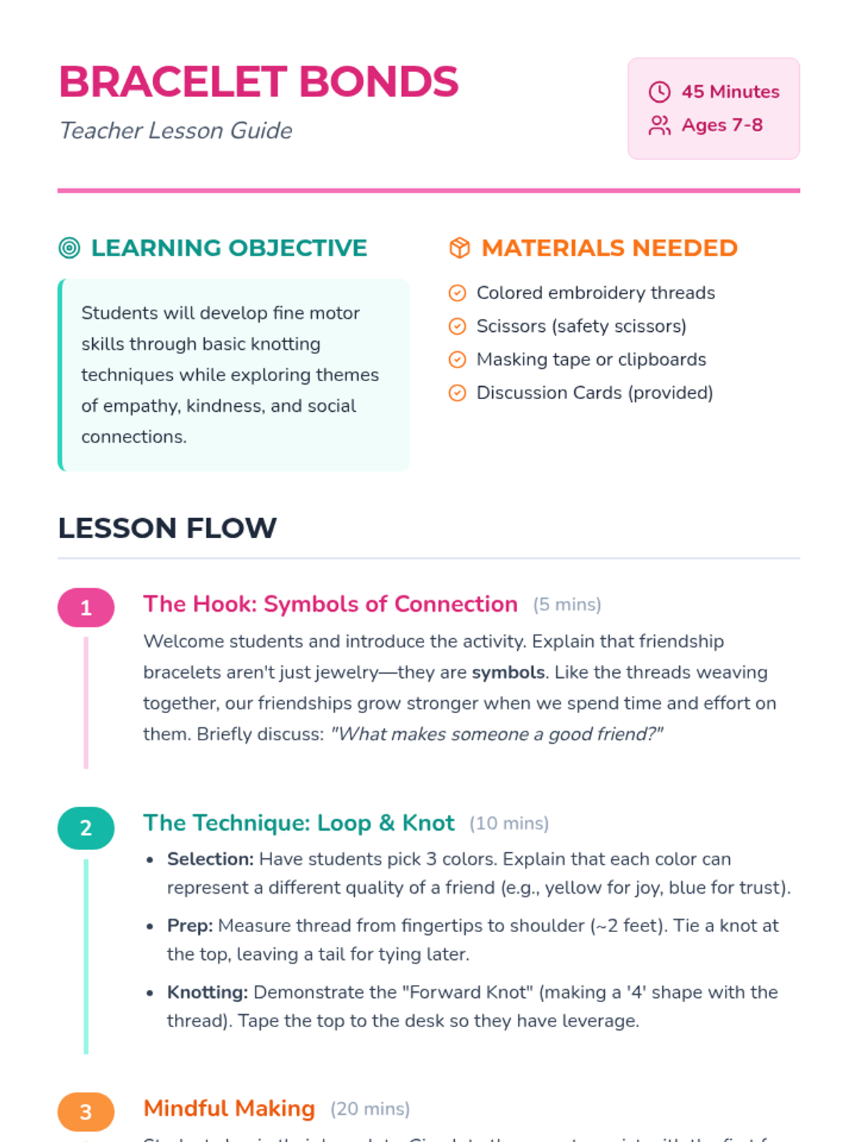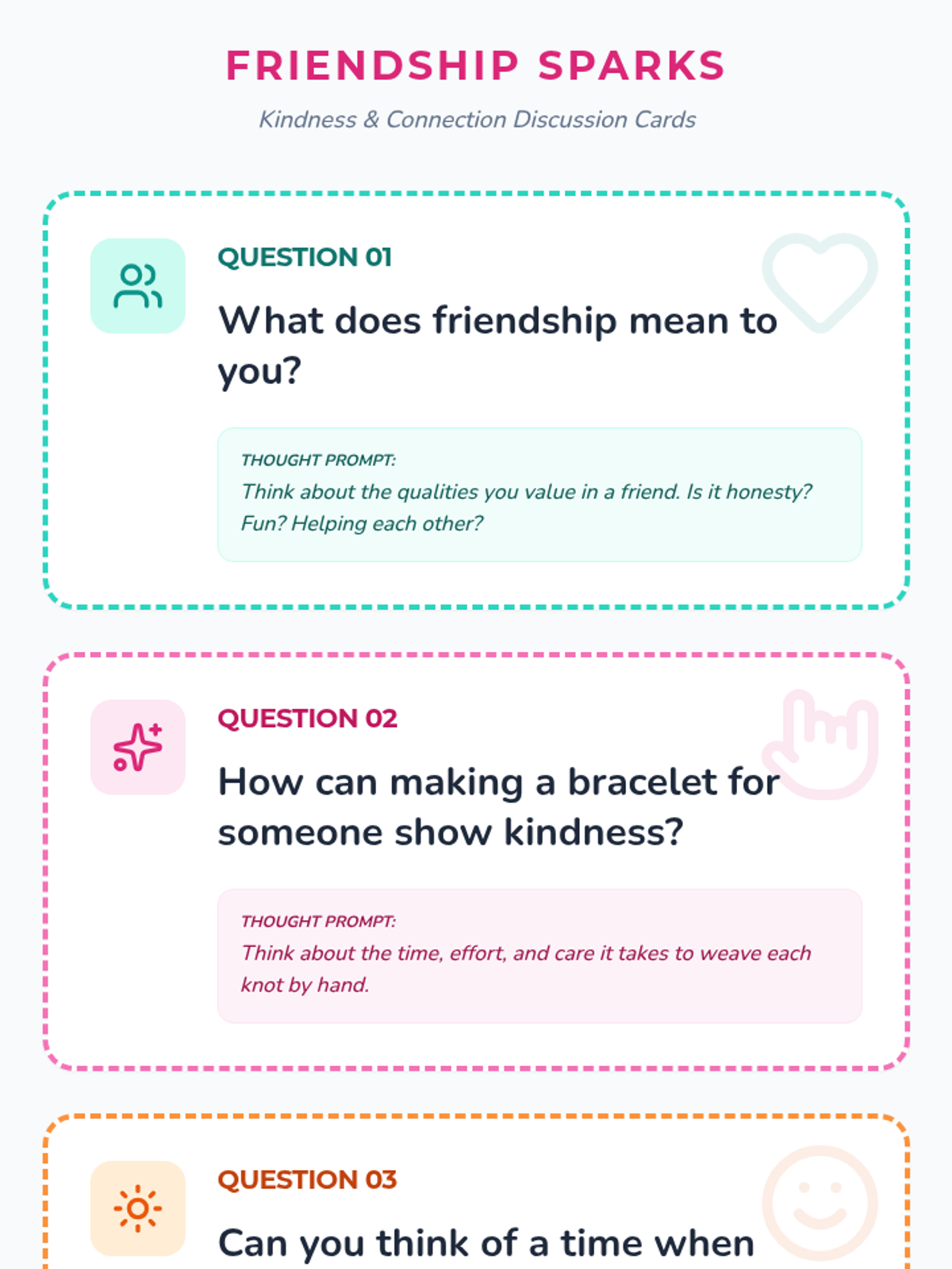 Students will learn to make friendship bracelets while engaging in discussions about empathy, kindness, and the value of interpersonal connections. This hands-on activity develops fine motor skills and provides a tangible way to express appreciation for others.