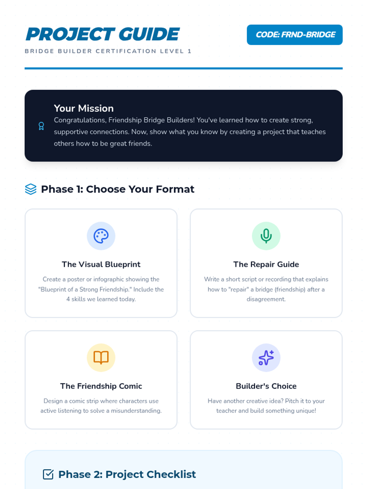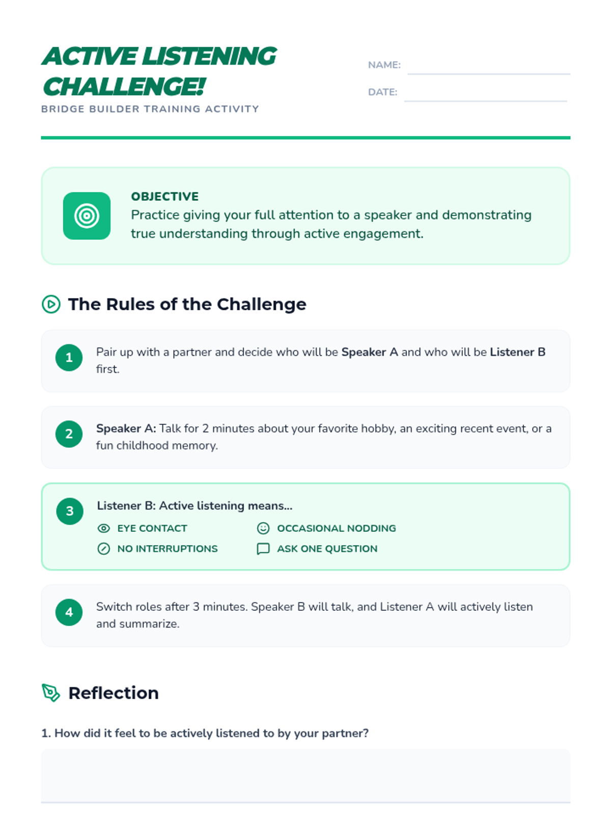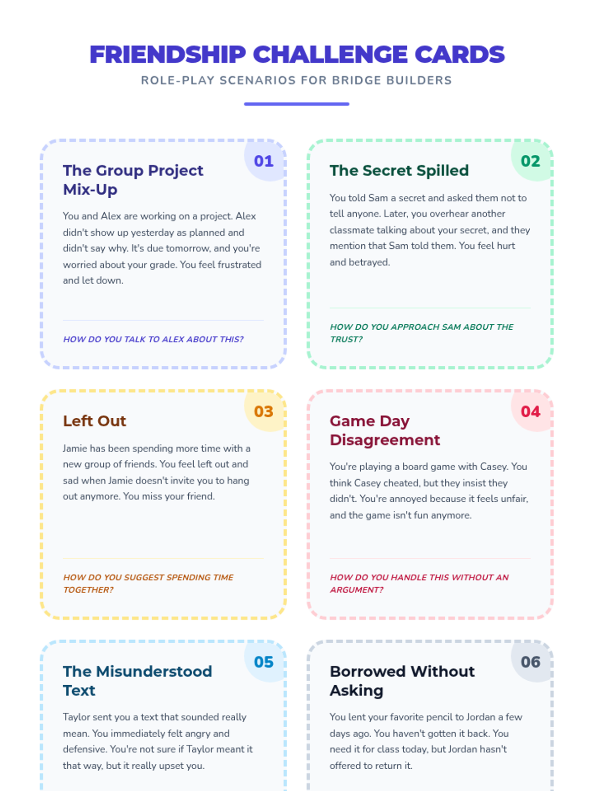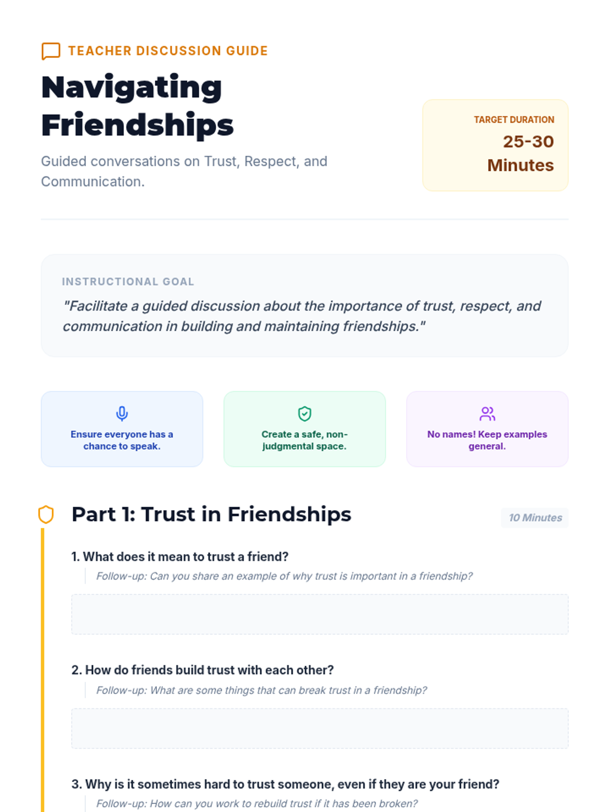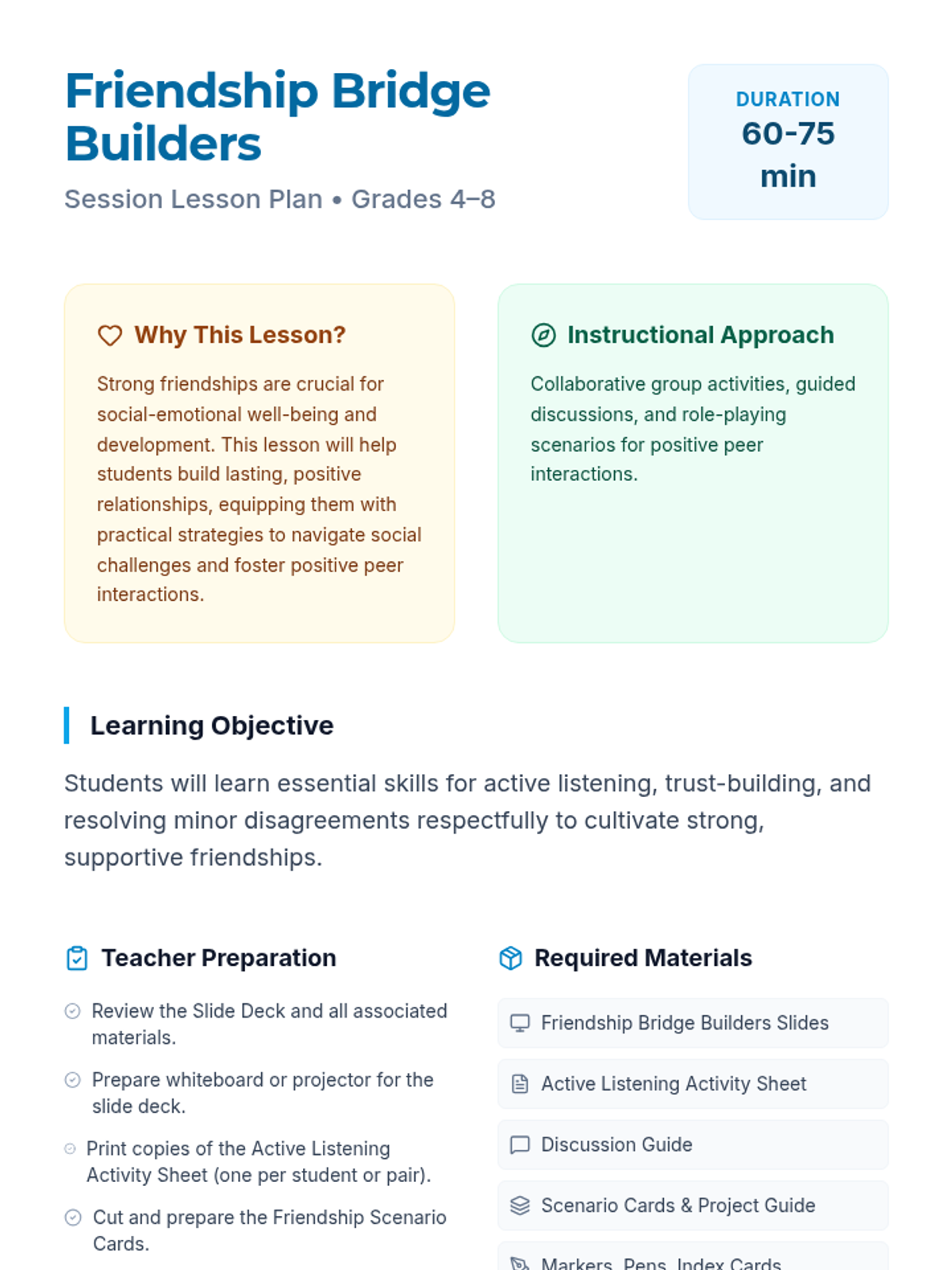 A 60-75 minute session for grades 4-8 focused on active listening, trust-building, and respectful conflict resolution to foster strong peer relationships.