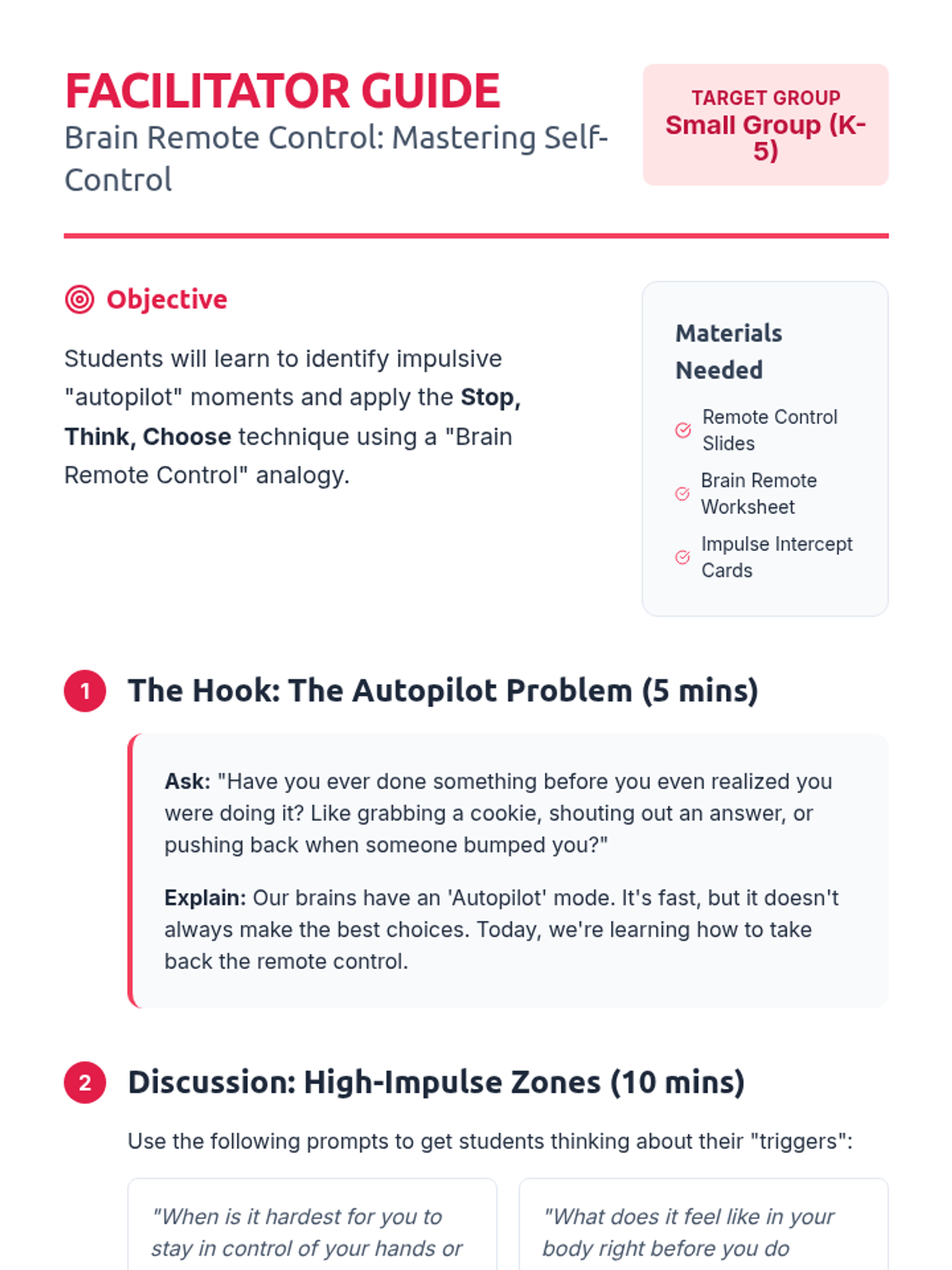 A small group lesson teaching the 'Stop and Think' technique using a 'Brain Remote Control' analogy to help students manage impulses and make better choices.