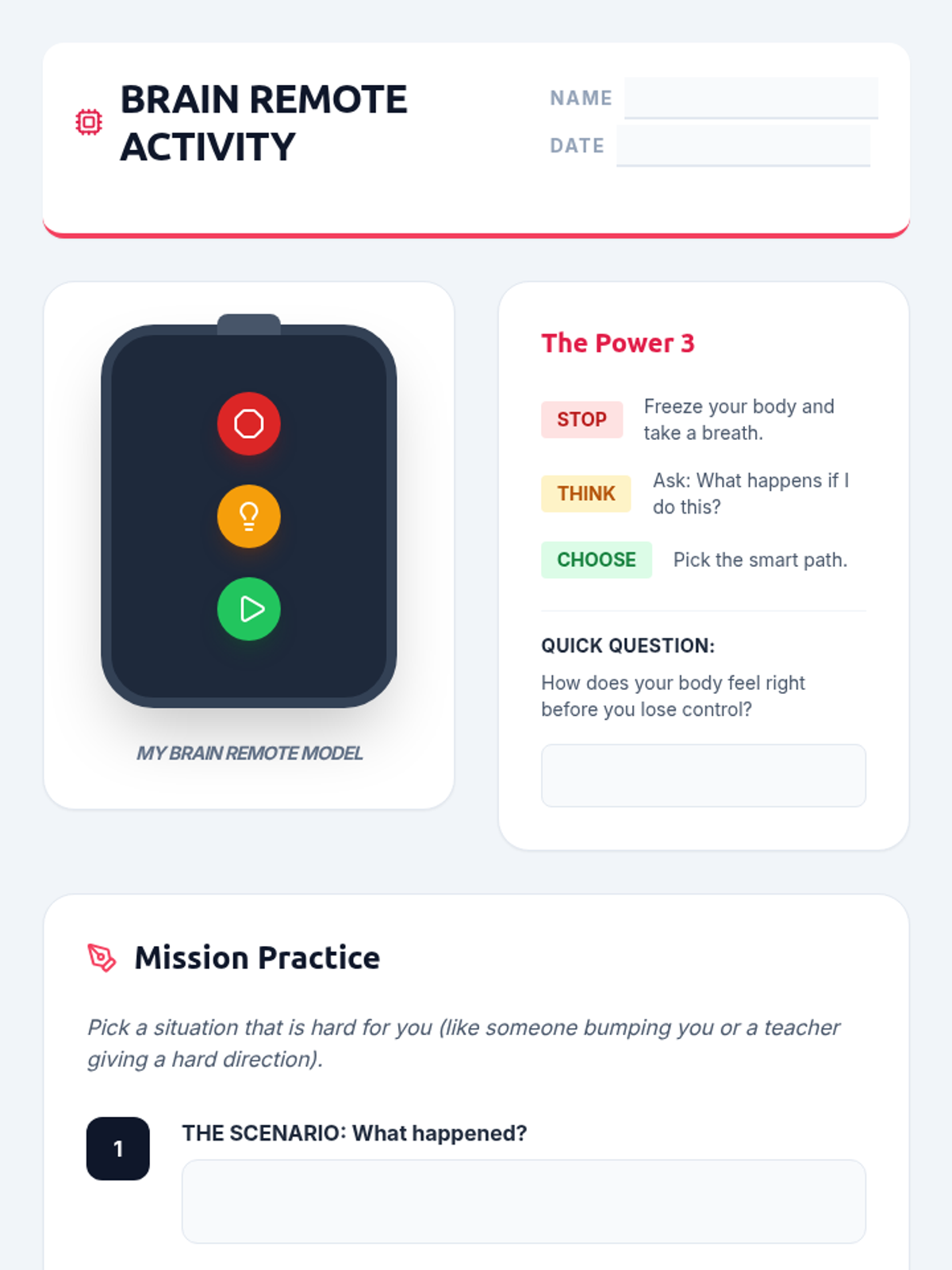 A lesson focused on self-regulation and managing emotions using the metaphor of a 'Remote Control' to help students navigate their feelings. Students will learn to identify their current 'channel' and use strategies to switch to a more comfortable state.
