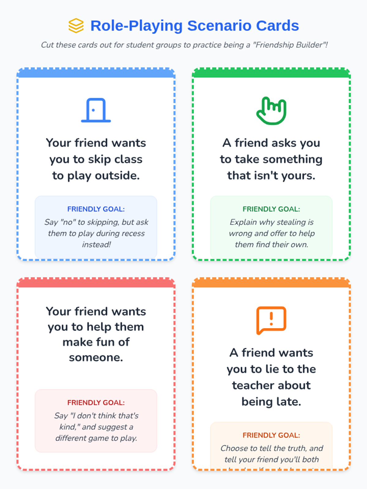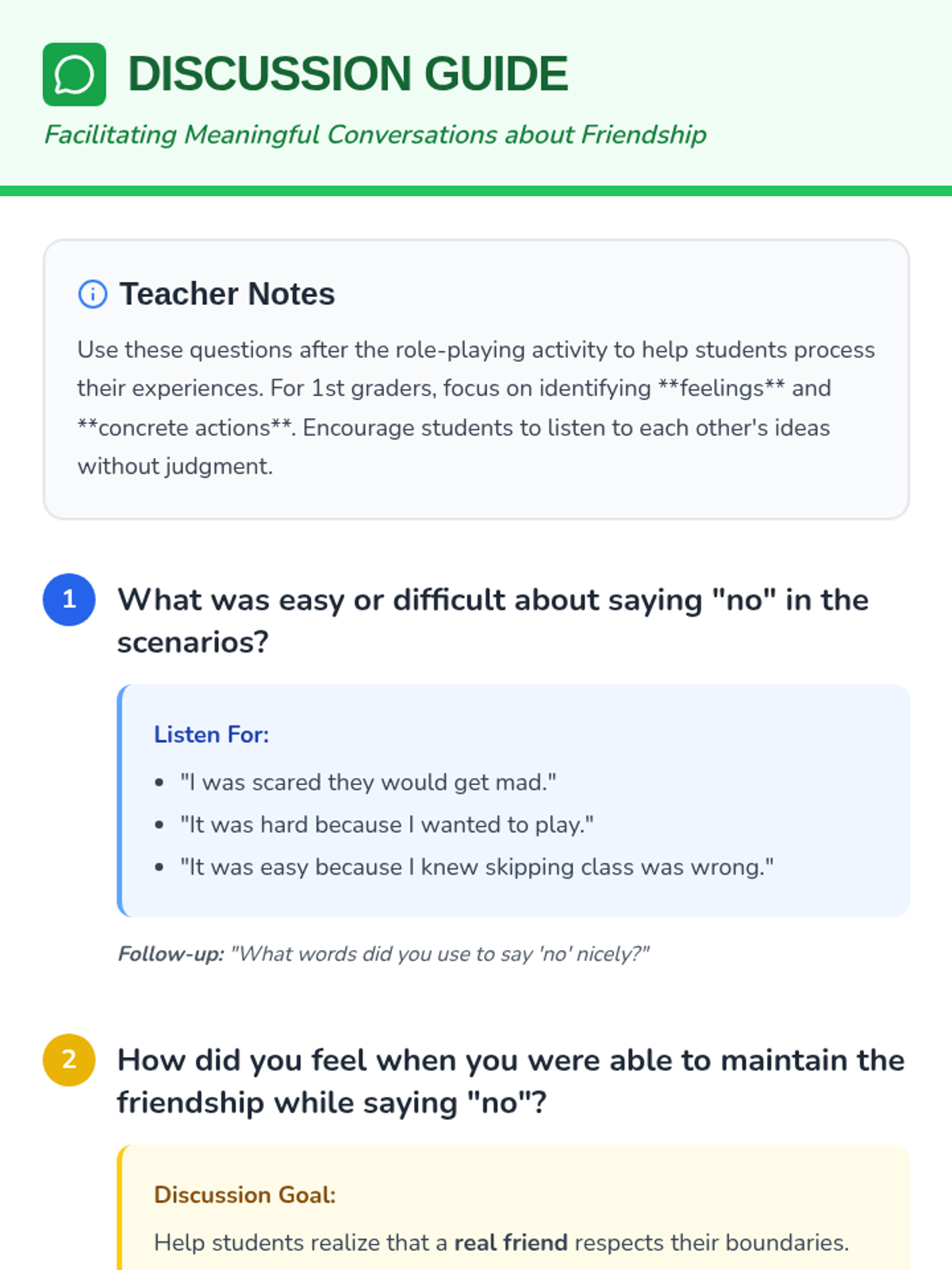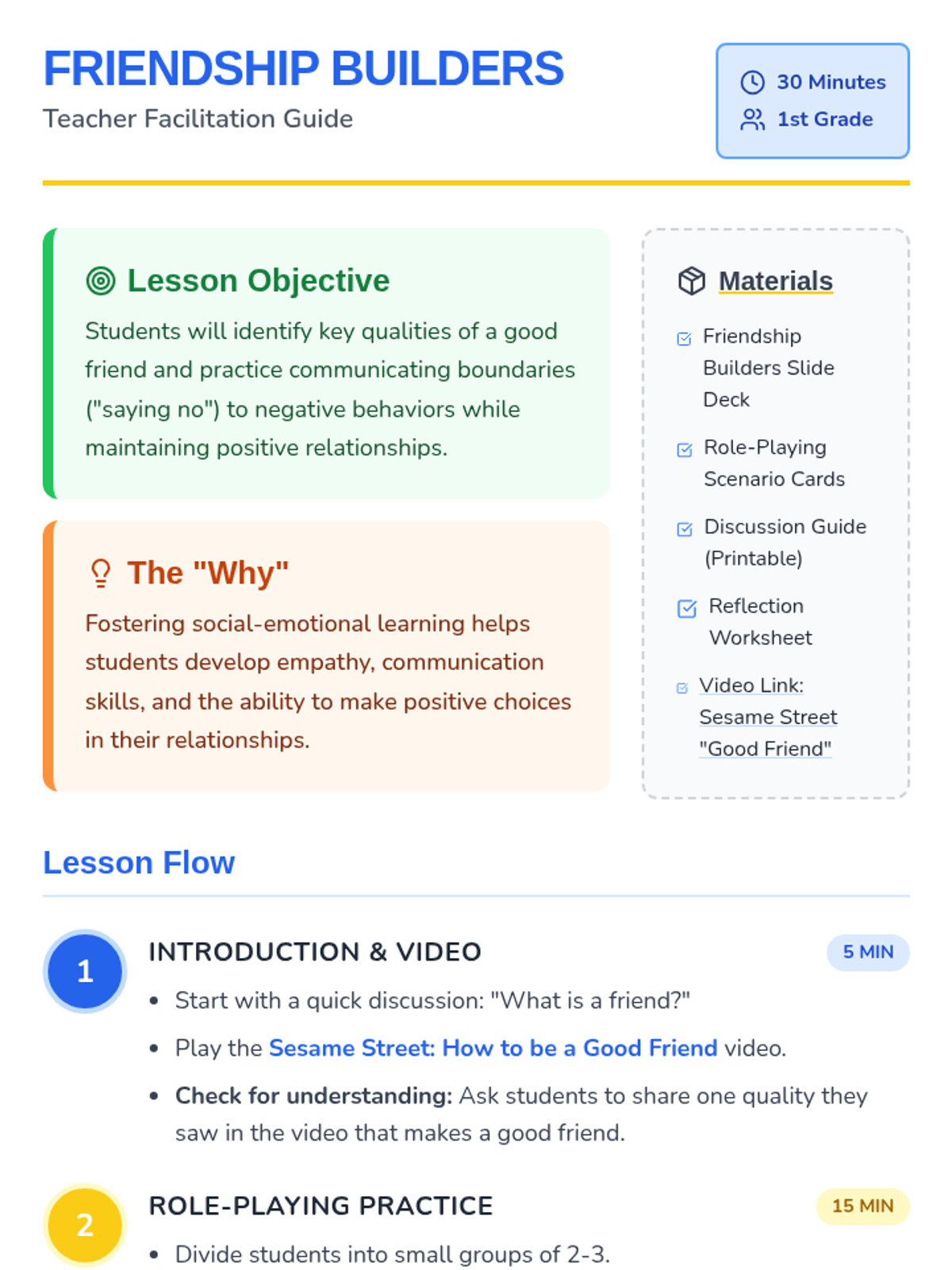 A 1st-grade lesson on friendship qualities and navigating peer pressure through role-play and reflection.