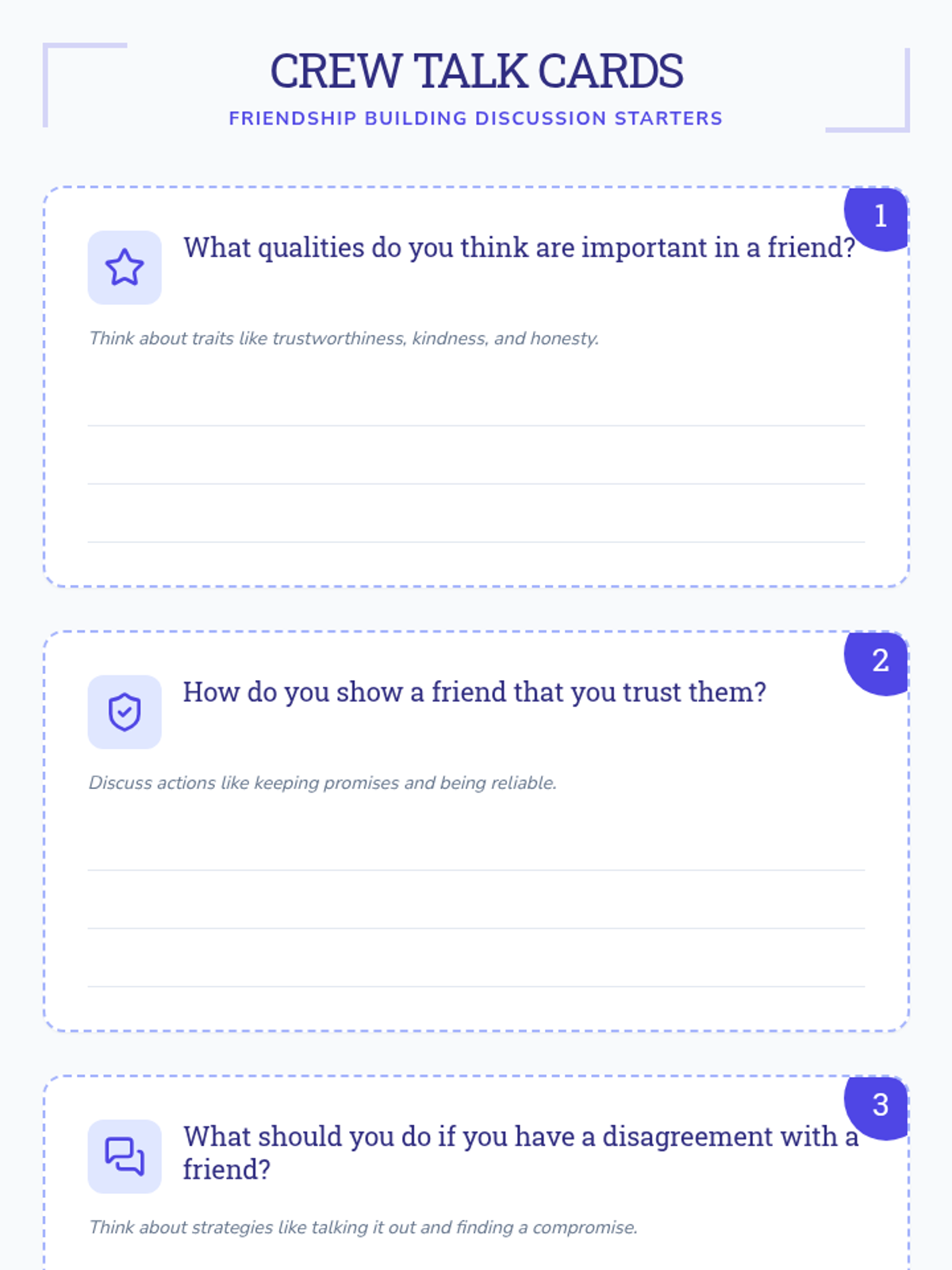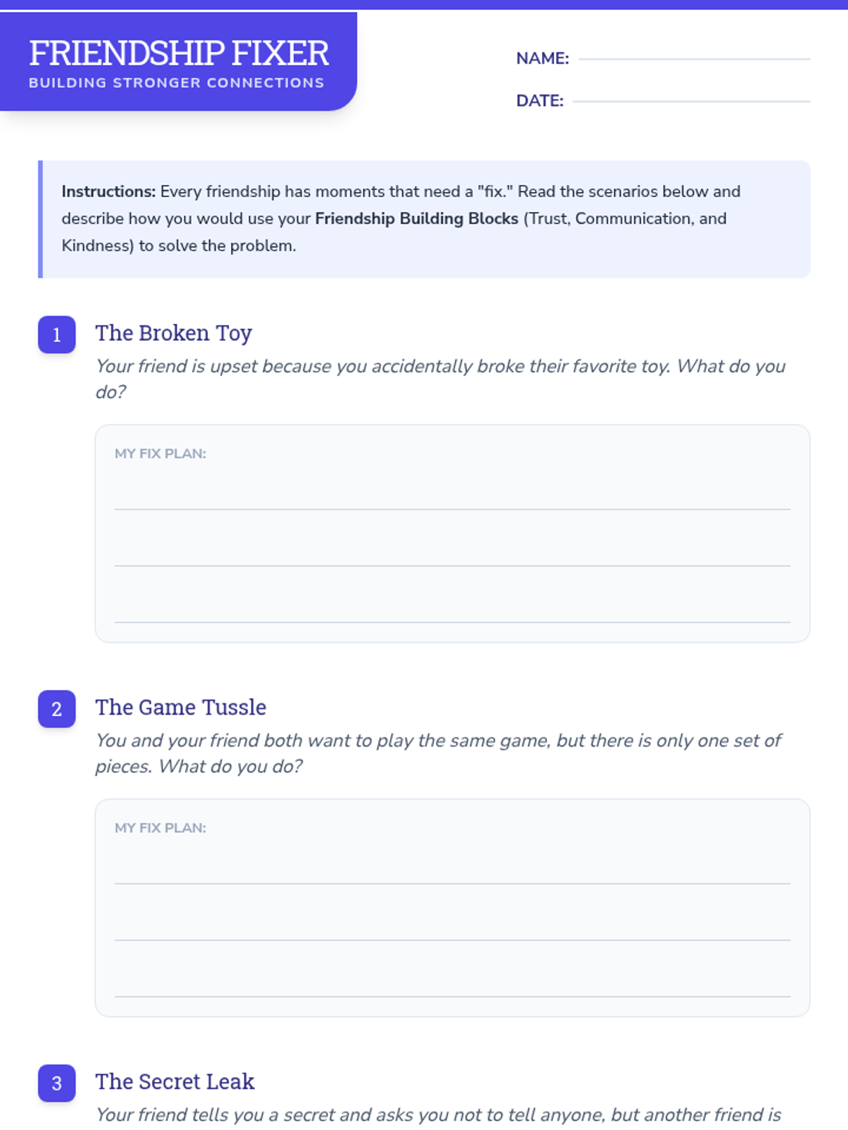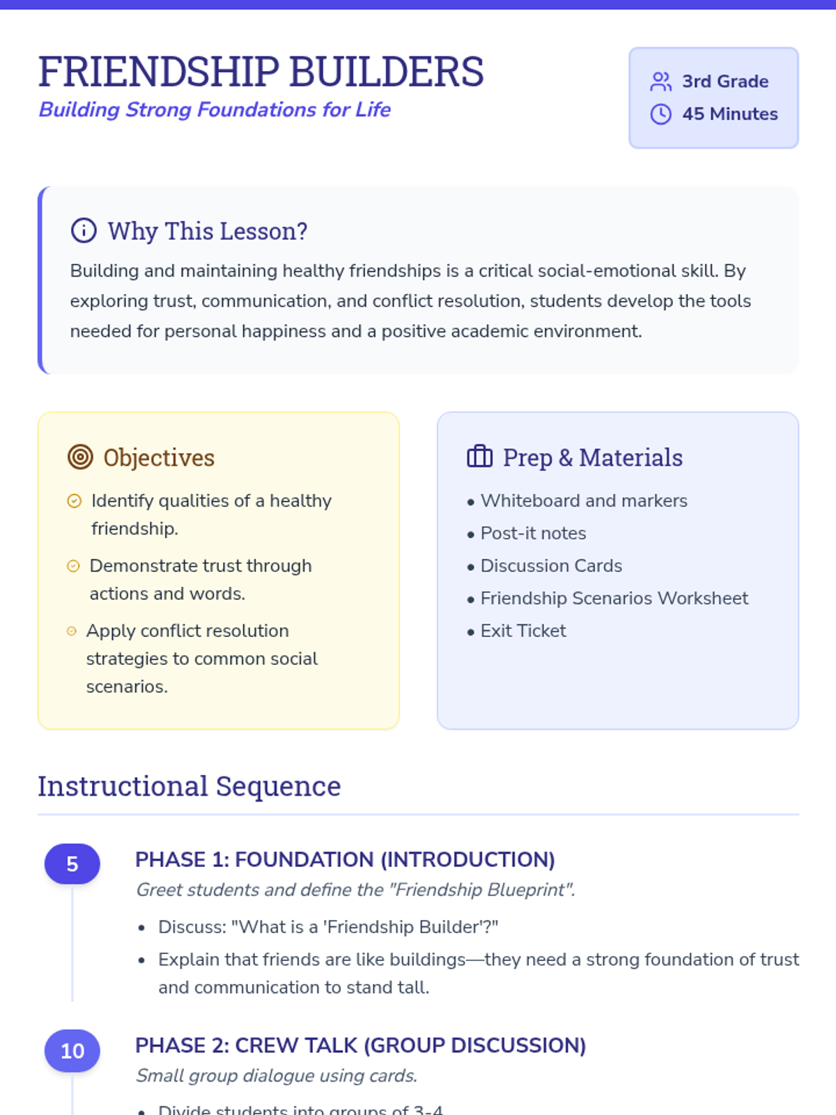 This lesson teaches 3rd-grade students how to build and maintain healthy friendships through discussions, scenario-based problem solving, and role-playing. Students explore core values like trust, communication, and conflict resolution to develop essential social-emotional skills.