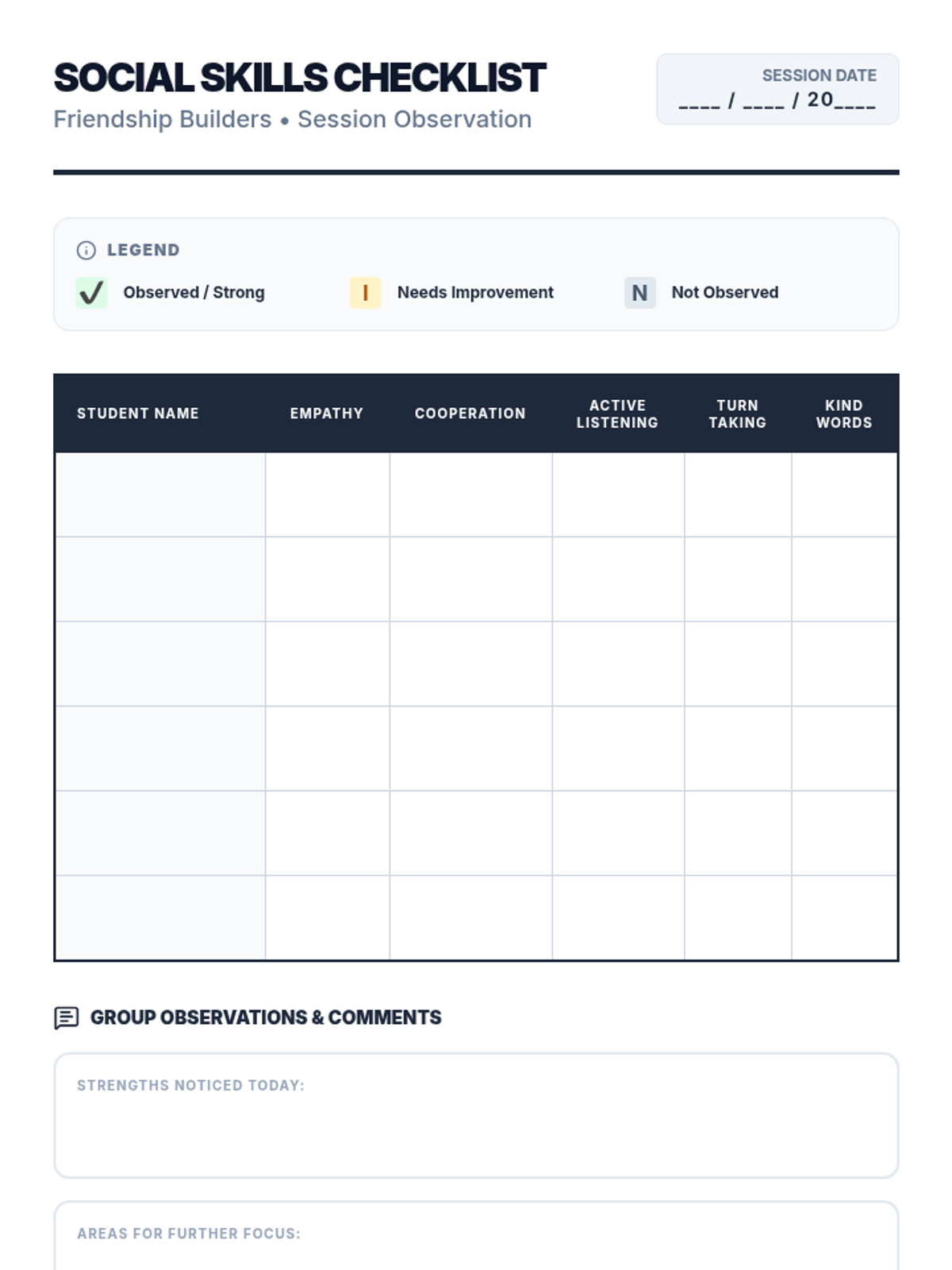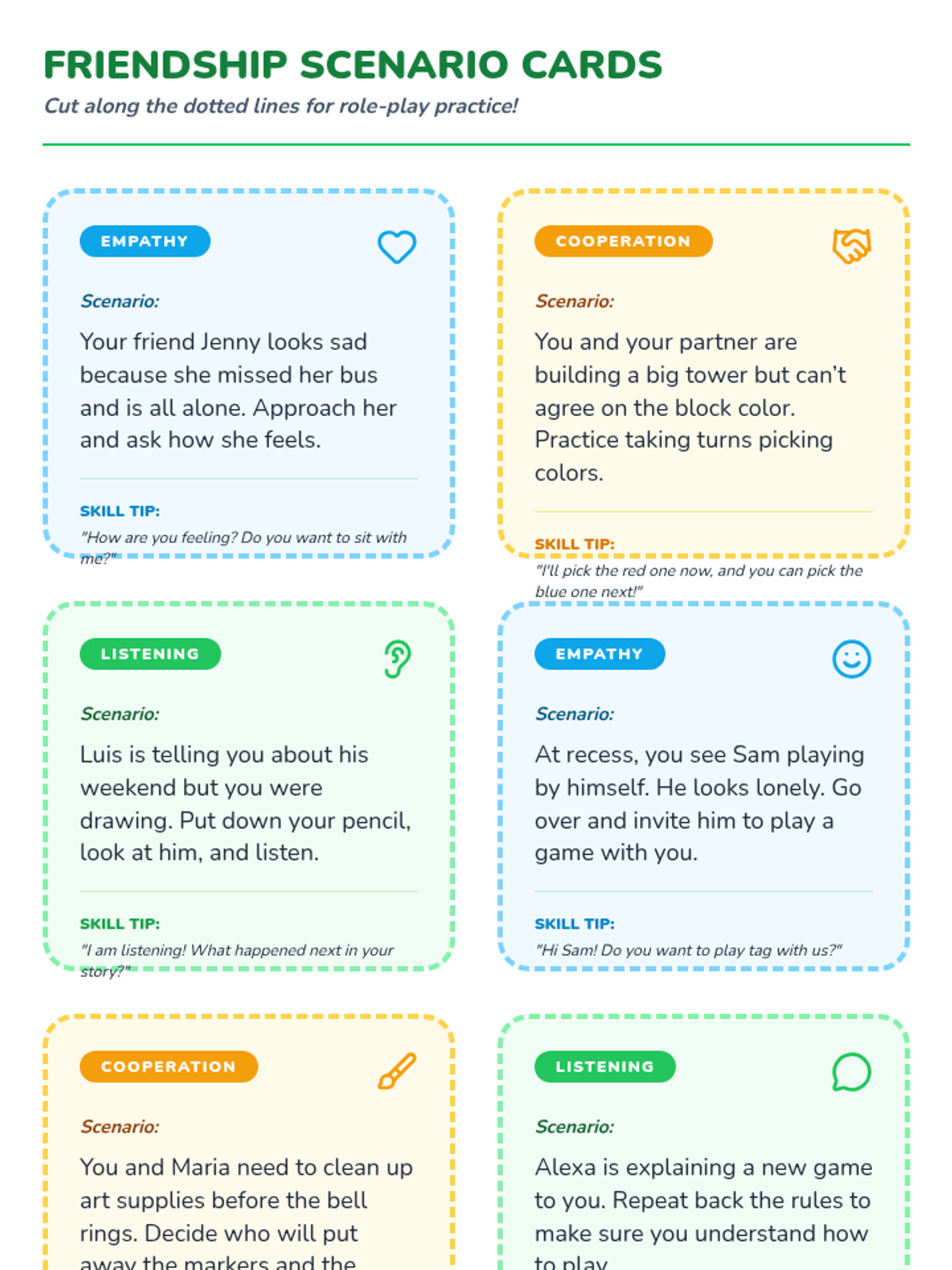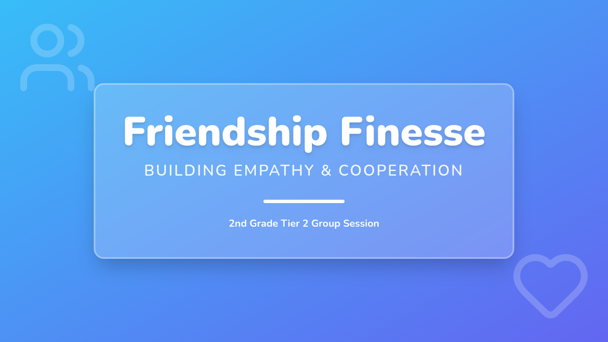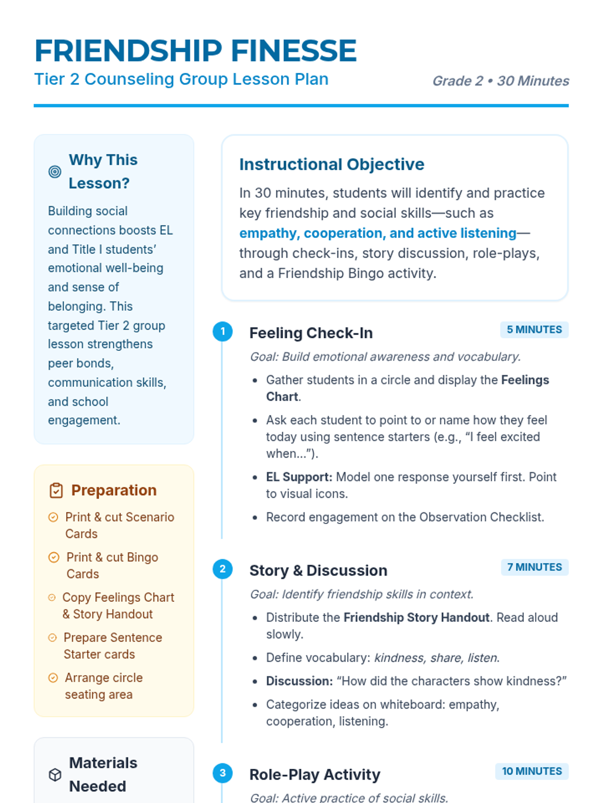 A 30-minute Tier 2 counseling group session for 2nd-grade students focusing on empathy, cooperation, and active listening. Students engage in role-play, story discussion, and a social bingo game to strengthen peer bonds.