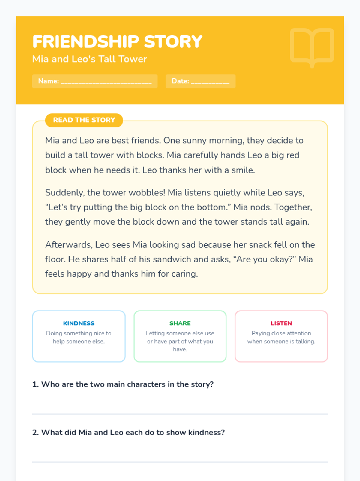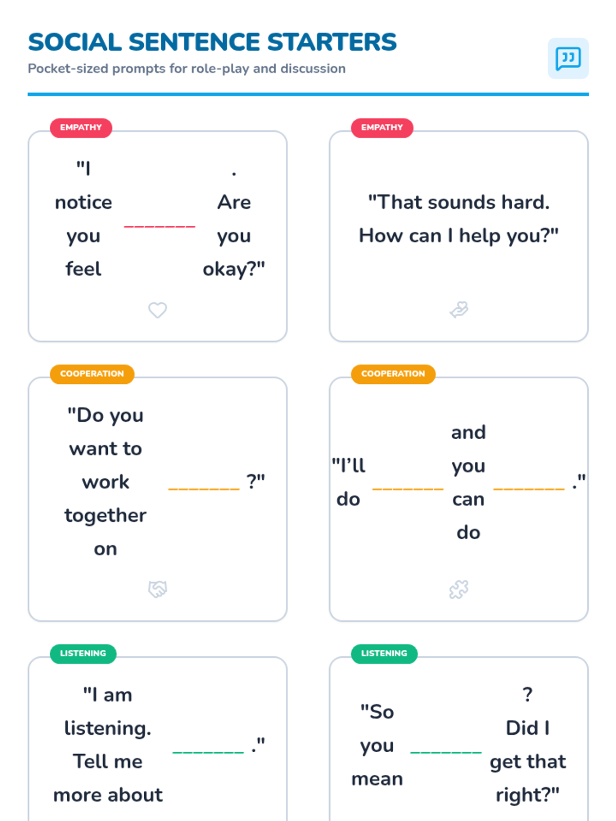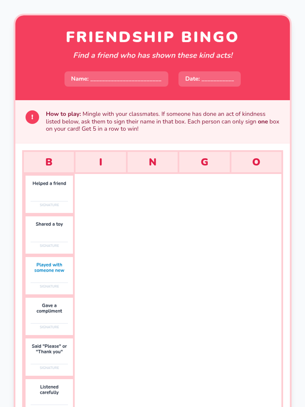 A 30-minute Tier 2 counseling group session for 2nd-grade students focusing on empathy, cooperation, and active listening. Students engage in role-play, story discussion, and a social bingo game to strengthen peer bonds.