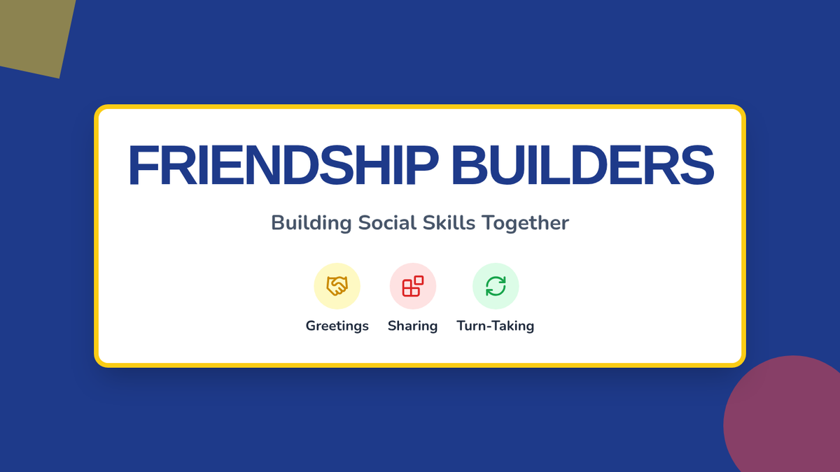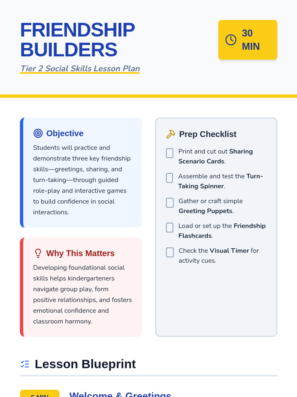 A 30-minute Tier 2 small-group lesson for kindergarteners focused on foundational social skills like sharing, turn-taking, and greetings through interactive role-play and games.