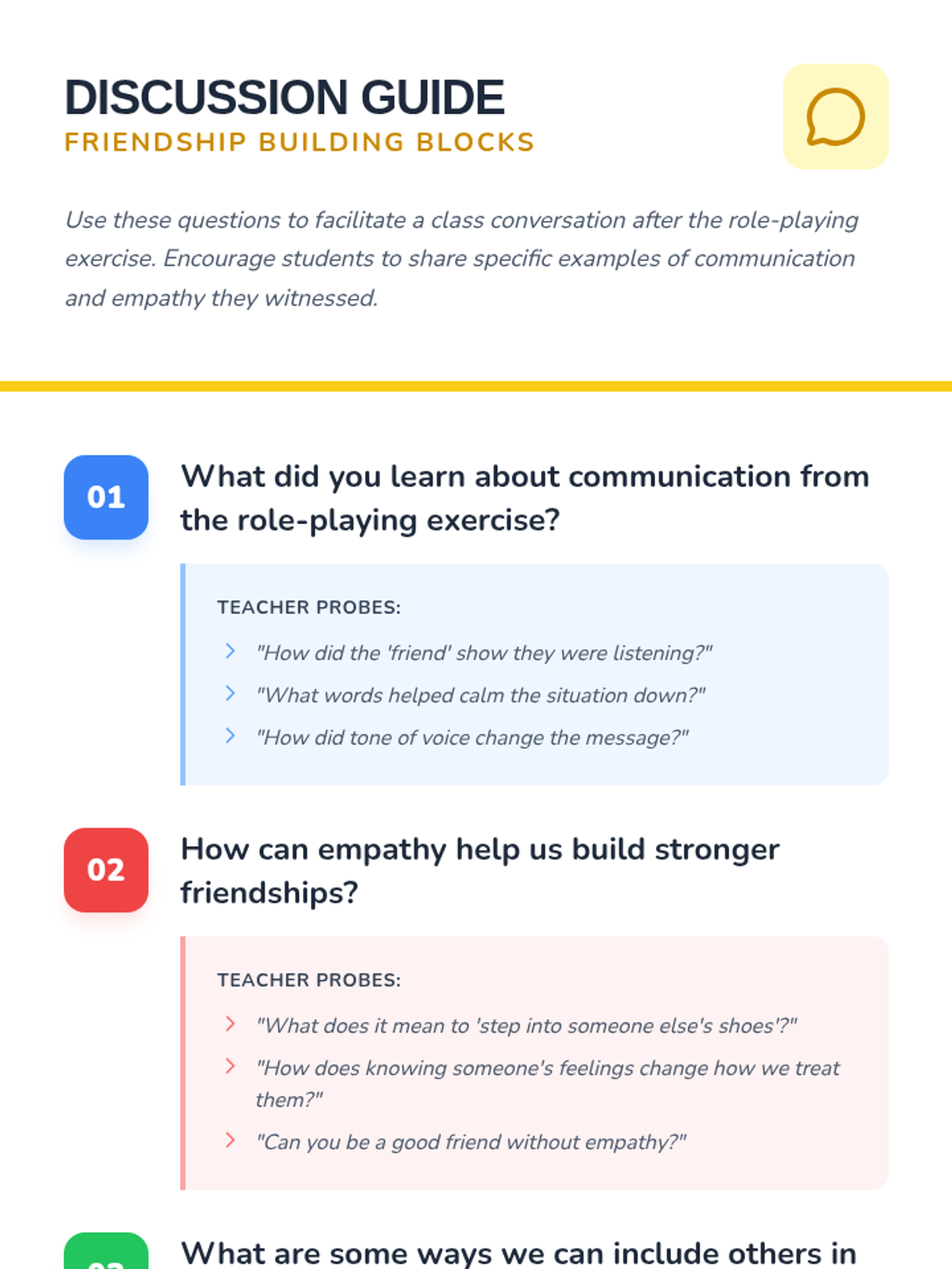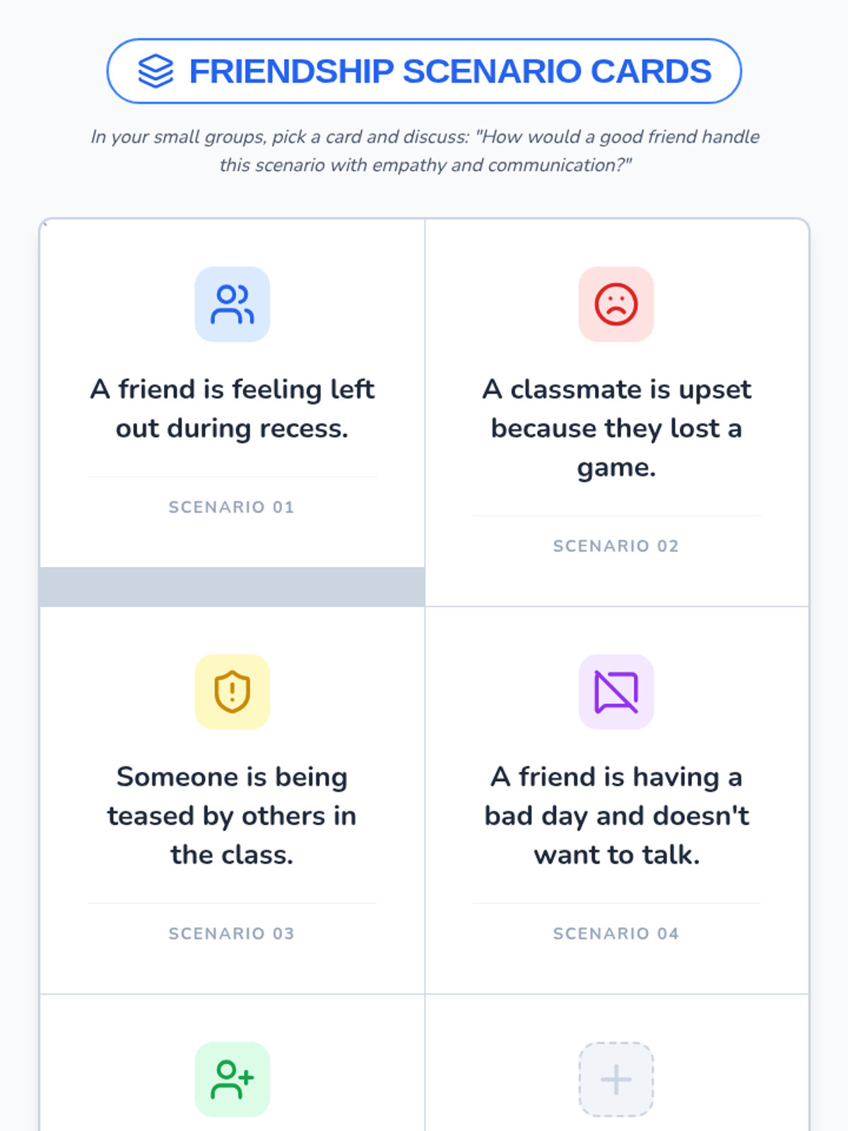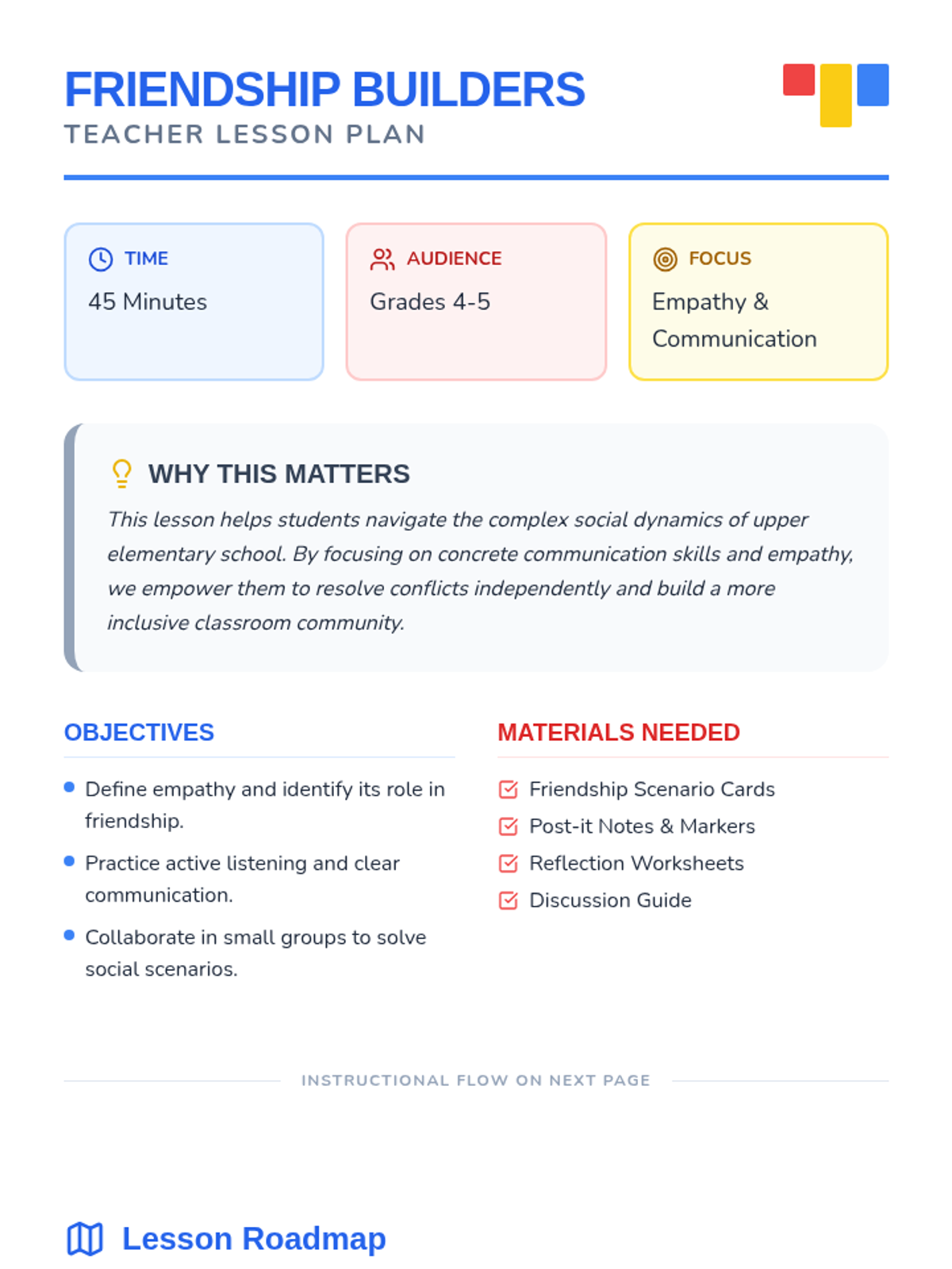 A lesson for 4th and 5th-grade students to explore friendship and teamwork through communication and empathy exercises. Students will engage in scenario-based role-playing and reflective writing to strengthen their peer relationships.