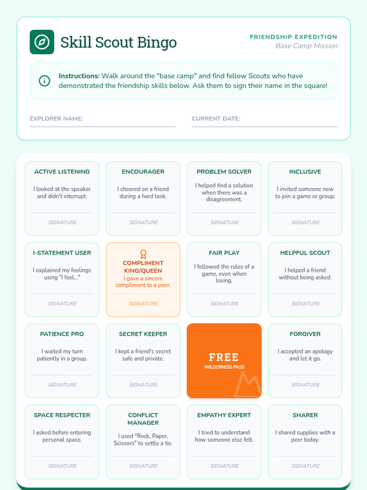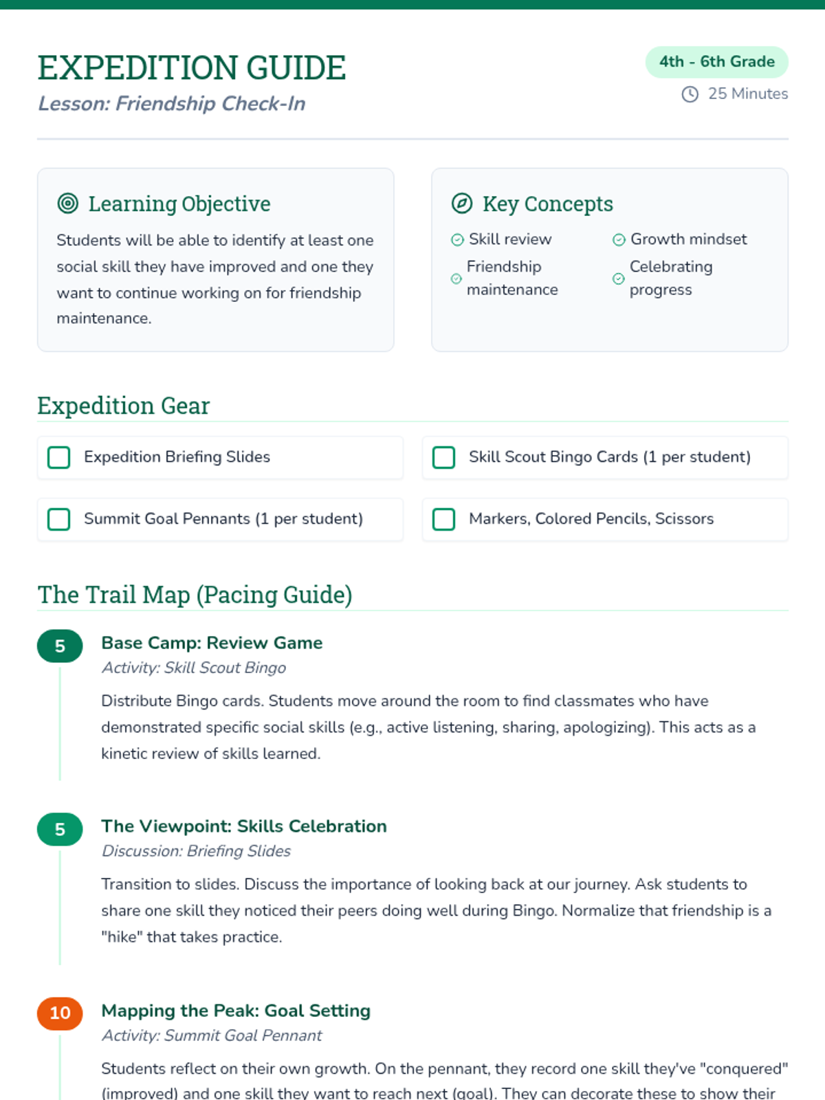 A 25-minute lesson focused on reflecting on social skill growth and setting new goals for friendship maintenance using a 'Friendship Expedition' theme.