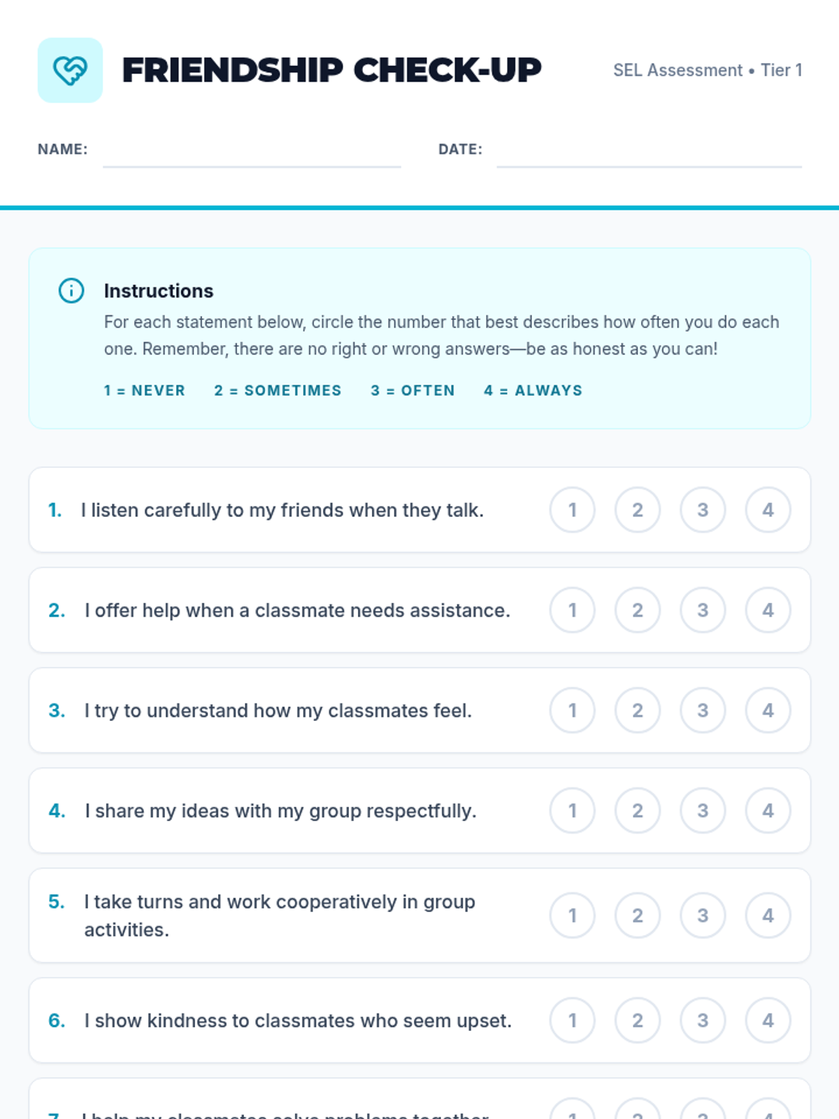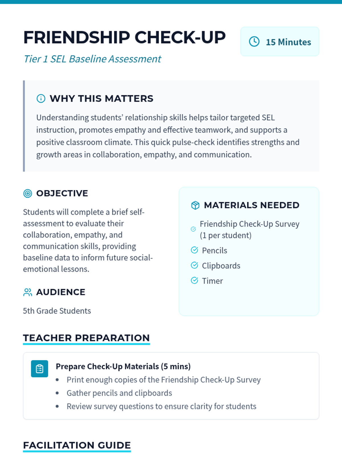 A quick 15-minute Tier 1 pre-test to gauge 5th graders’ relationship skills in collaboration, empathy, and communication, providing baseline data for future SEL lessons.