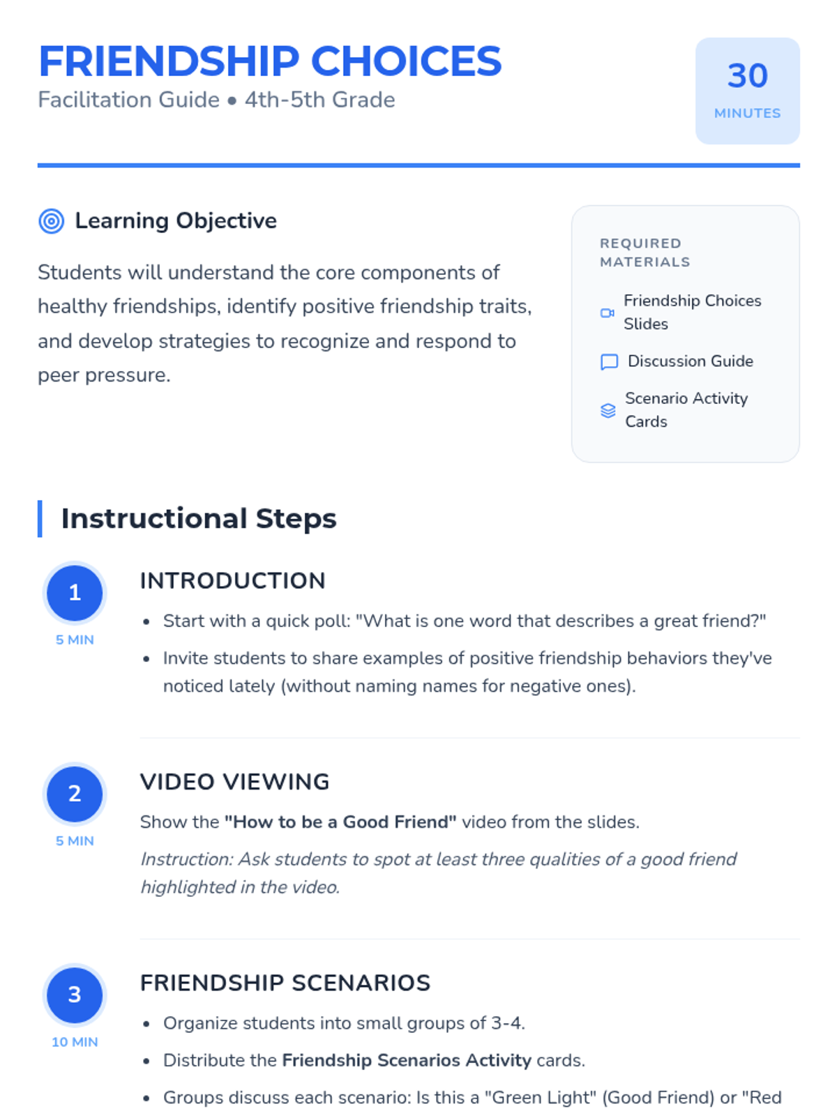 A lesson for 4th and 5th graders on identifying healthy friendship traits, navigating peer pressure, and making wise social choices through videos and interactive scenarios.