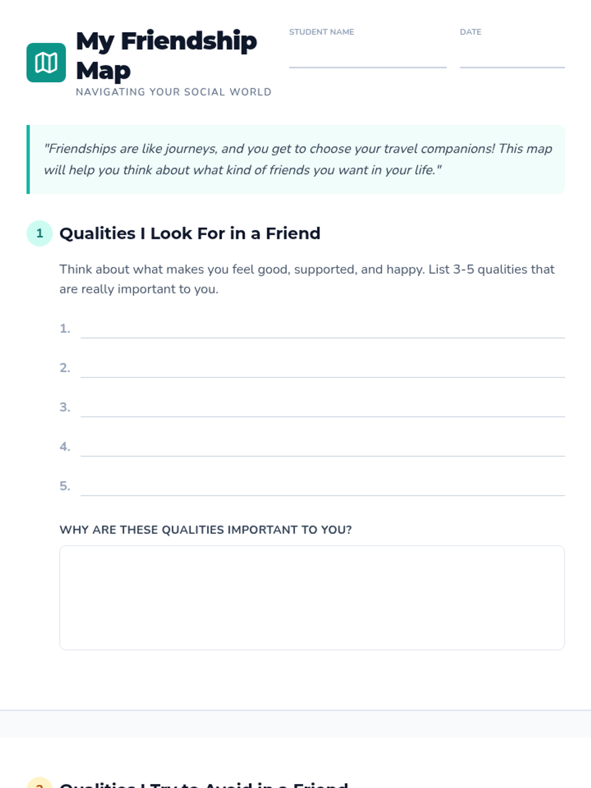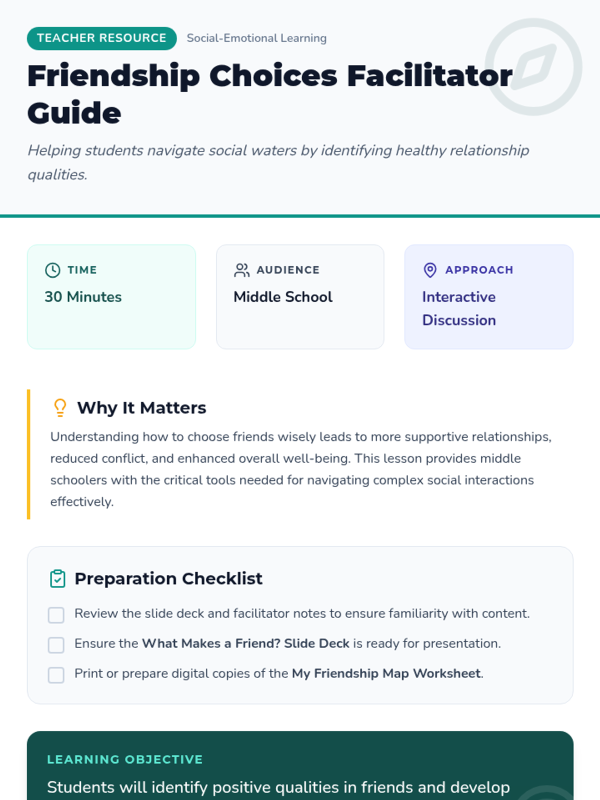 A 30-minute lesson for middle school students to explore healthy friendship qualities and develop personal criteria for choosing supportive friends through discussion and a mapping activity.