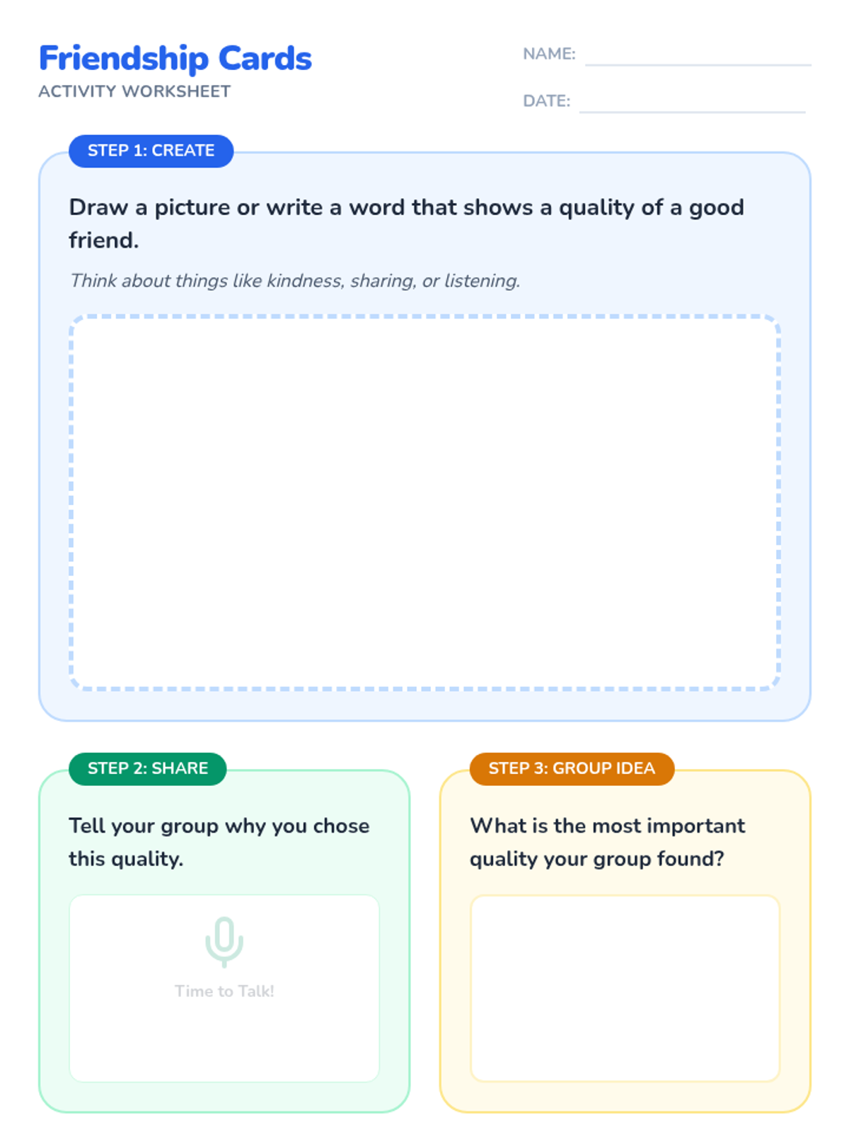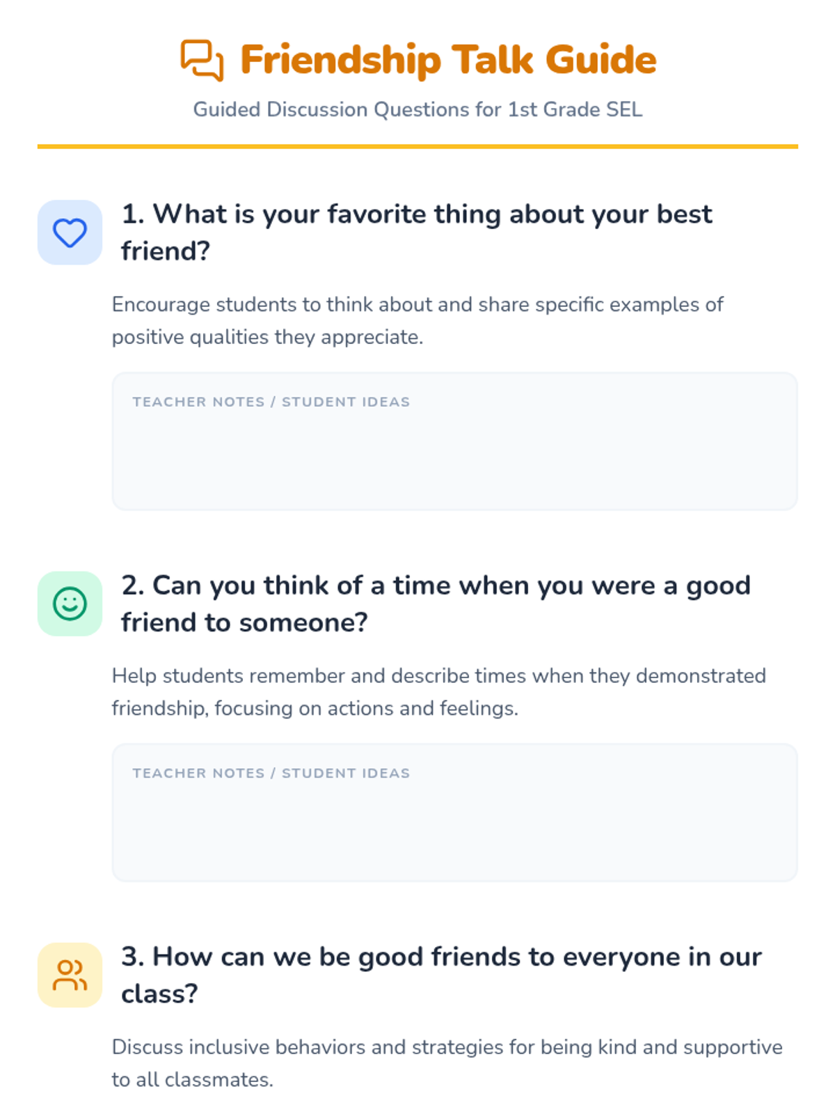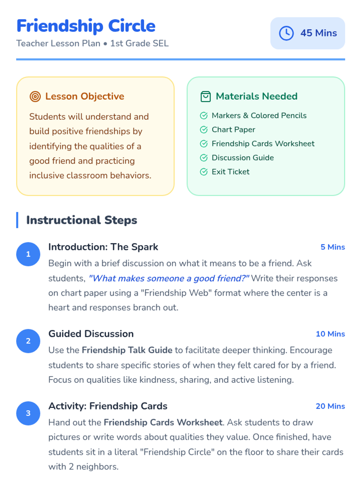 A social-emotional learning lesson for 1st graders focused on identifying qualities of good friends and practicing inclusive behaviors through discussion and creative activities.