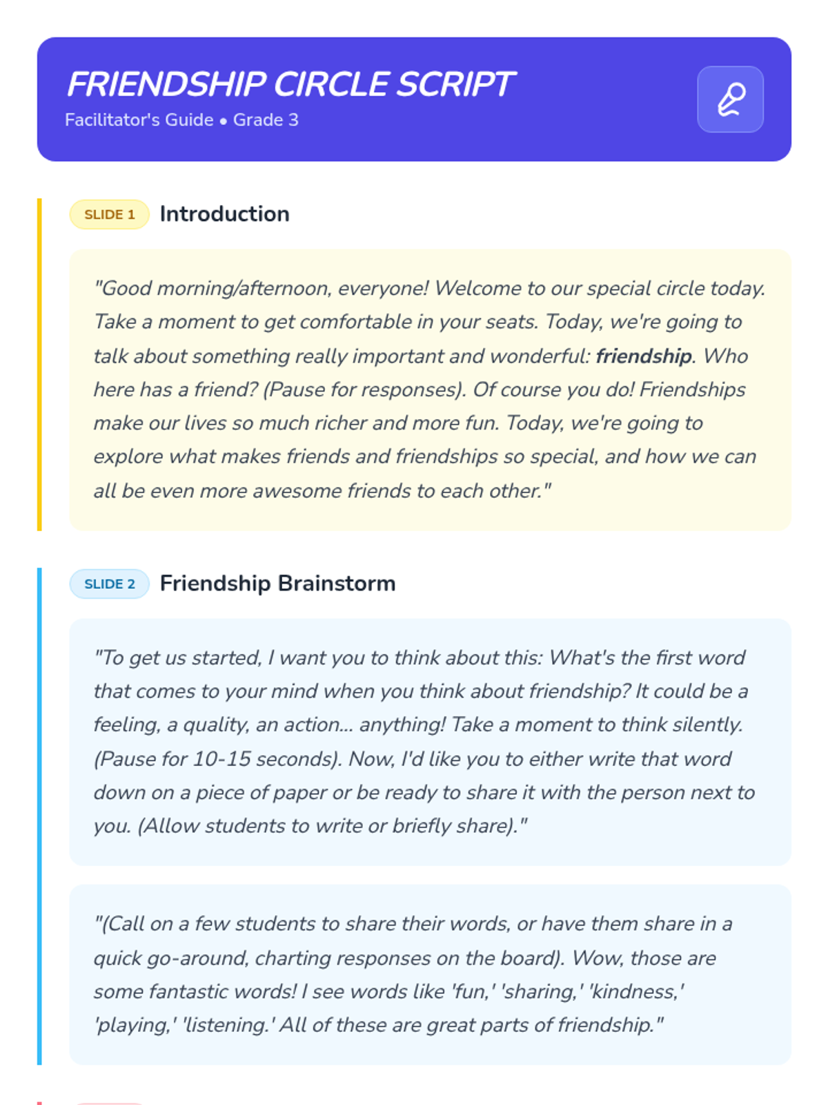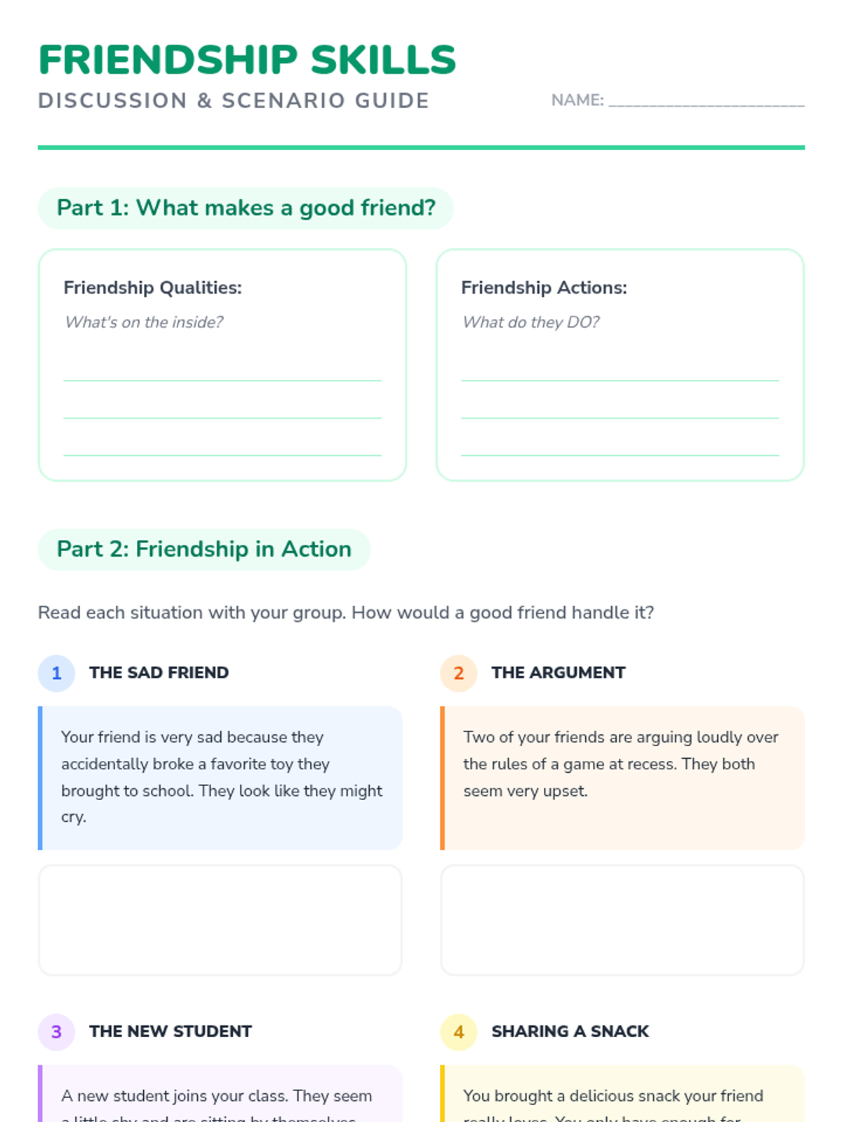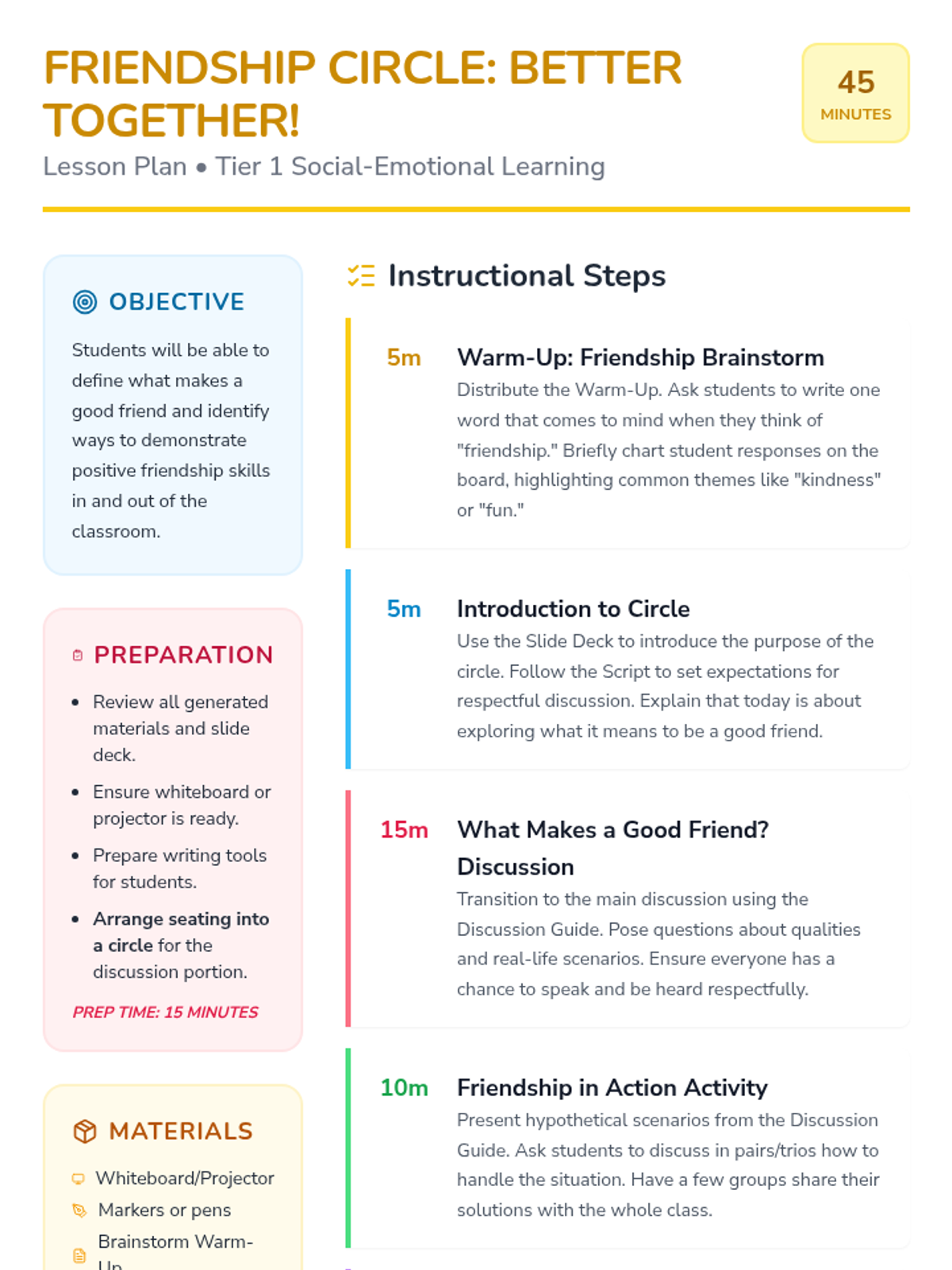 A 45-minute Tier 1 lesson for 3rd graders focused on defining qualities of a good friend and practicing positive social skills through a circle discussion and reflective activities.