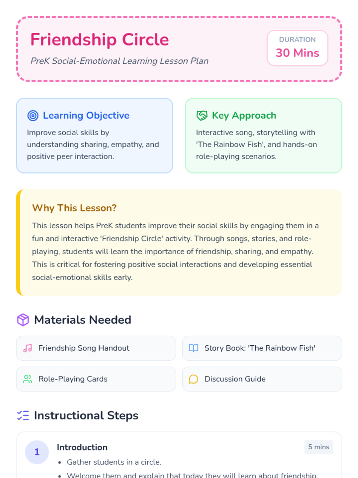 A PreK lesson focused on social-emotional learning through songs, storytelling, and role-playing to teach sharing, empathy, and positive social interactions.