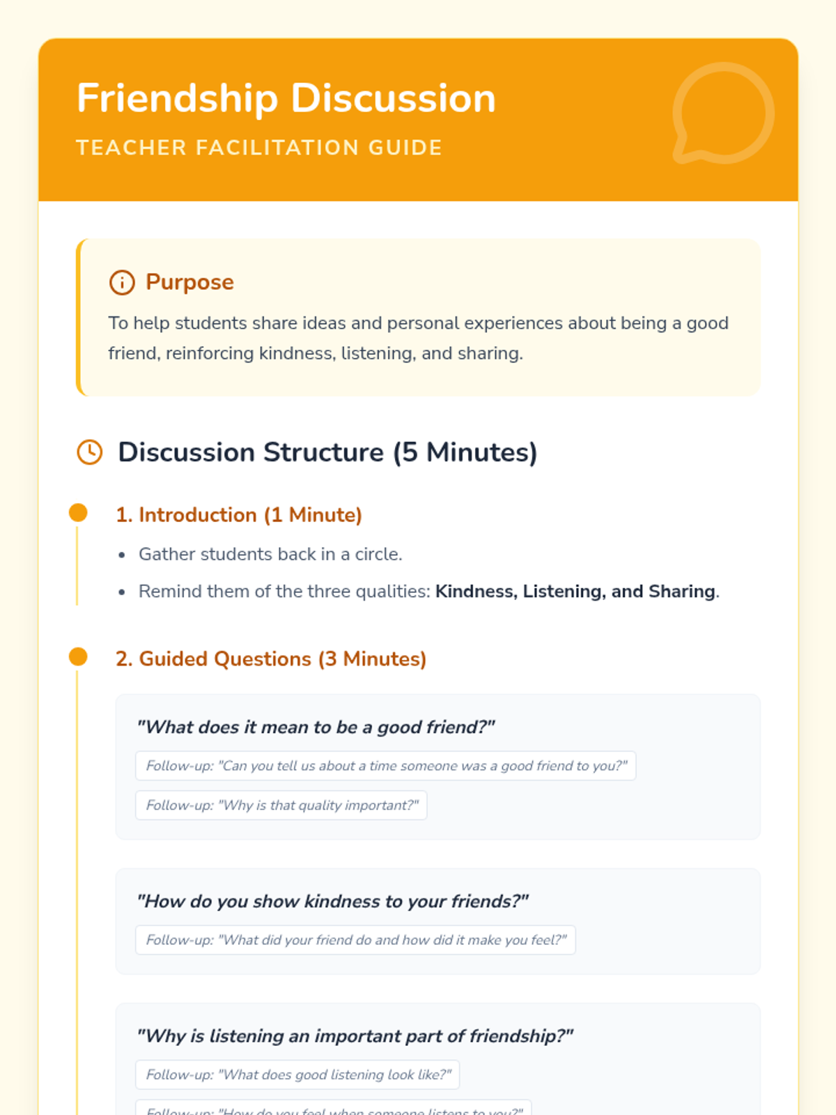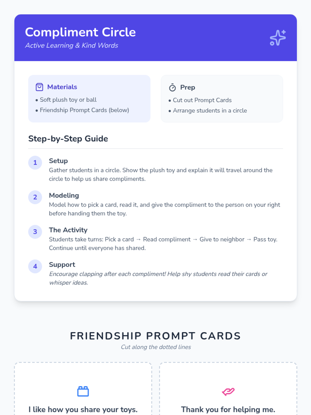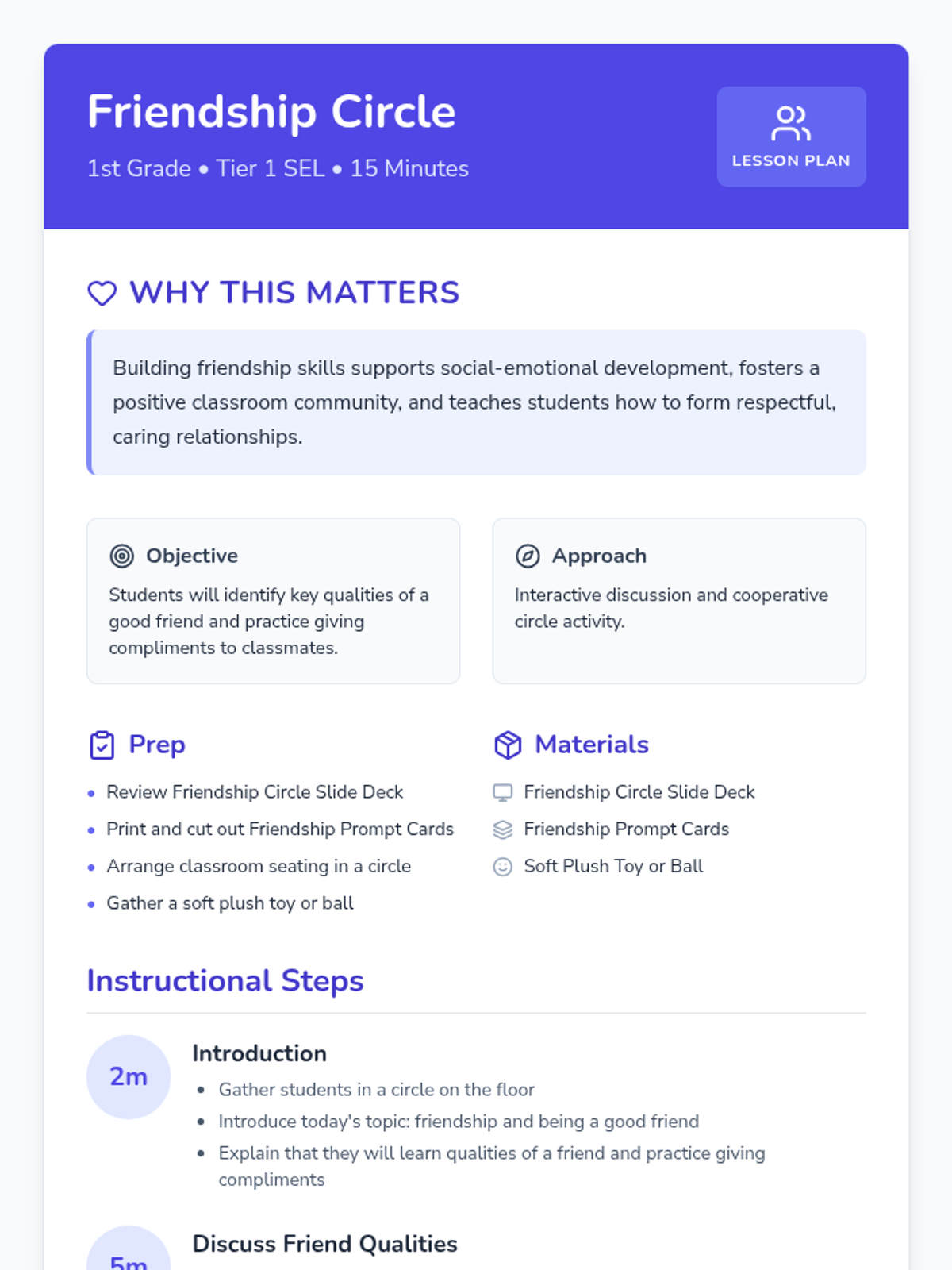 A 15-minute Tier 1 SEL lesson for 1st graders focused on identifying friendship qualities and practicing kindness through a compliment circle. Students will explore concepts of kindness, listening, and sharing to build a positive classroom community.
