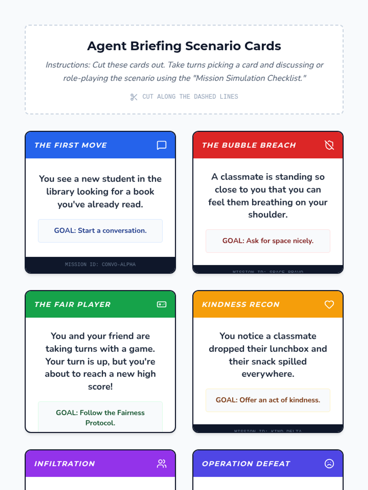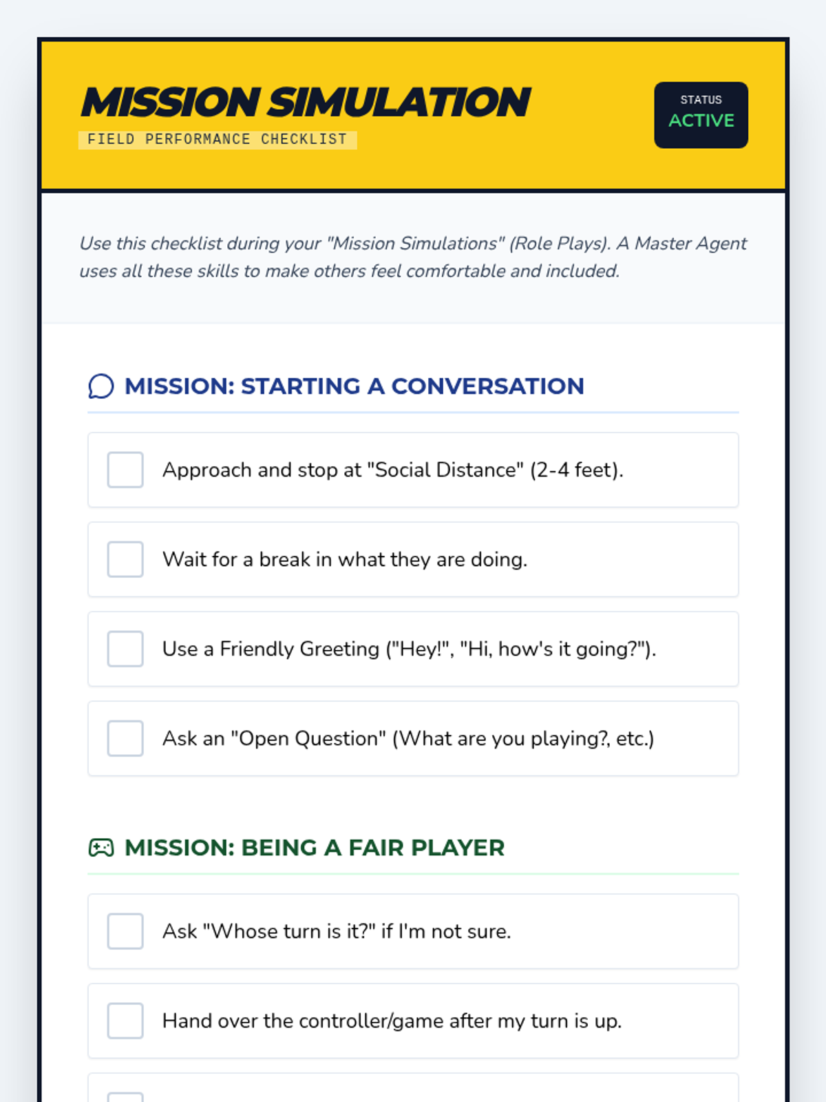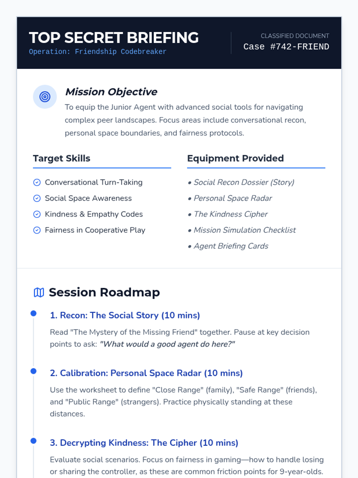 A secret agent themed therapy session focusing on friendship skills including conversation, kindness, fairness, and personal space. Designed for an individual session with a 9-year-old boy.