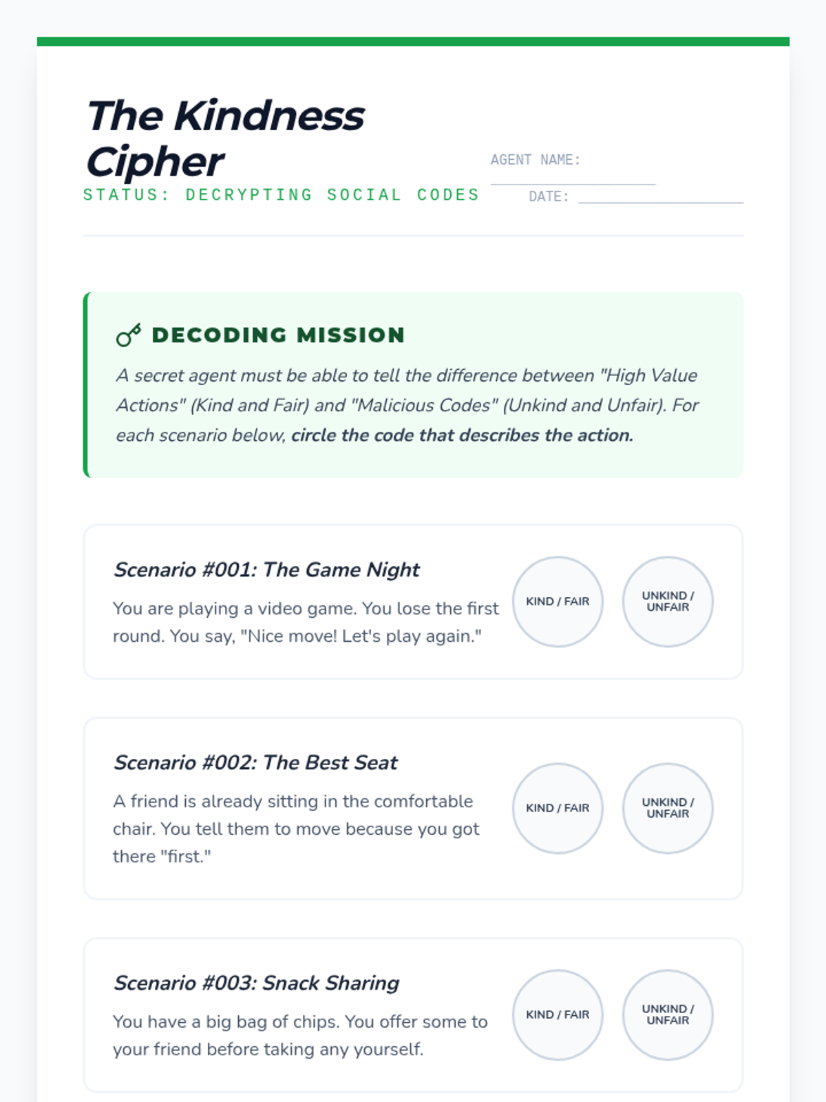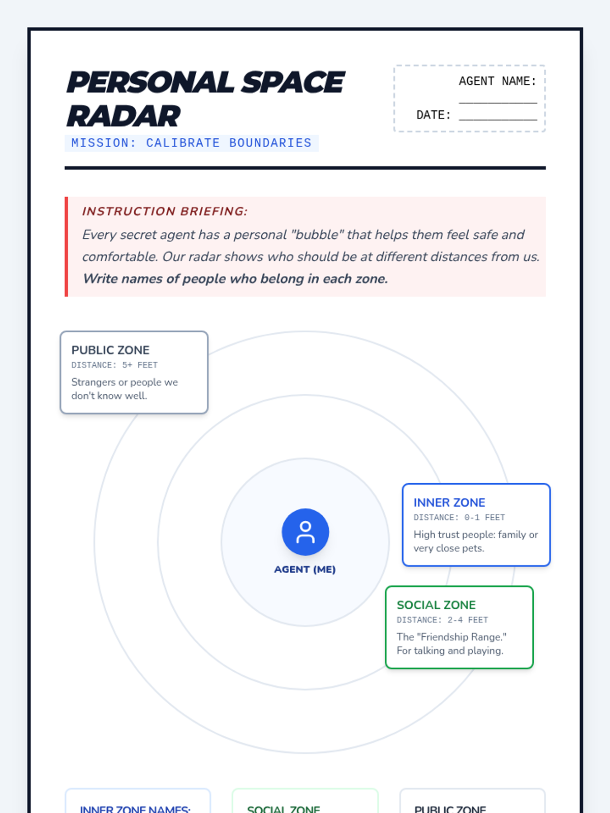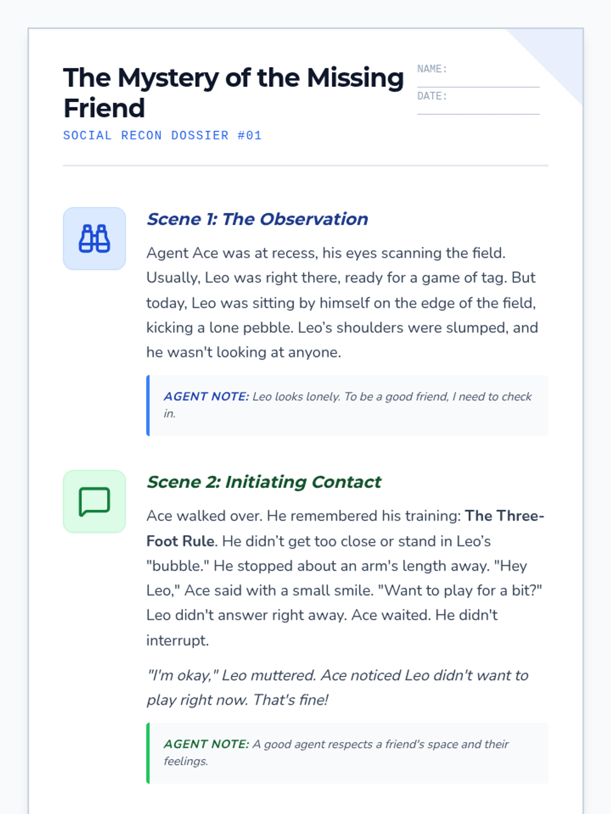 A secret agent themed therapy session focusing on friendship skills including conversation, kindness, fairness, and personal space. Designed for an individual session with a 9-year-old boy.