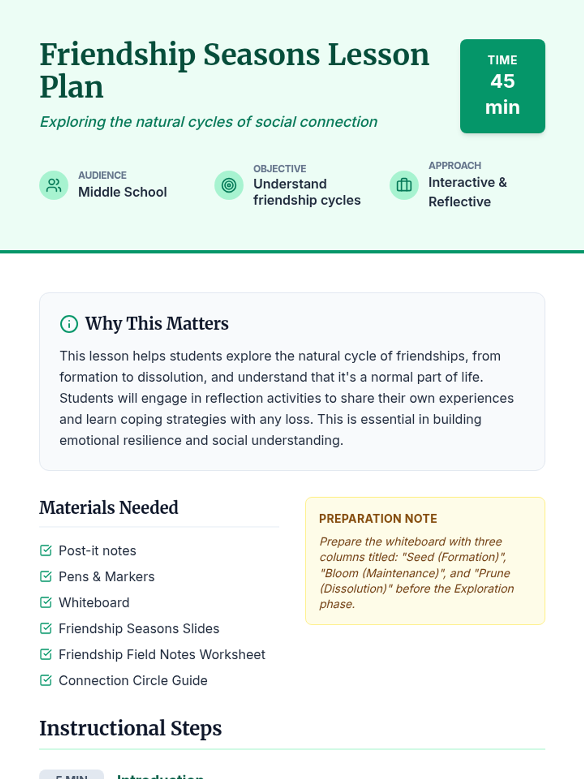 This lesson explores the natural cycle of friendships—formation, maintenance, and dissolution—to help middle school students build emotional resilience and understand that social changes are a normal part of life.