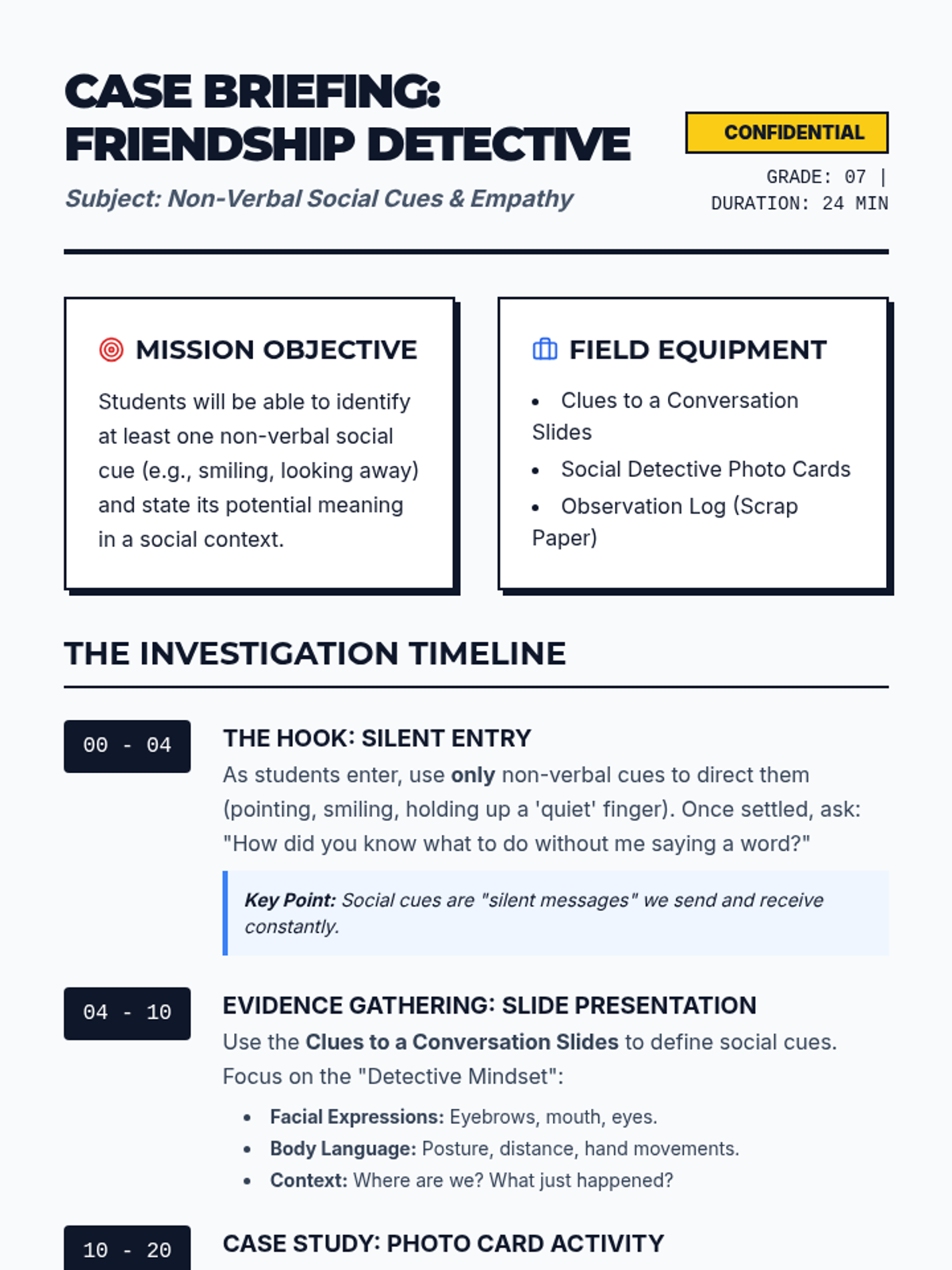 A 24-minute interactive lesson for 7th graders to become 'Social Detectives,' learning to decode non-verbal social cues and body language to build stronger friendships.
